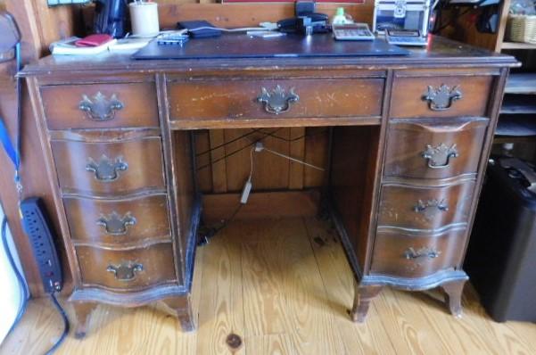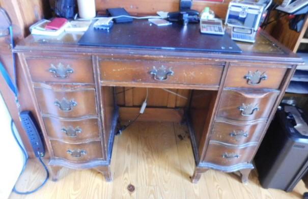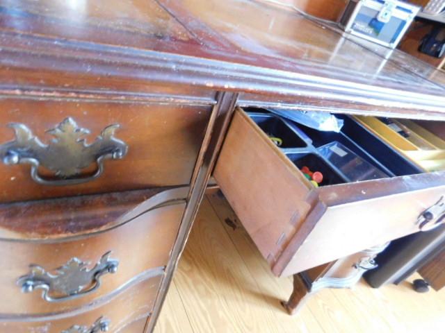 Antique Mahogany Leather Inlay Topped Desk with Serpentine Drawers has a terrific classical look. Needs some refinishing but a great find.