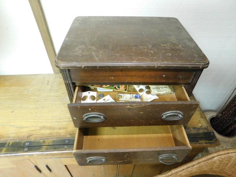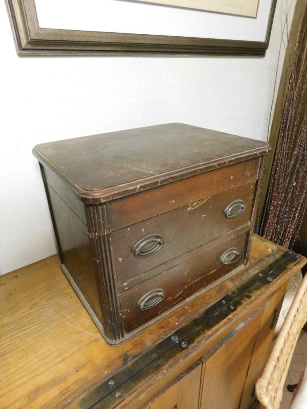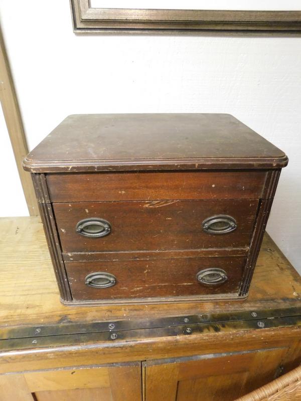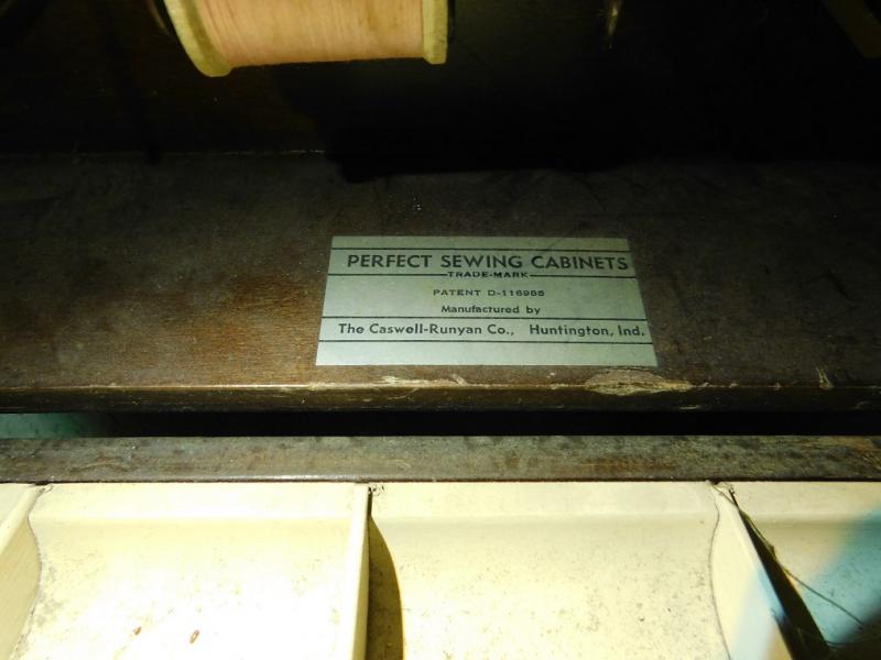 Antique mahogany Perfect Sewing Cabinet by Caswell-Runyan with bakelite inner drawer. Has scratches and wear on finish. Rare find.