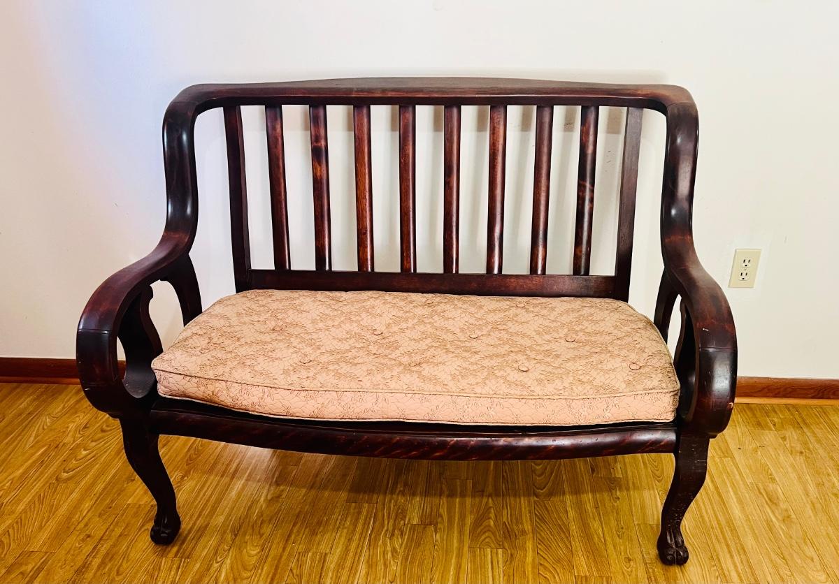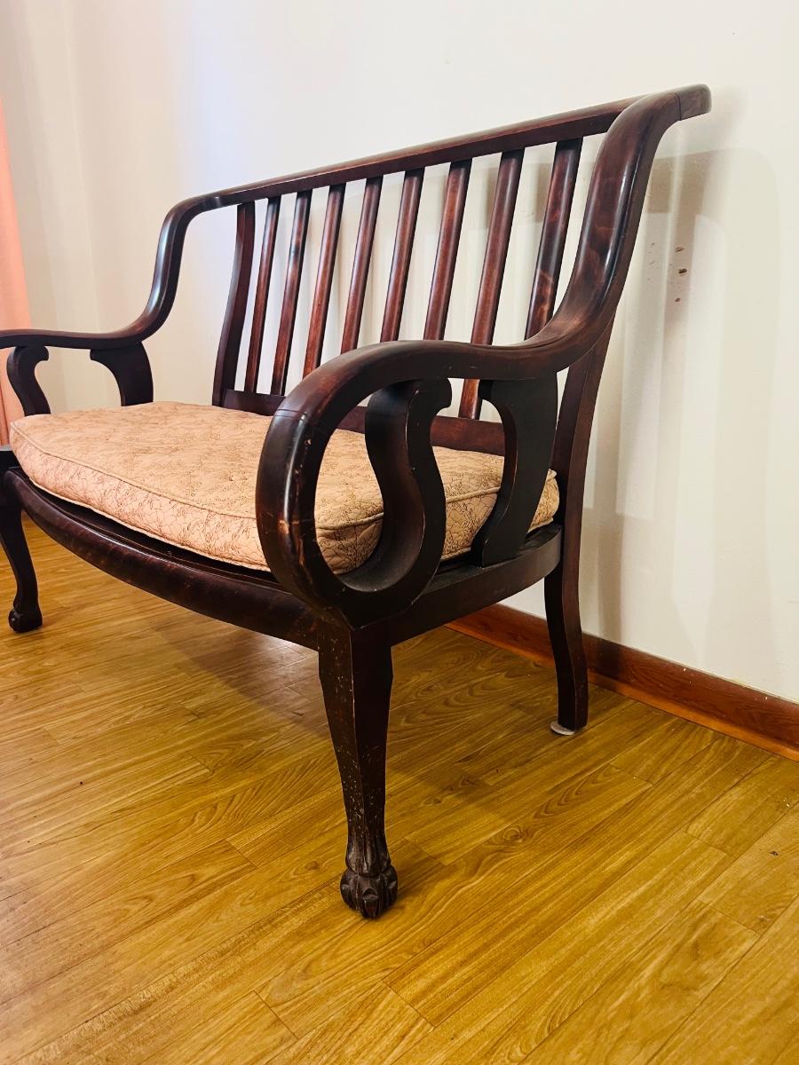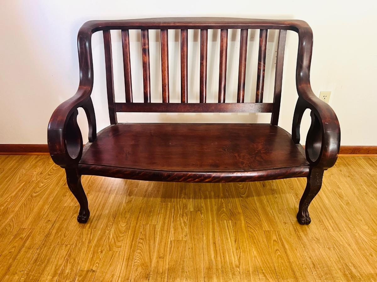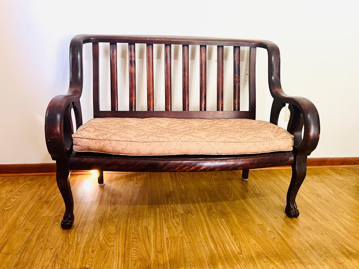 Antique Mahogany(?) Settee. This beauty i solid wood with detailed claw feet. Measures 36 inches tall, 47 inches wide and 25 inches deep. Floor to seat measures 17 1/2 inches tall.