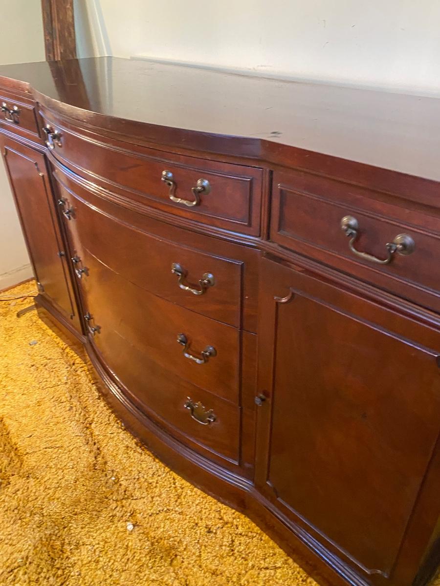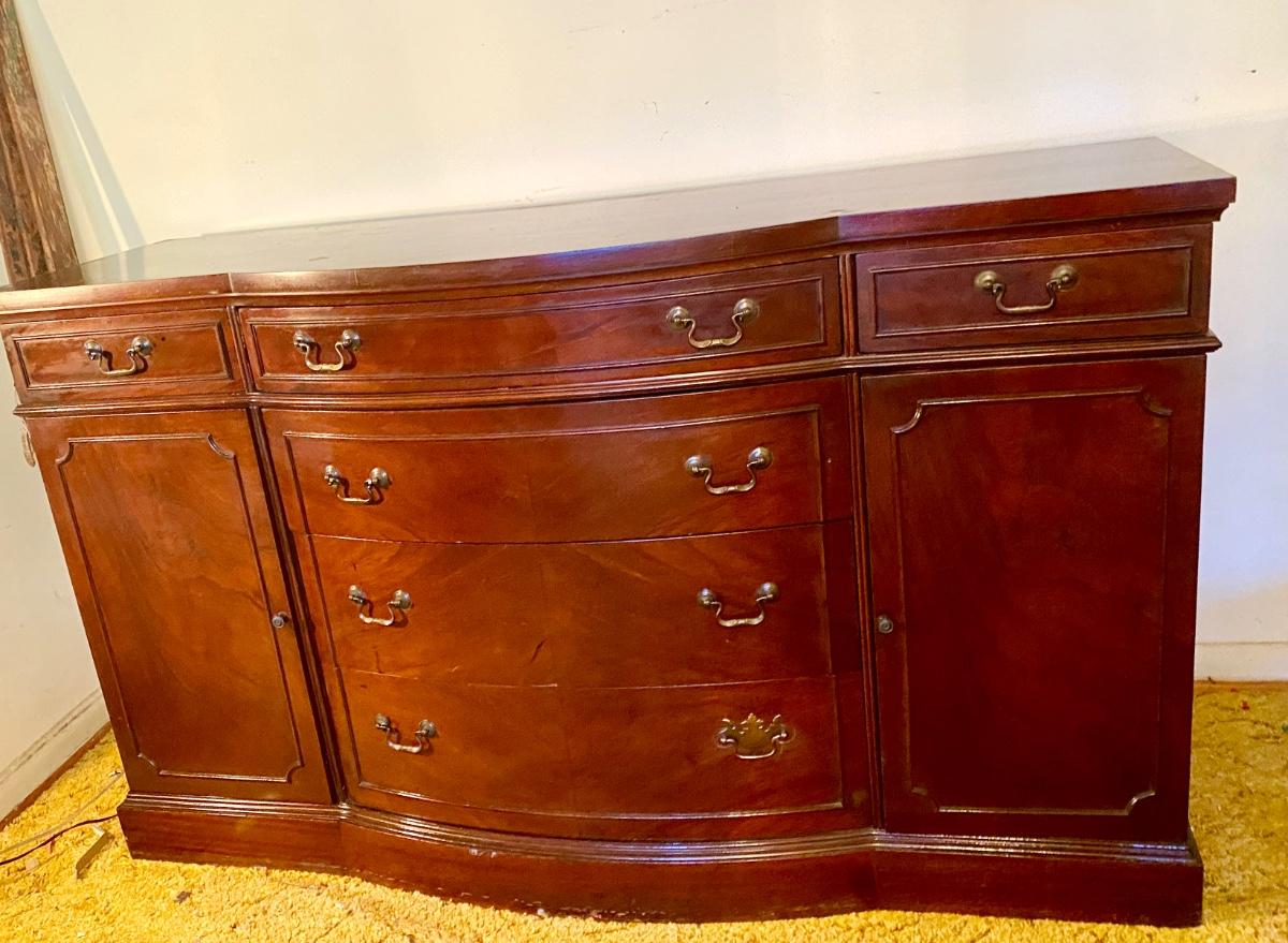 Lovely c. 1920 classical sideboard with bow front center with four drawers, two doors on either side,three drawers across top. Lovely crotch front grain, bead paneling on doors/drawers. Definite has some wear but easily polished up. Height 35 1/2 ", Width 60", and Depth 21"