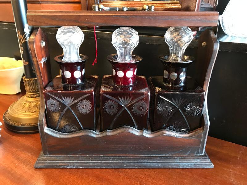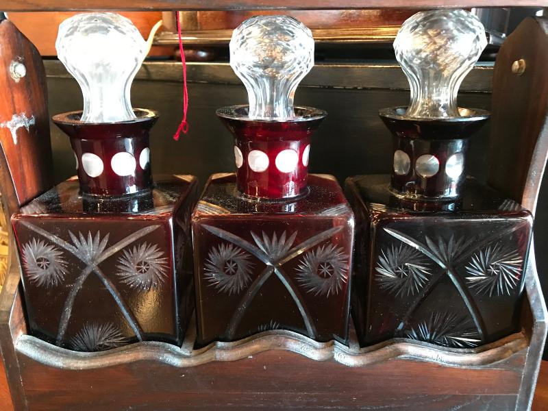 Lot 131-Antique Mahogany Tantalus with Ruby Cut to Clear Bottles