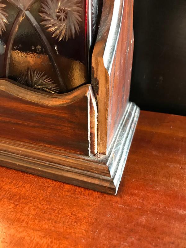 Lovely antique English Tantalus with tilting carrying handle to access the three ruby cut to clear crystal decanters. Each has a matching cut crystal stopper. Stopper is stuck in one bottle and one bottle has cracks in the neck. Tantalus frame has damage as seen in picture. Makes a beautiful decorative piece otherwise. 13 1/2" x 5 1/2" x 12" H