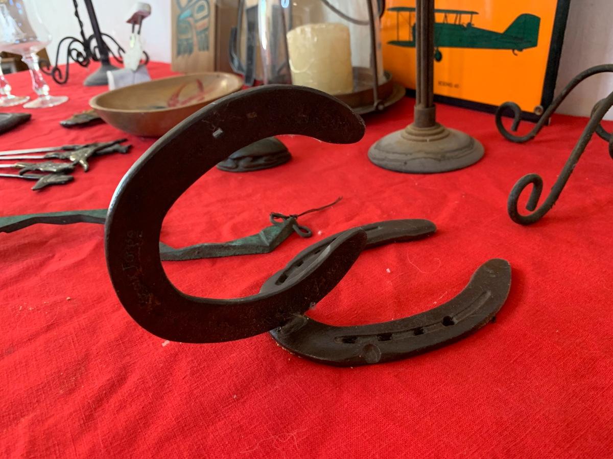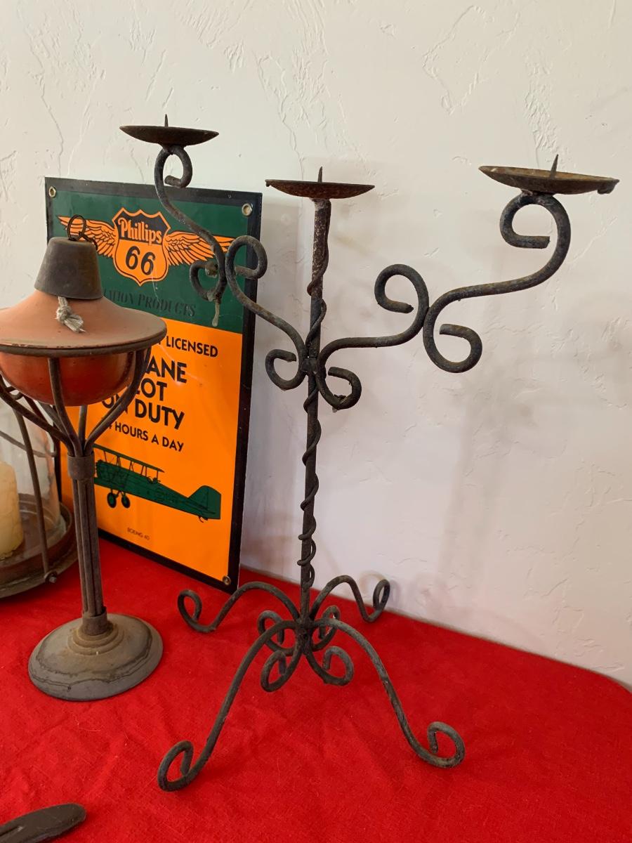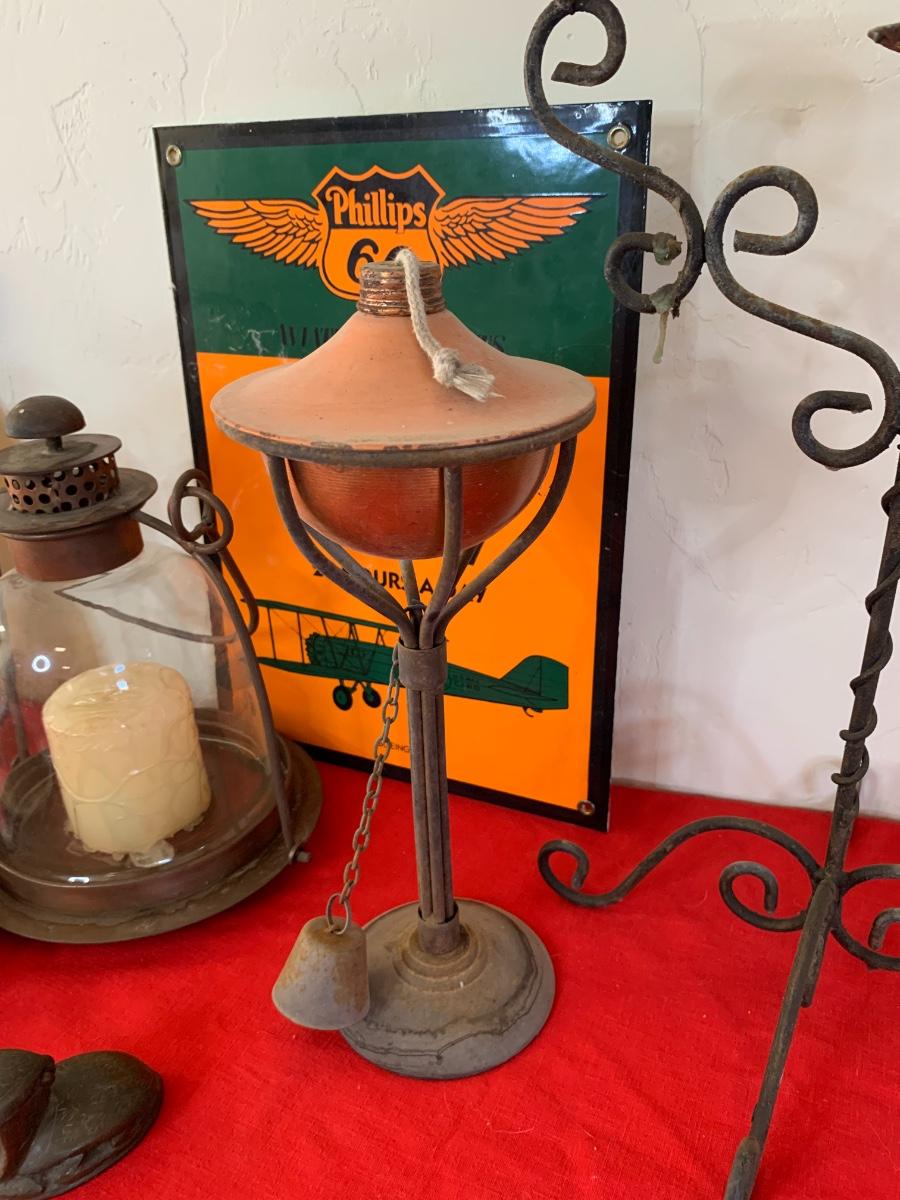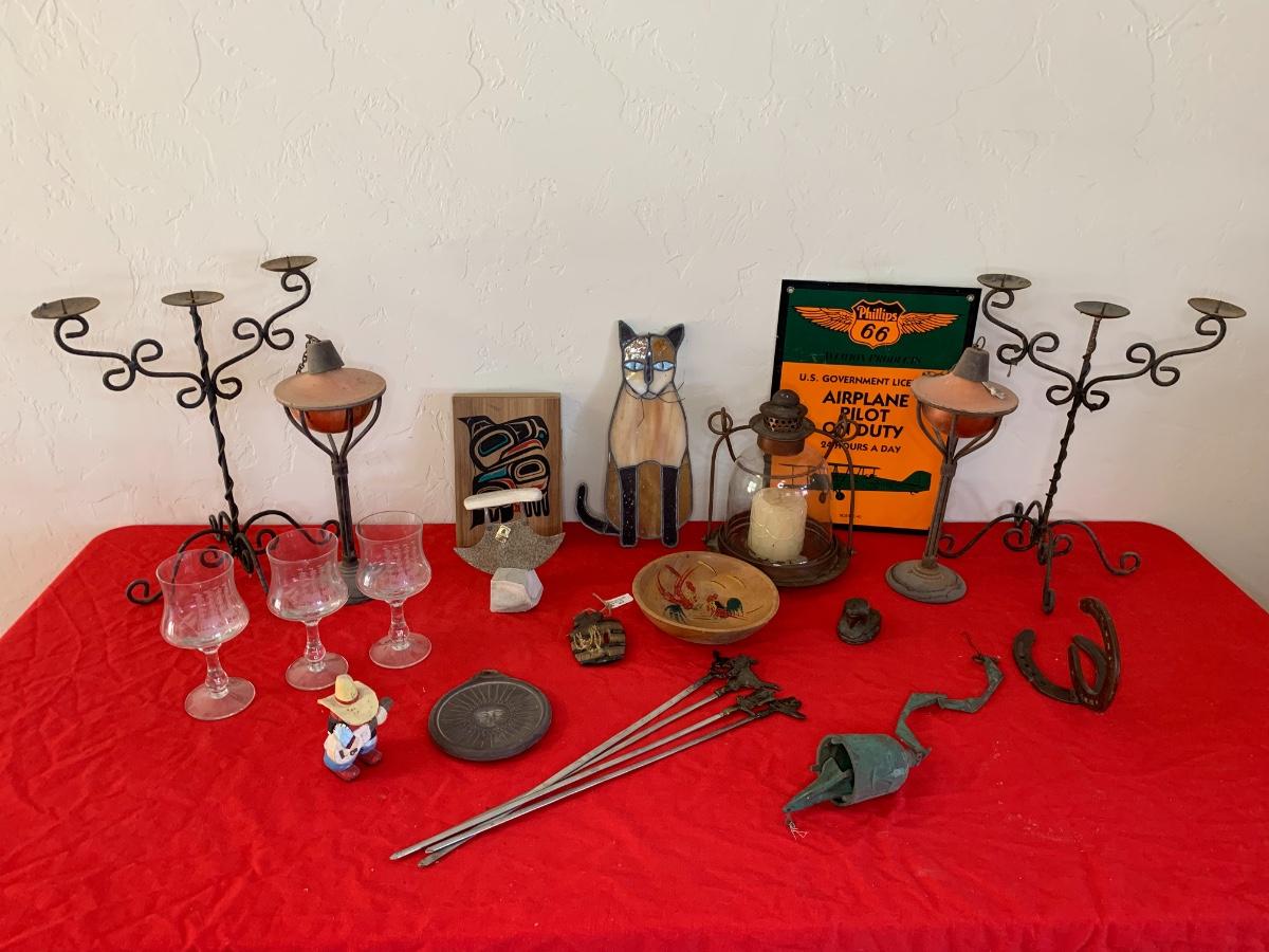 Old Metal candle holders, vintage copper oil lamps, stained glass cat, horse shoes, cowboy skewers, old bell, ship glasses, Phillips 66 Porcelain Repro sign, and other items.
