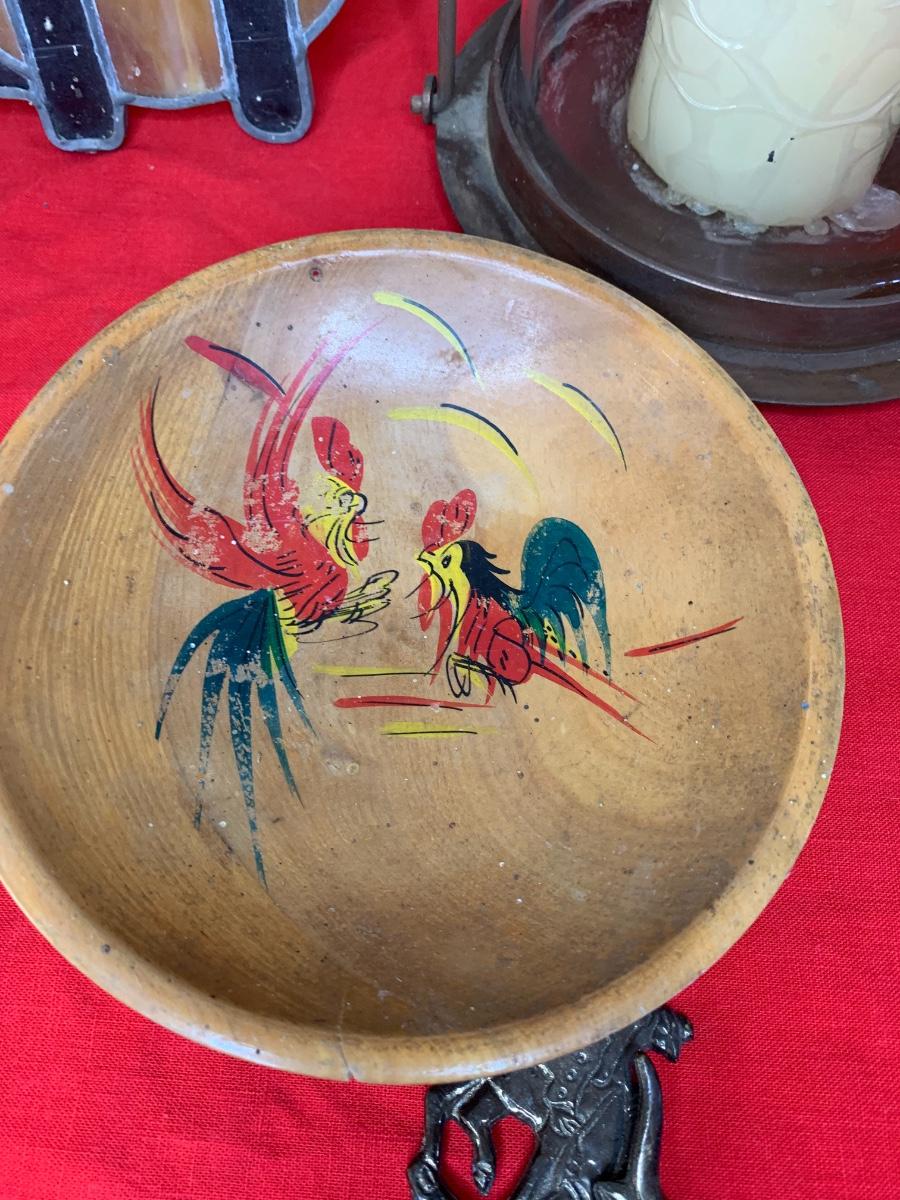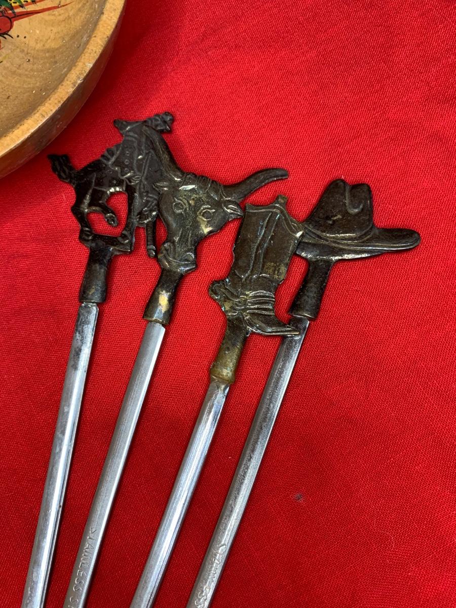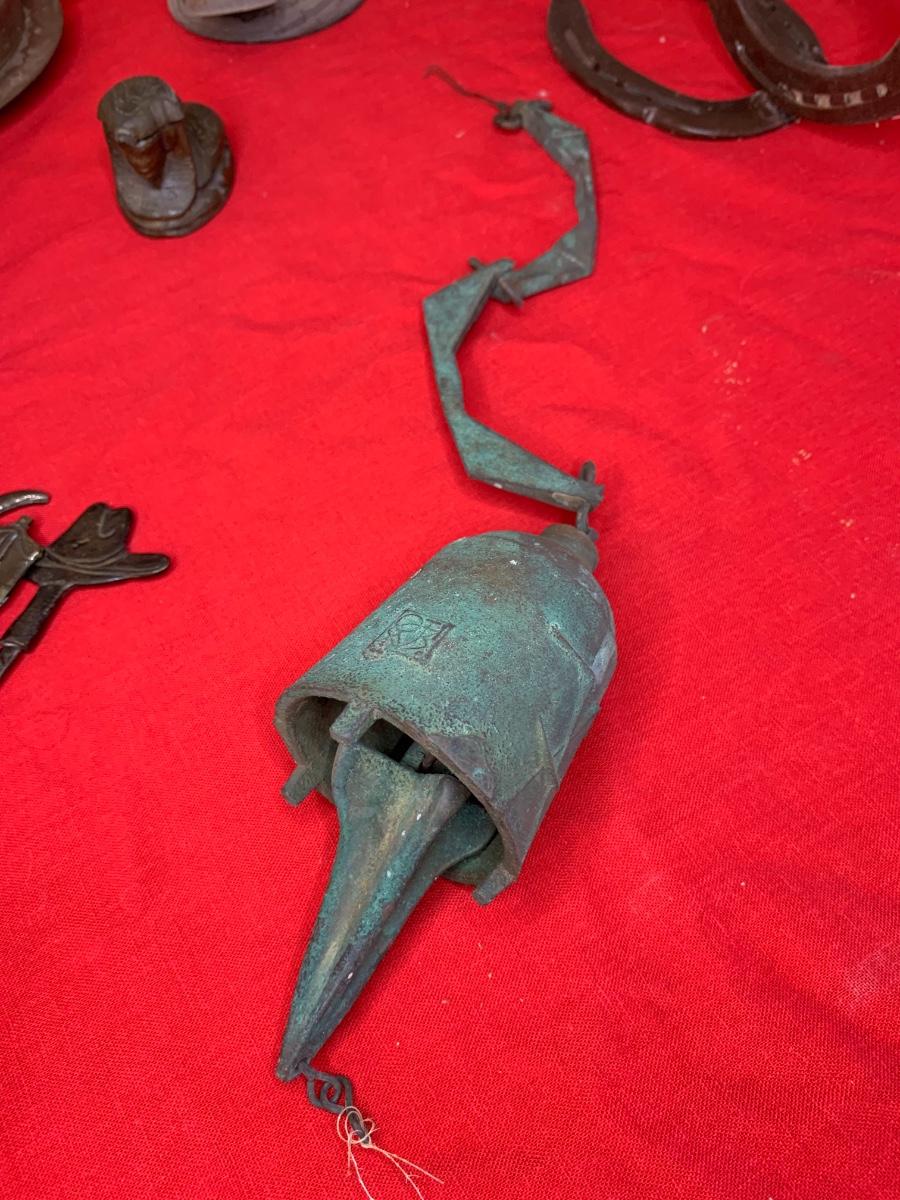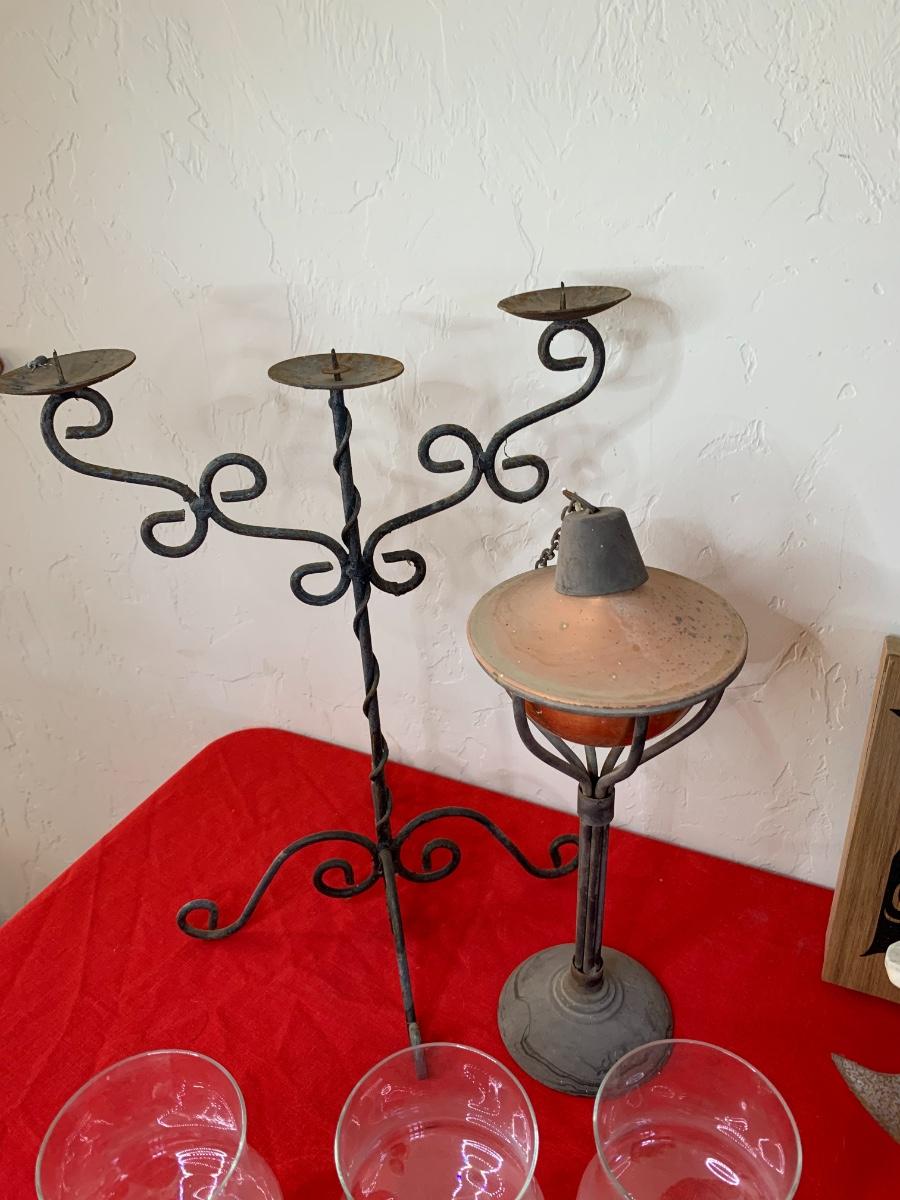 Old Metal candle holders, vintage copper oil lamps, stained glass cat, horse shoes, cowboy skewers, old bell, ship glasses, Phillips 66 Porcelain Repro sign, and other items.