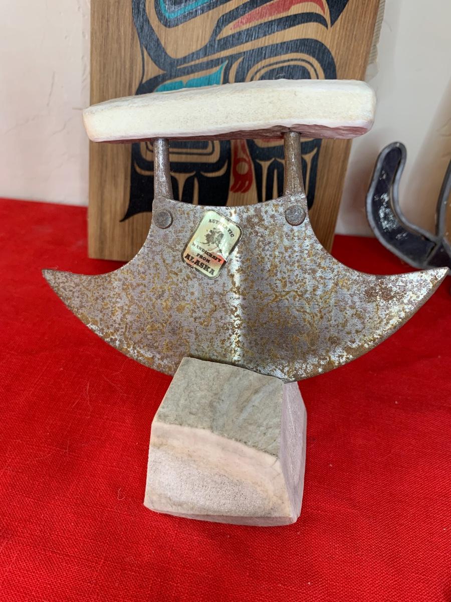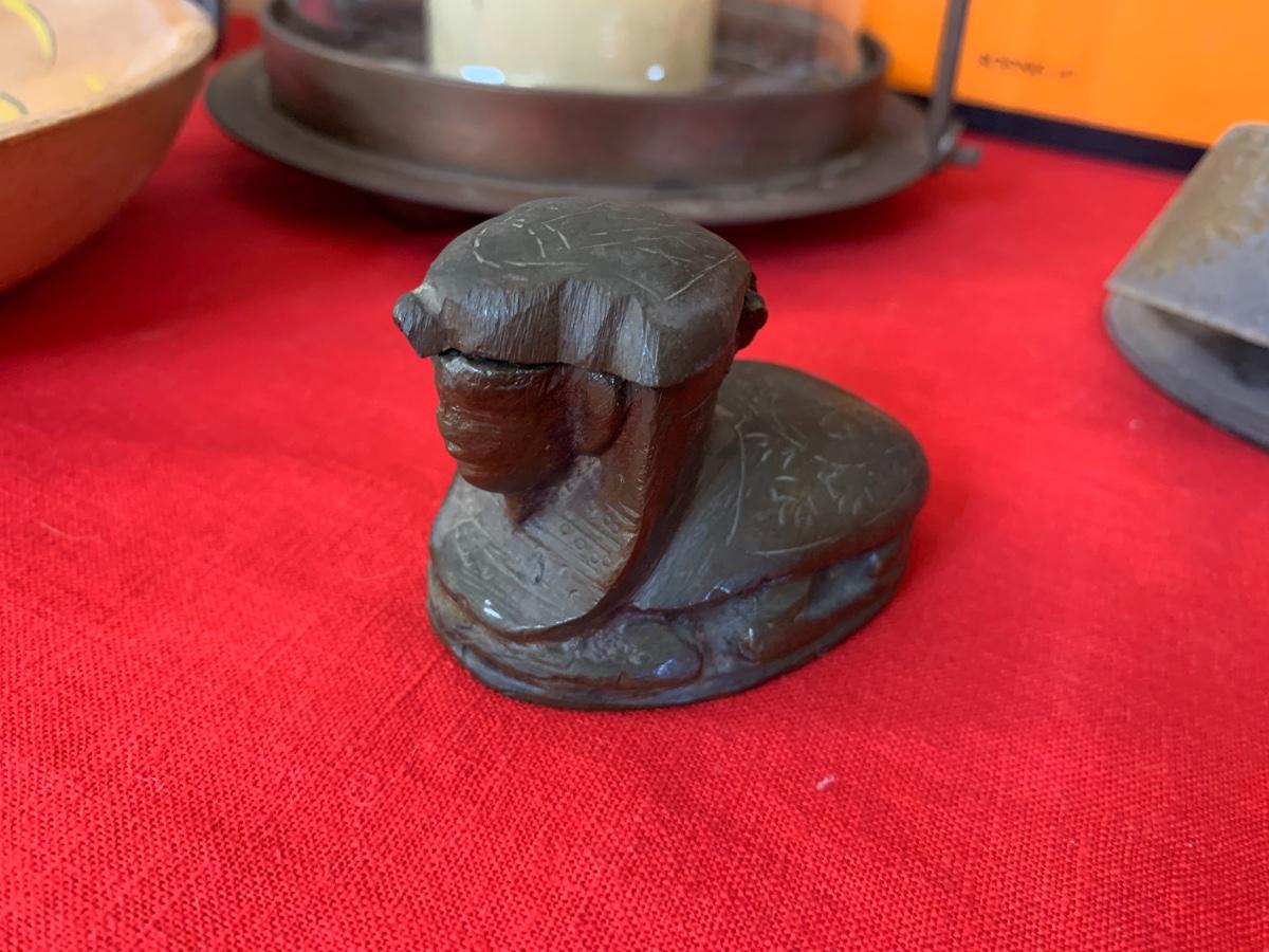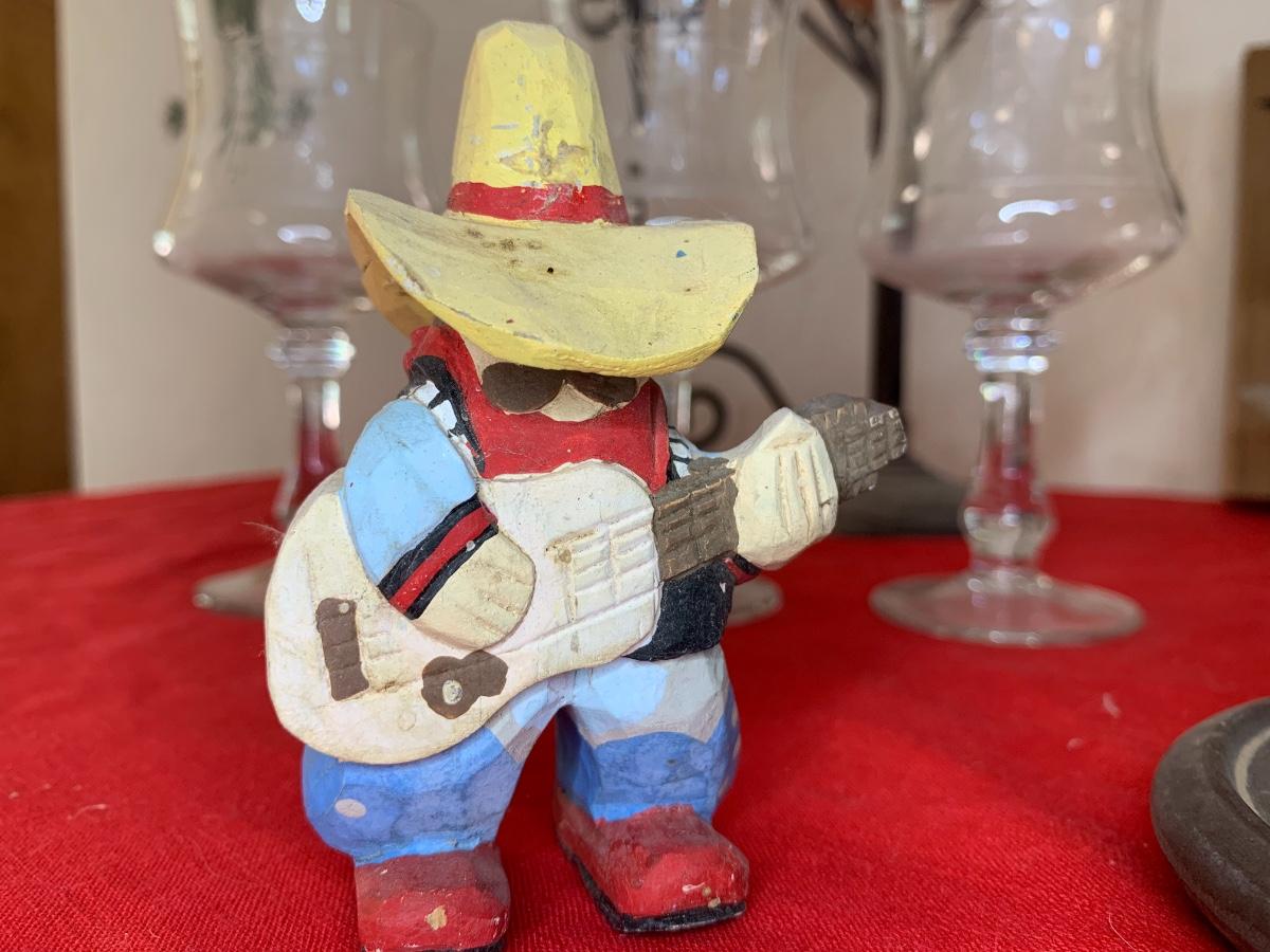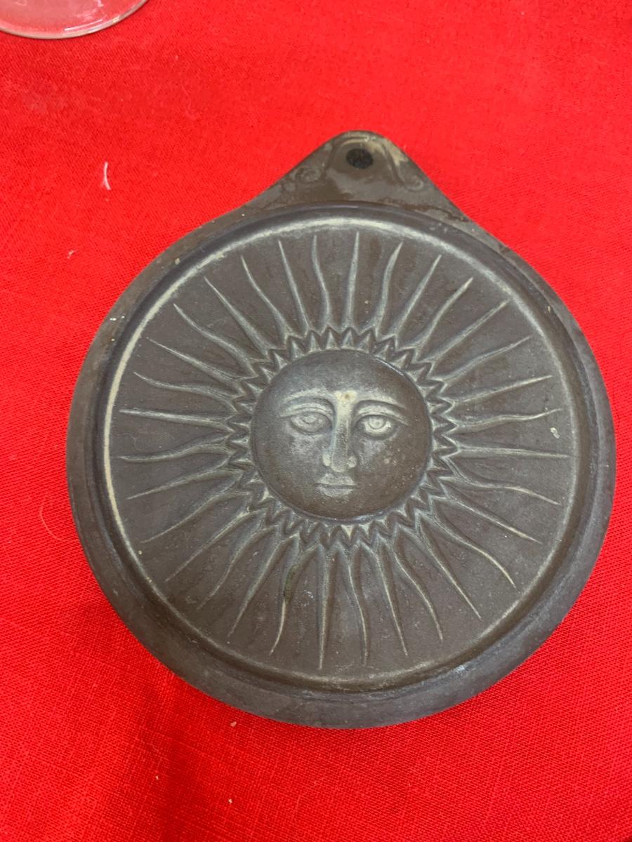 Old Metal candle holders, vintage copper oil lamps, stained glass cat, horse shoes, cowboy skewers, old bell, ship glasses, Phillips 66 Porcelain Repro sign, and other items.