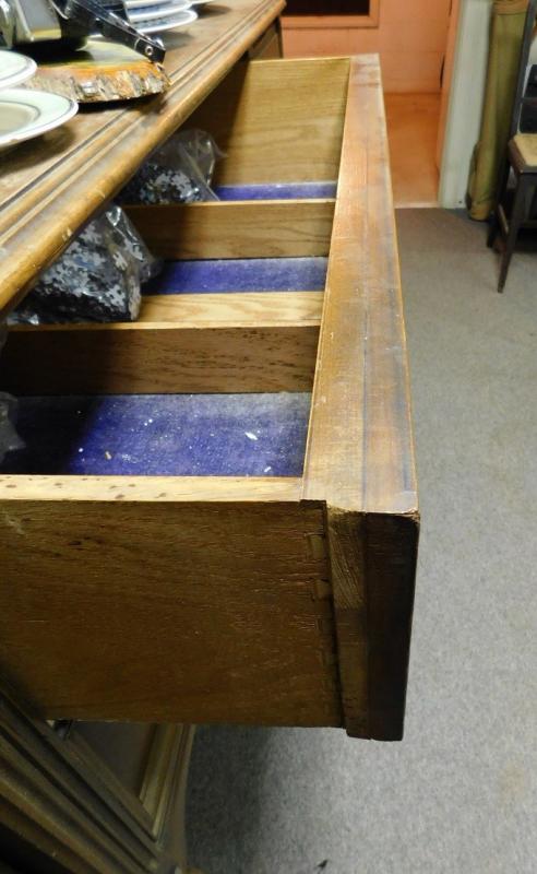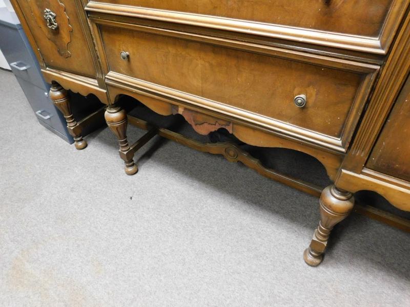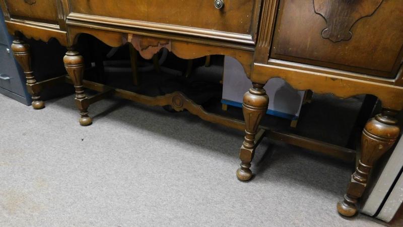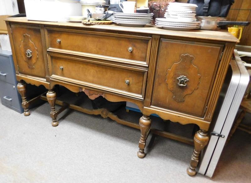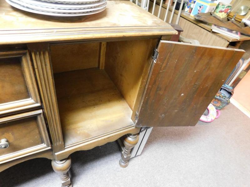 Antique Maple Buffet has some small piece of laminate missing from the apron. Solid piece. Top has scratches, wear, and some staining.