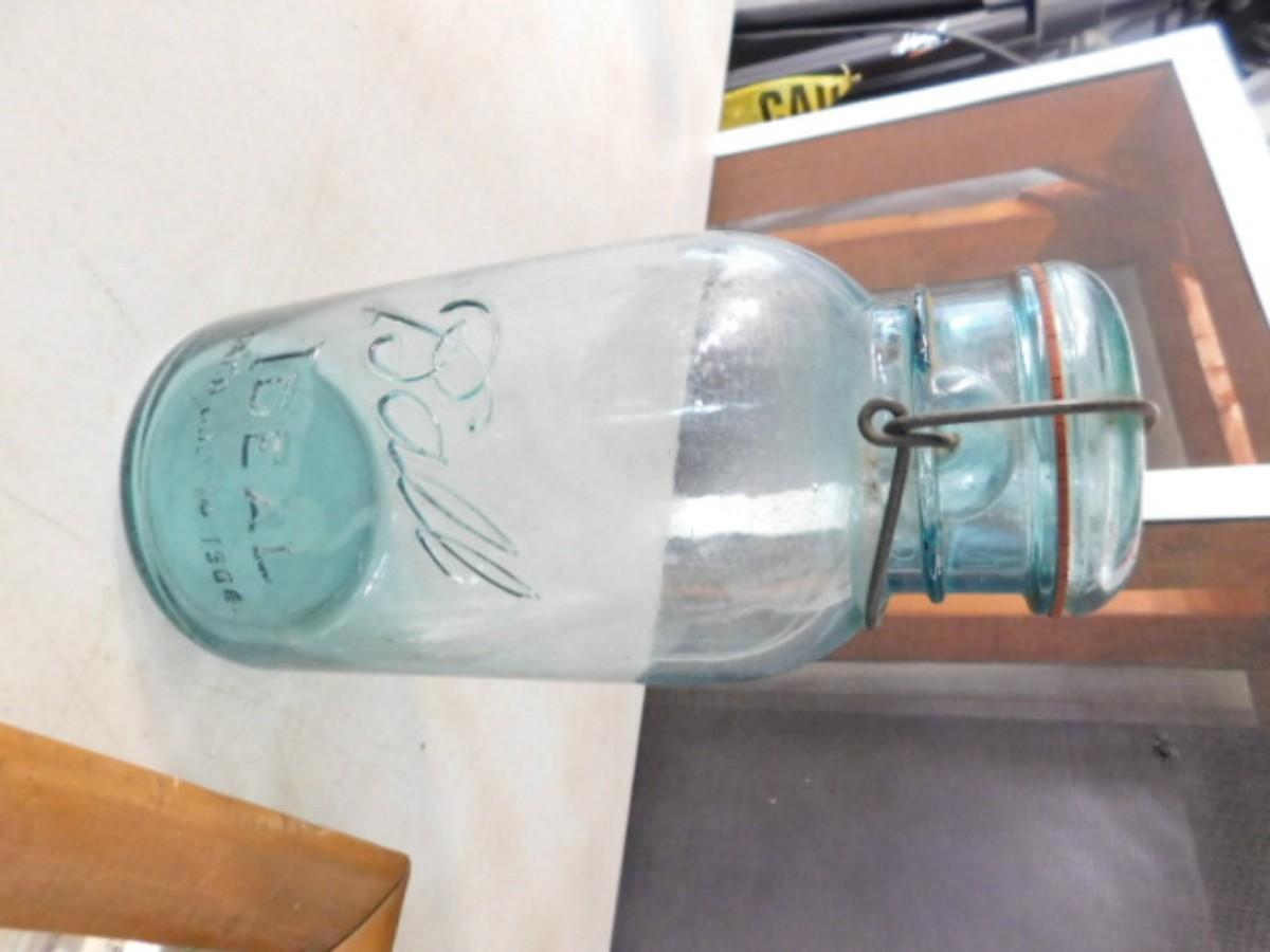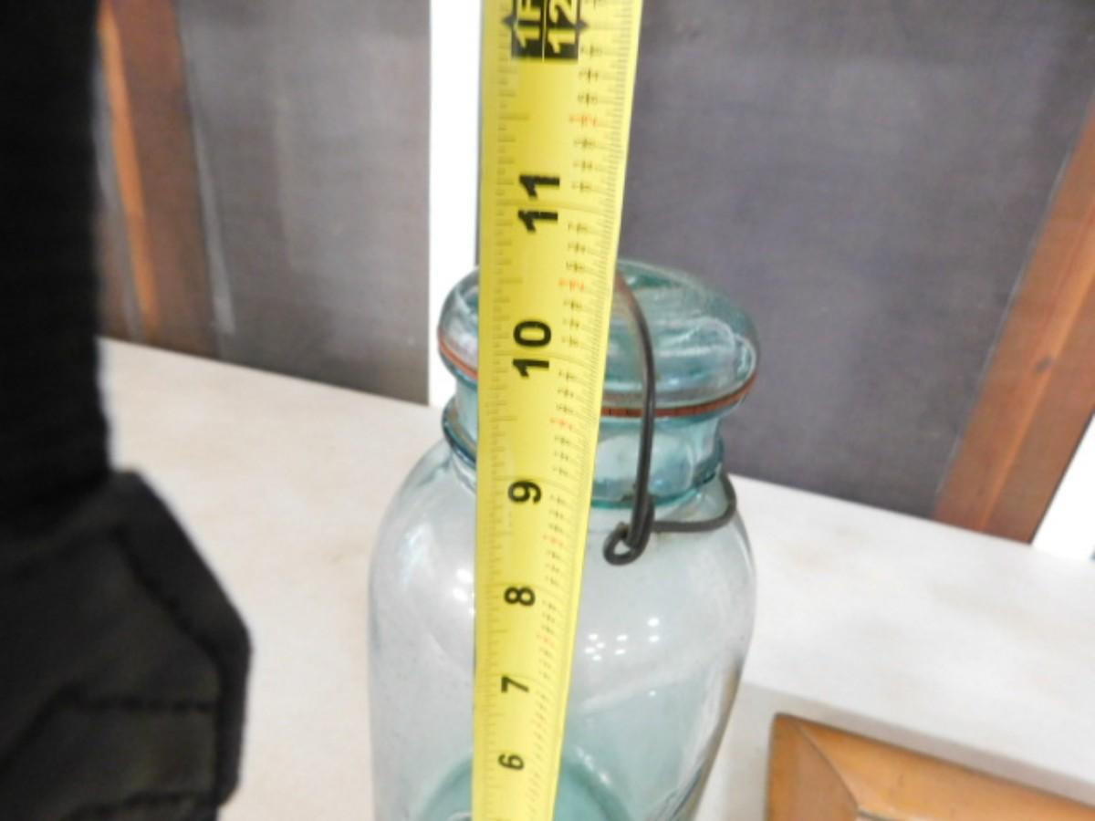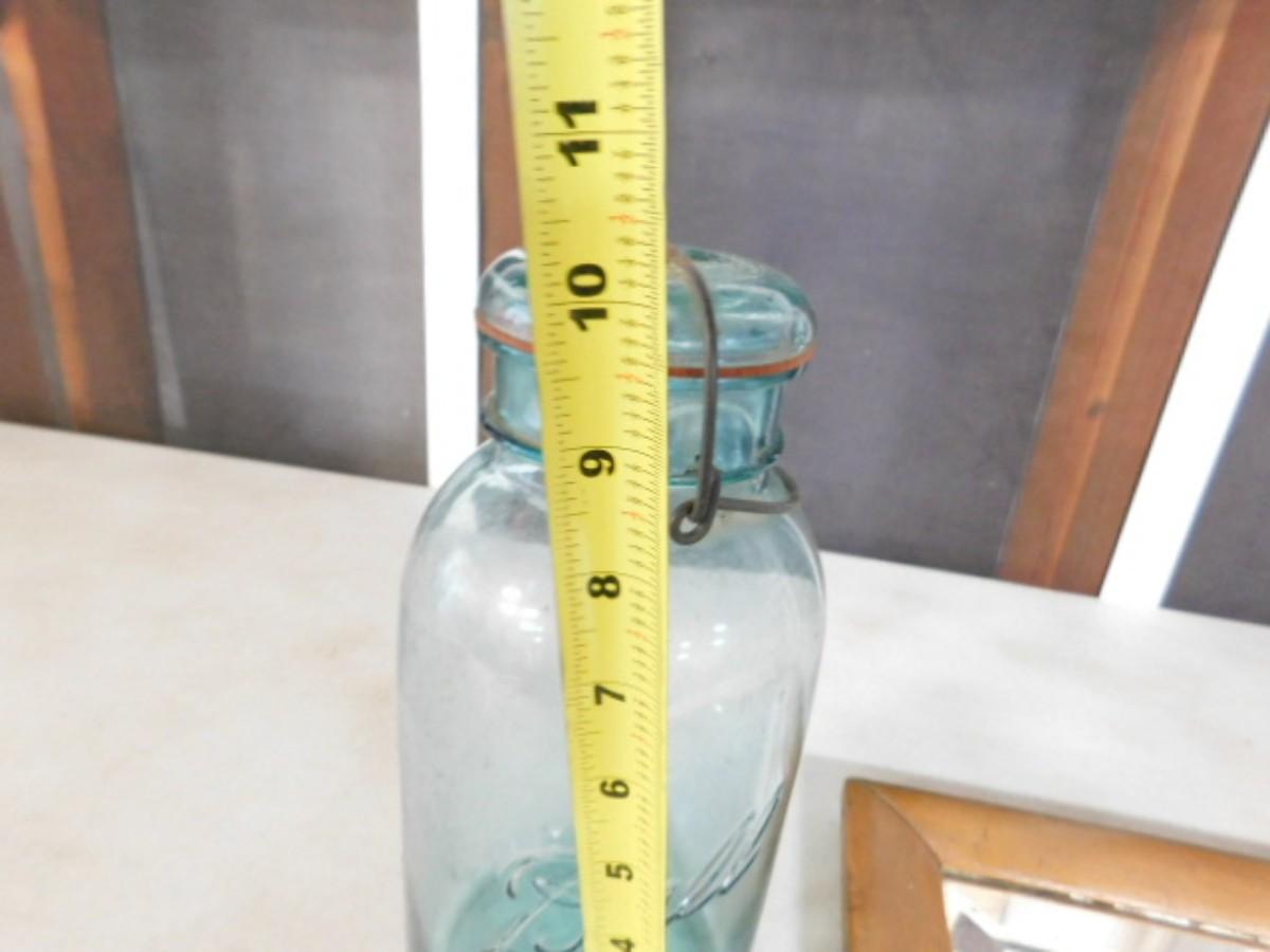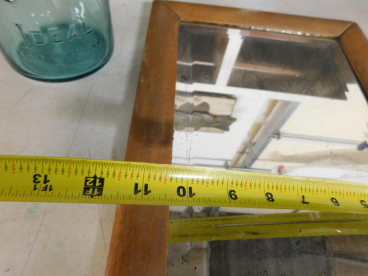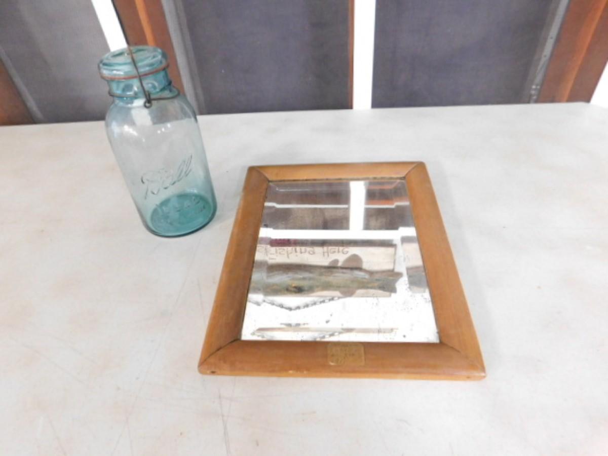 Antique Maple Wood Frame with Beveled Mirror and Blue Glass Ball Bell Top Jar