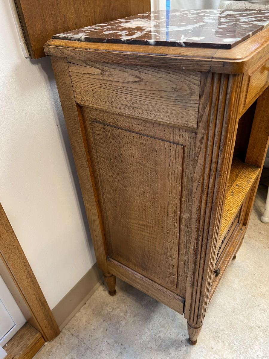 Beautiful antique marble-top and oak side cabinet with one drawer, an open storage shelf, and a lower cabinet (originally for a chamber pot). Condition as shown.