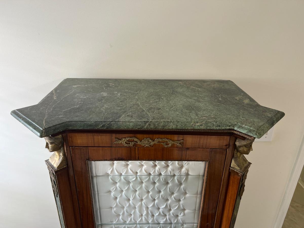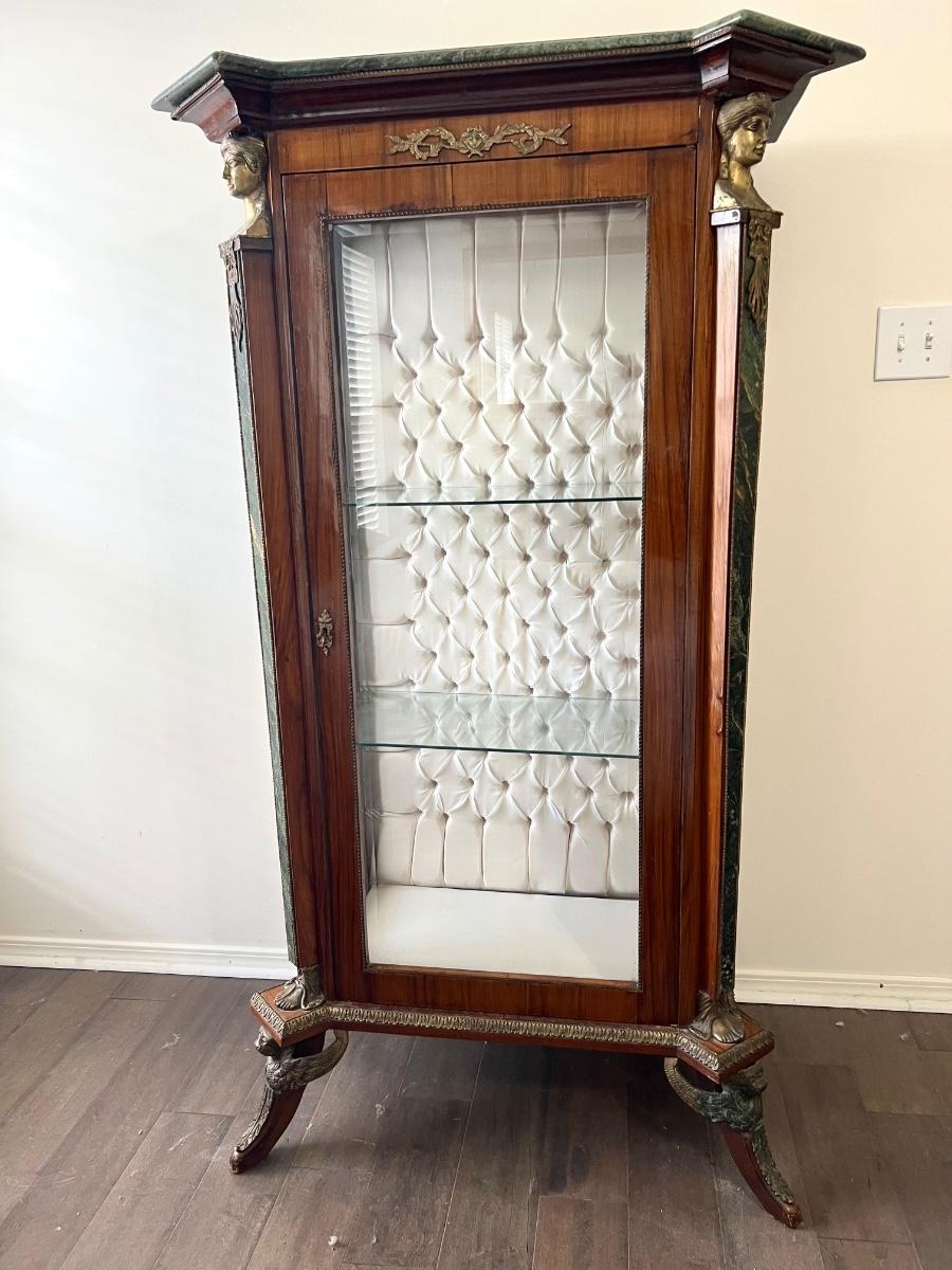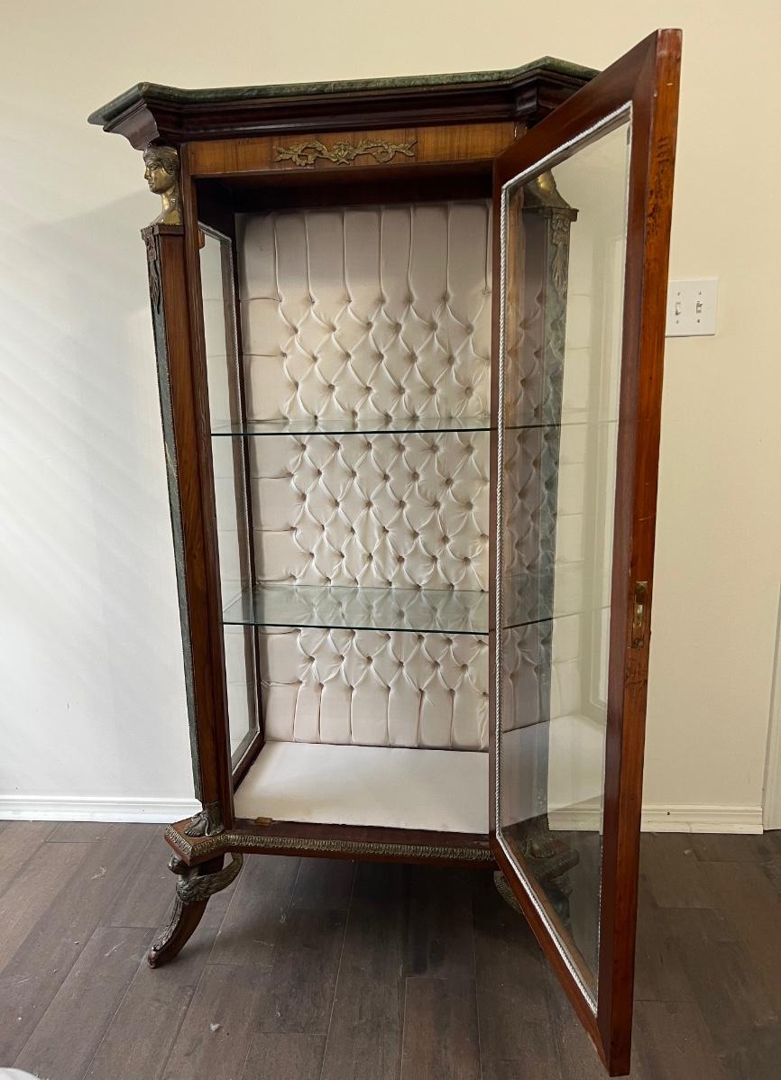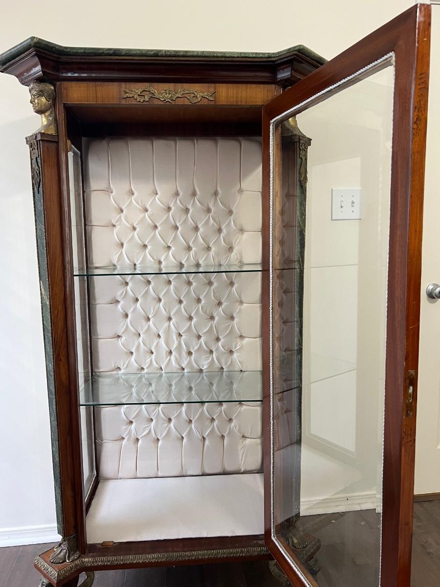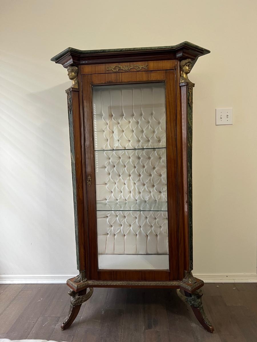 Antique Marble Top Curio Display Cabinet Tufted Interior