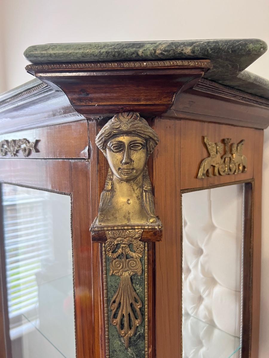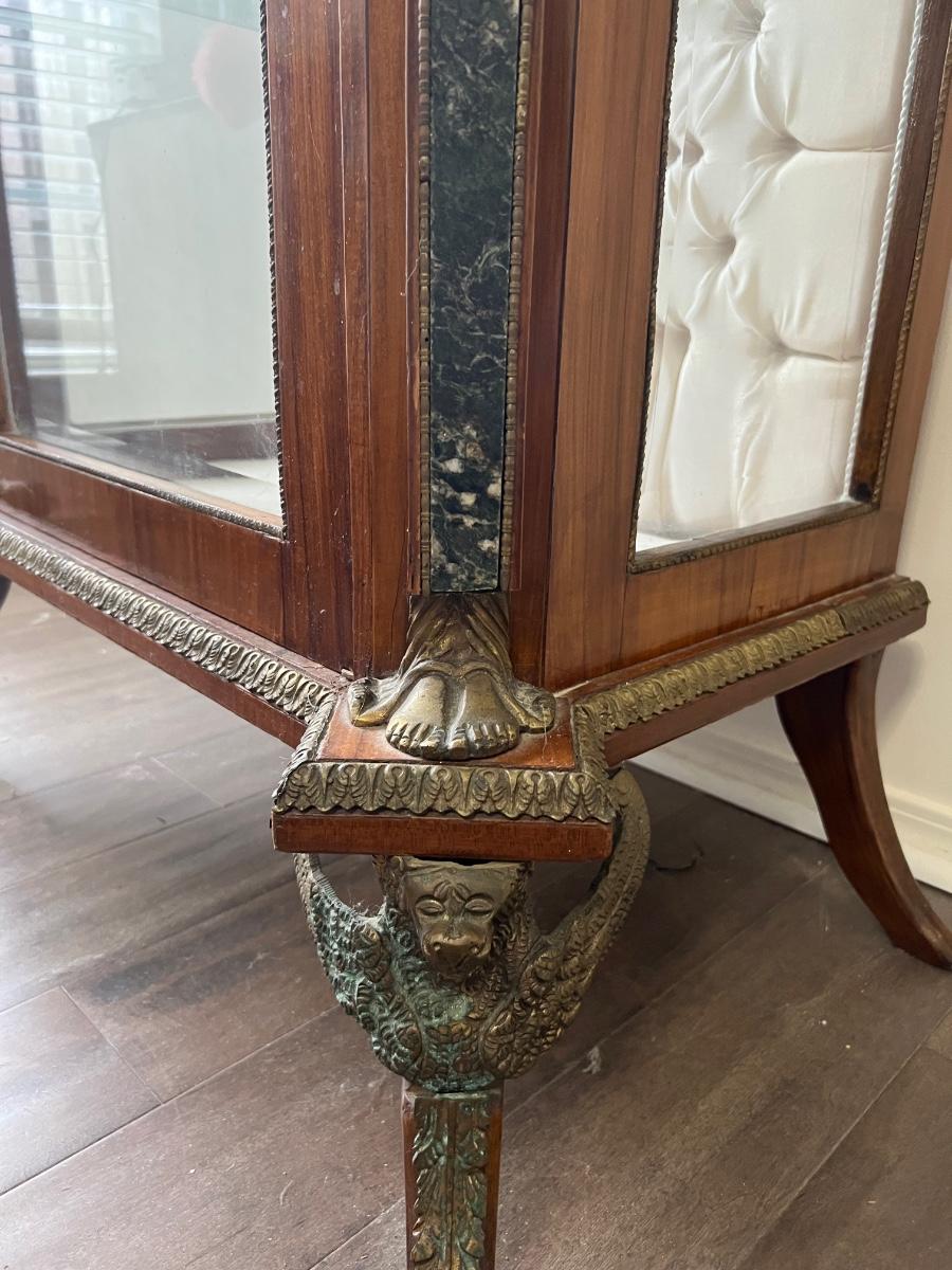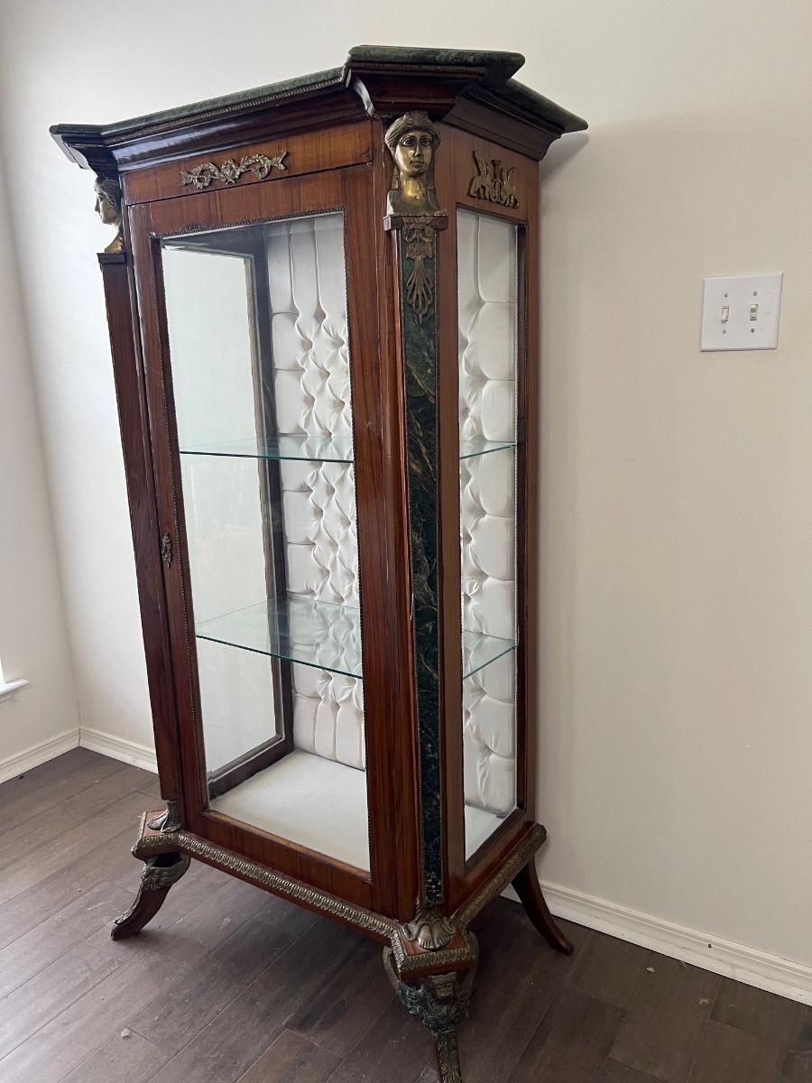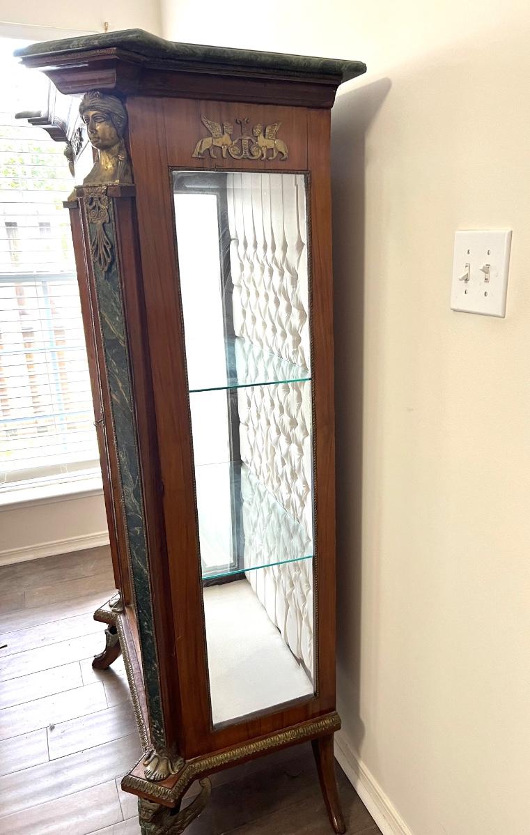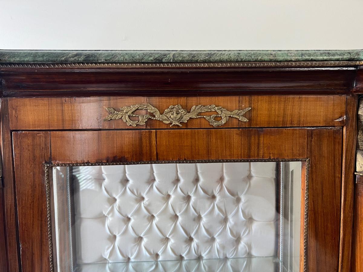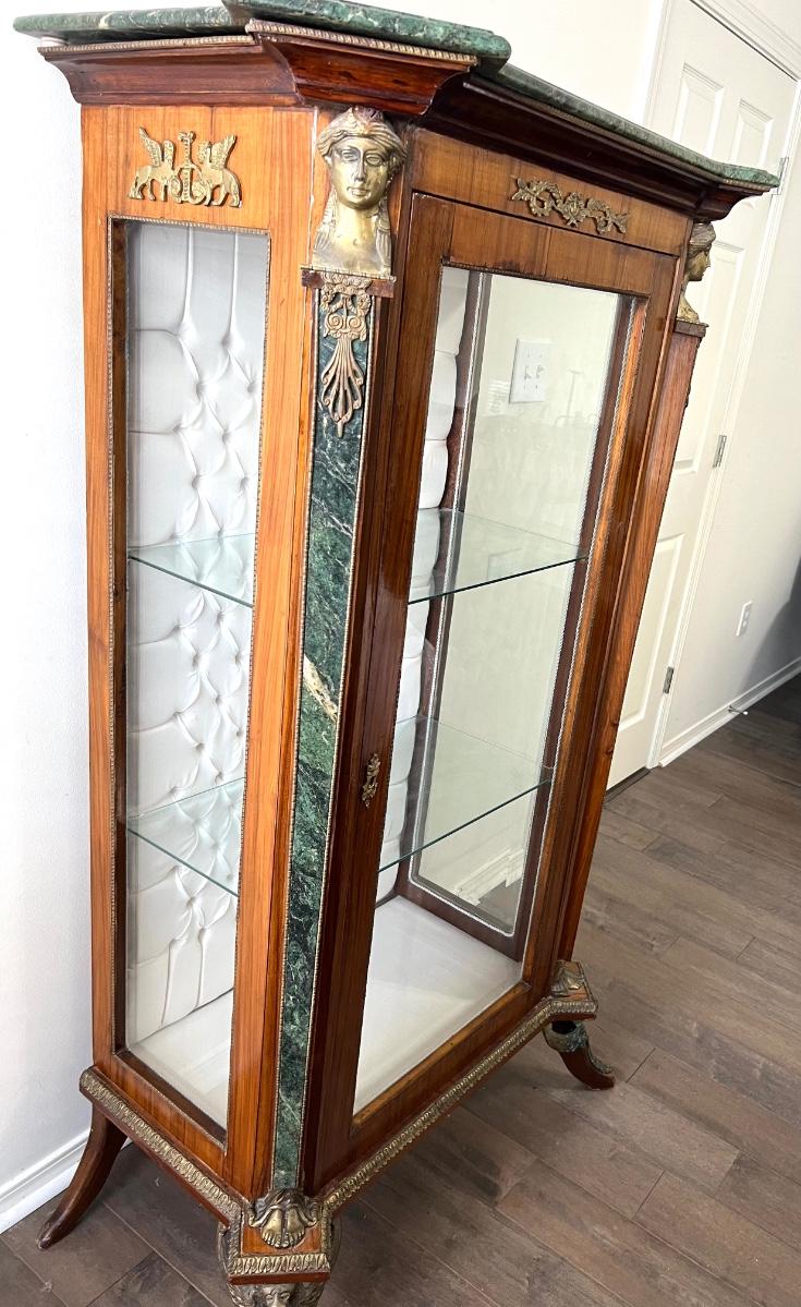 Antique Marble Top Curio Display Cabinet Tufted Interior
