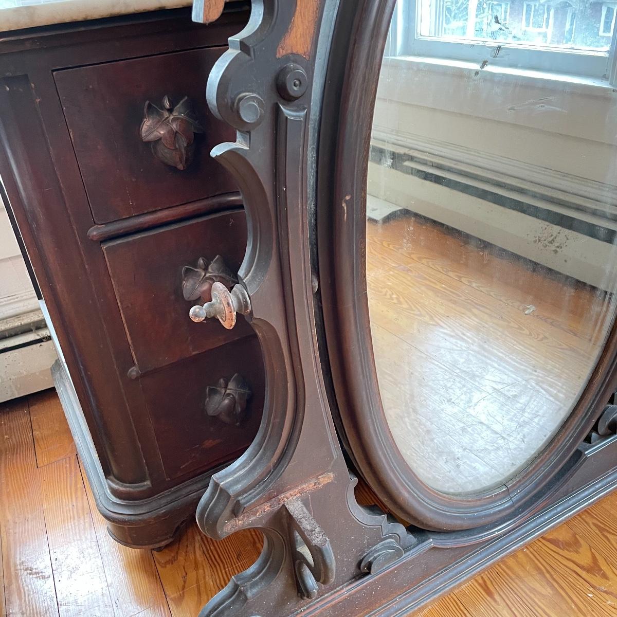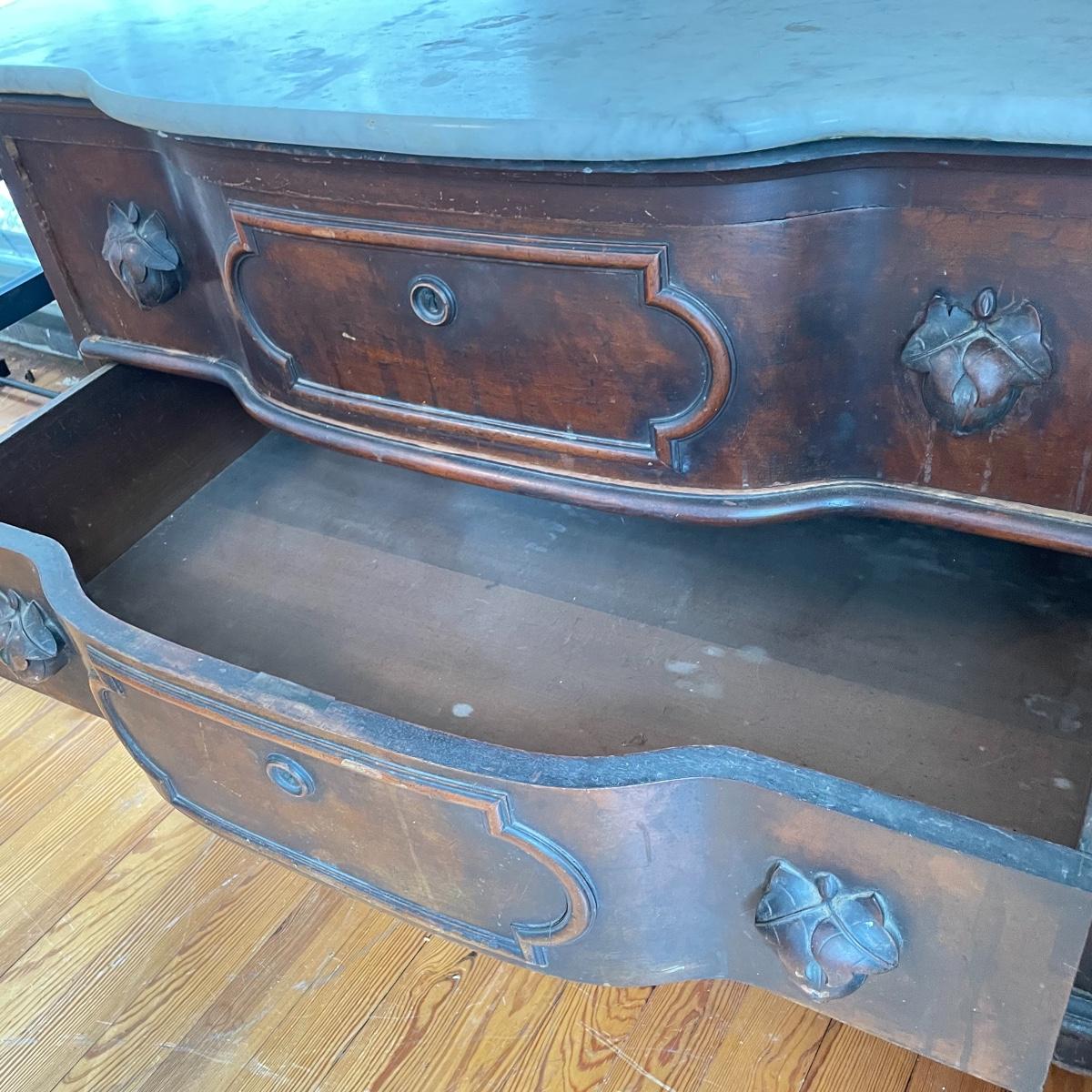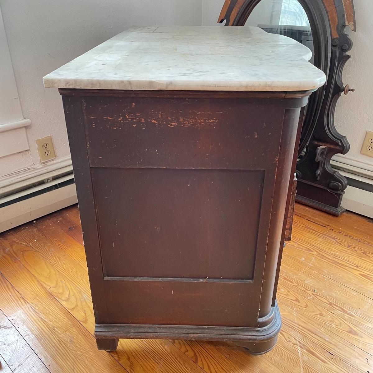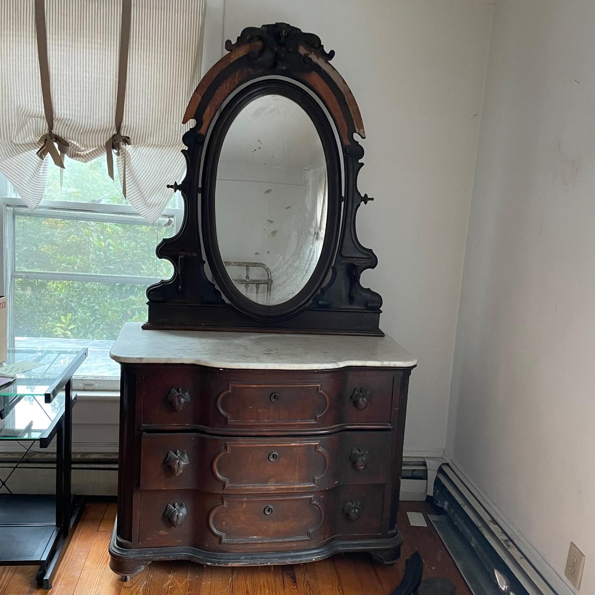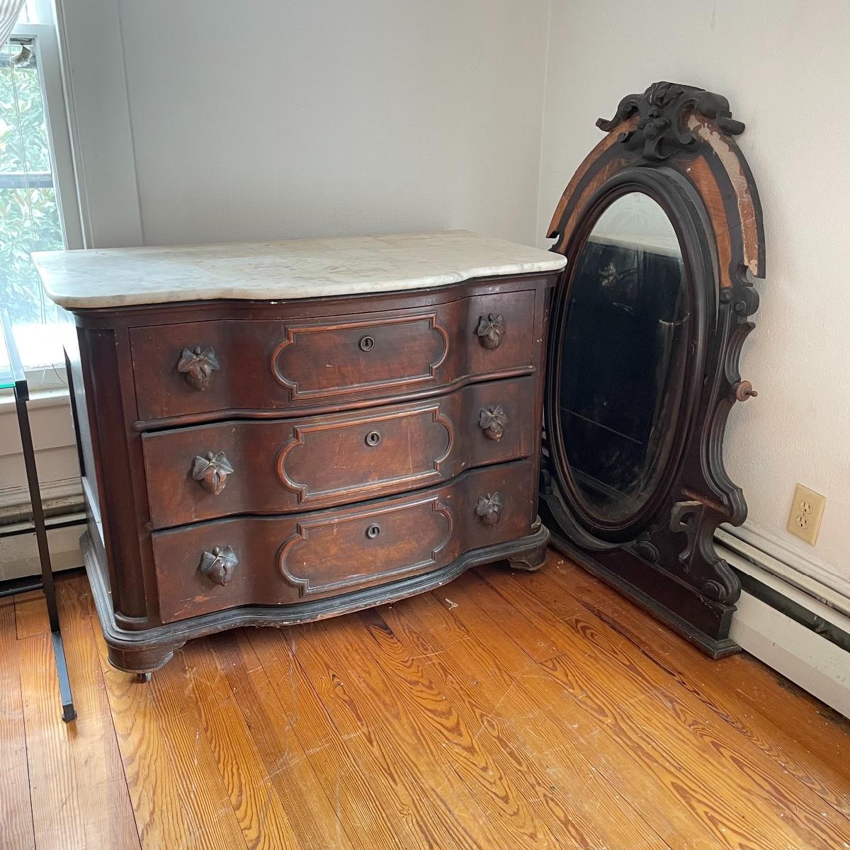 This beautiful piece has a removable marble top, three large dovetail drawers and nice carved wooden pulls. The middle drawer will not close all the way, it may swell during summer months. Dresser is on four casters and measures 47” x 26” x 35”. The mirror is almost 51” tall, with tilt capability. Some wood is in need of repair, two shelves and the pieces from one side of the mirror were found with the dresser. It appears that the mirror can be attached with dowels to the marble top. The wooden backside of the mirror is loose. Local pick up only. Please bring help to load, pieces are located upstairs.