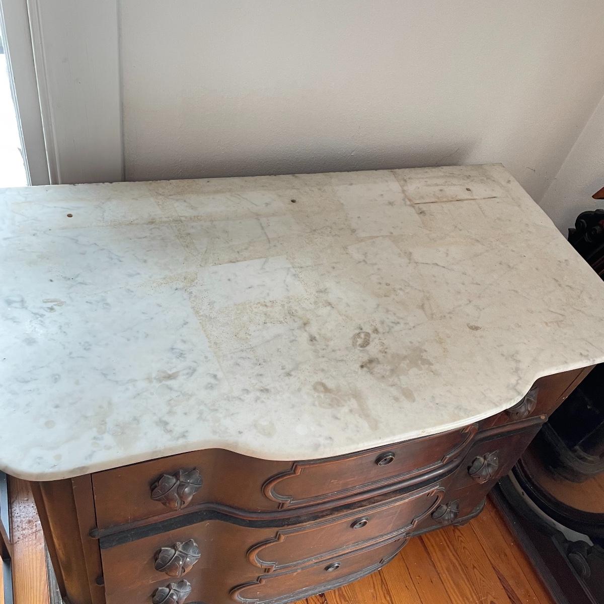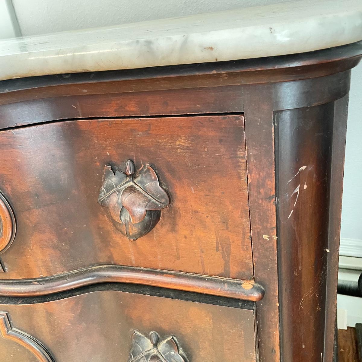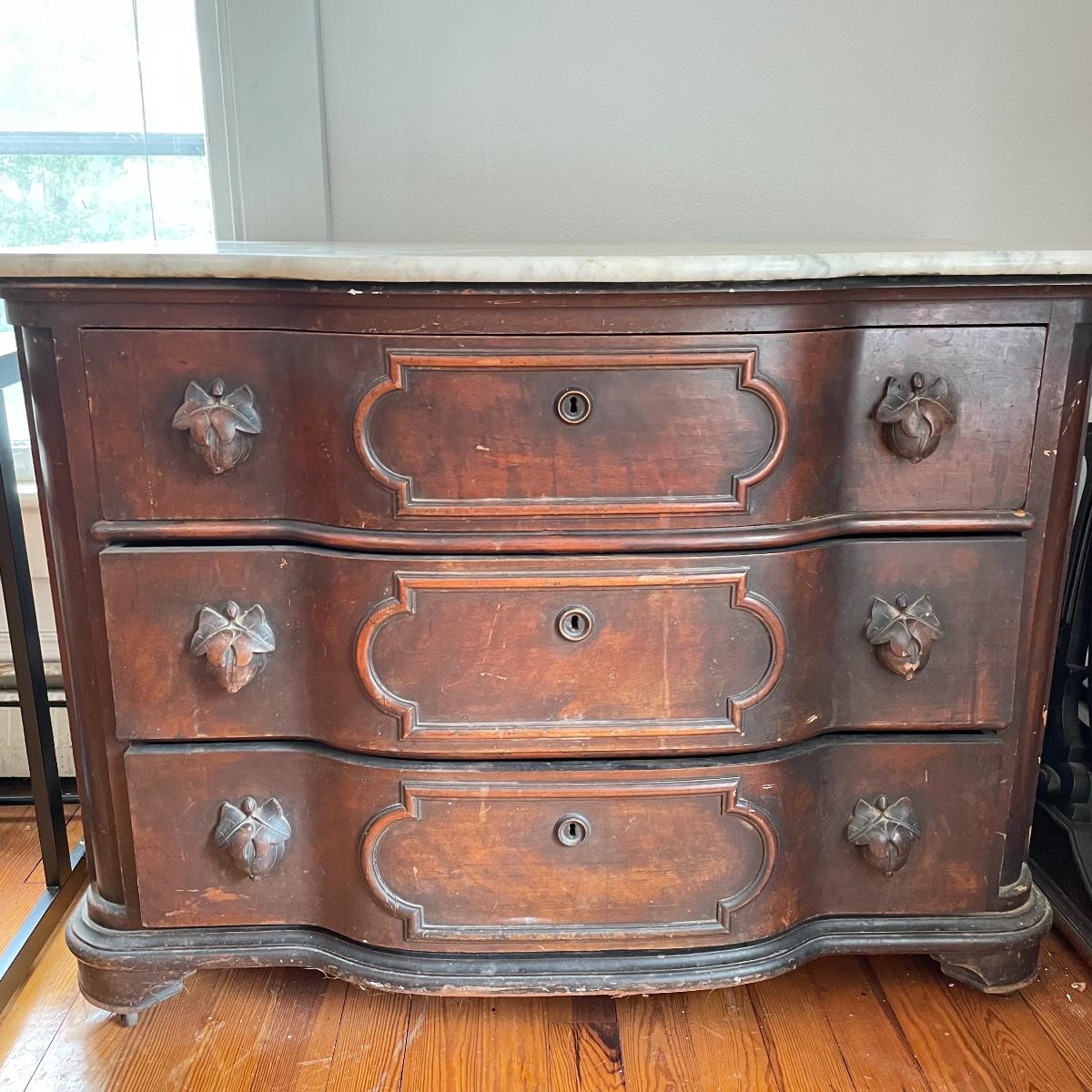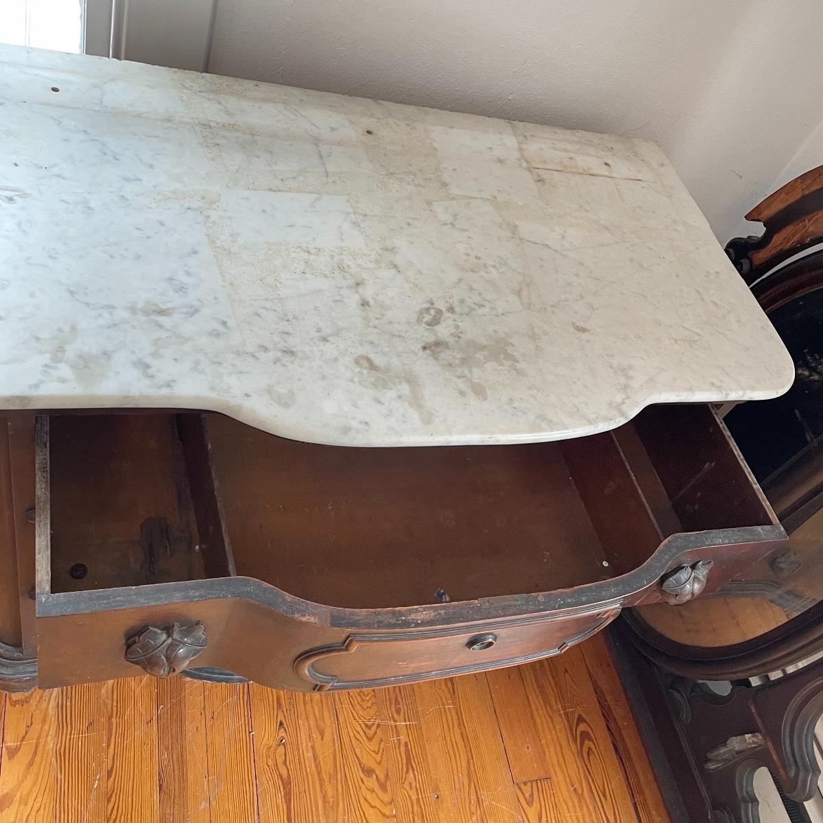 This beautiful piece has a removable marble top, three large dovetail drawers and nice carved wooden pulls. The middle drawer will not close all the way, it may swell during summer months. Dresser is on four casters and measures 47” x 26” x 35”. The mirror is almost 51” tall, with tilt capability. Some wood is in need of repair, two shelves and the pieces from one side of the mirror were found with the dresser. It appears that the mirror can be attached with dowels to the marble top. The wooden backside of the mirror is loose. Local pick up only. Please bring help to load, pieces are located upstairs.