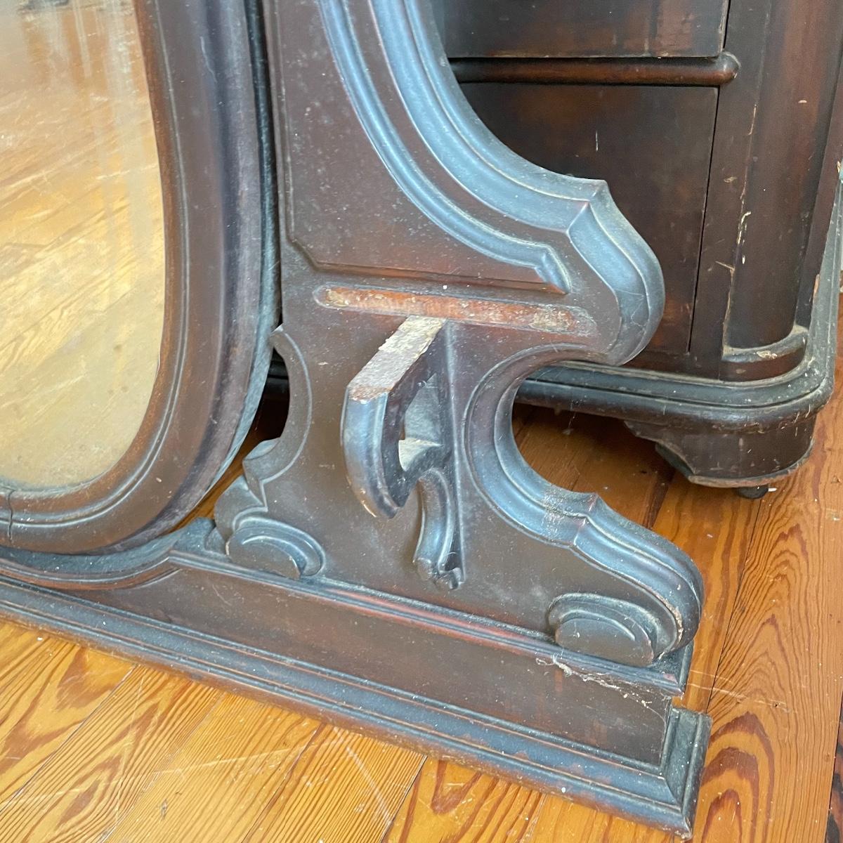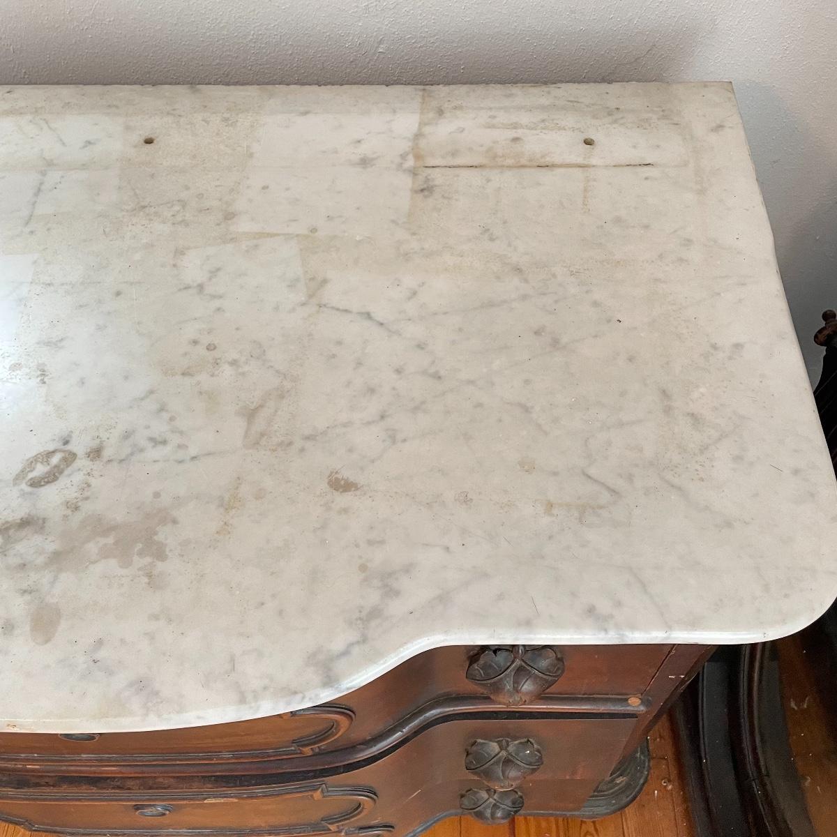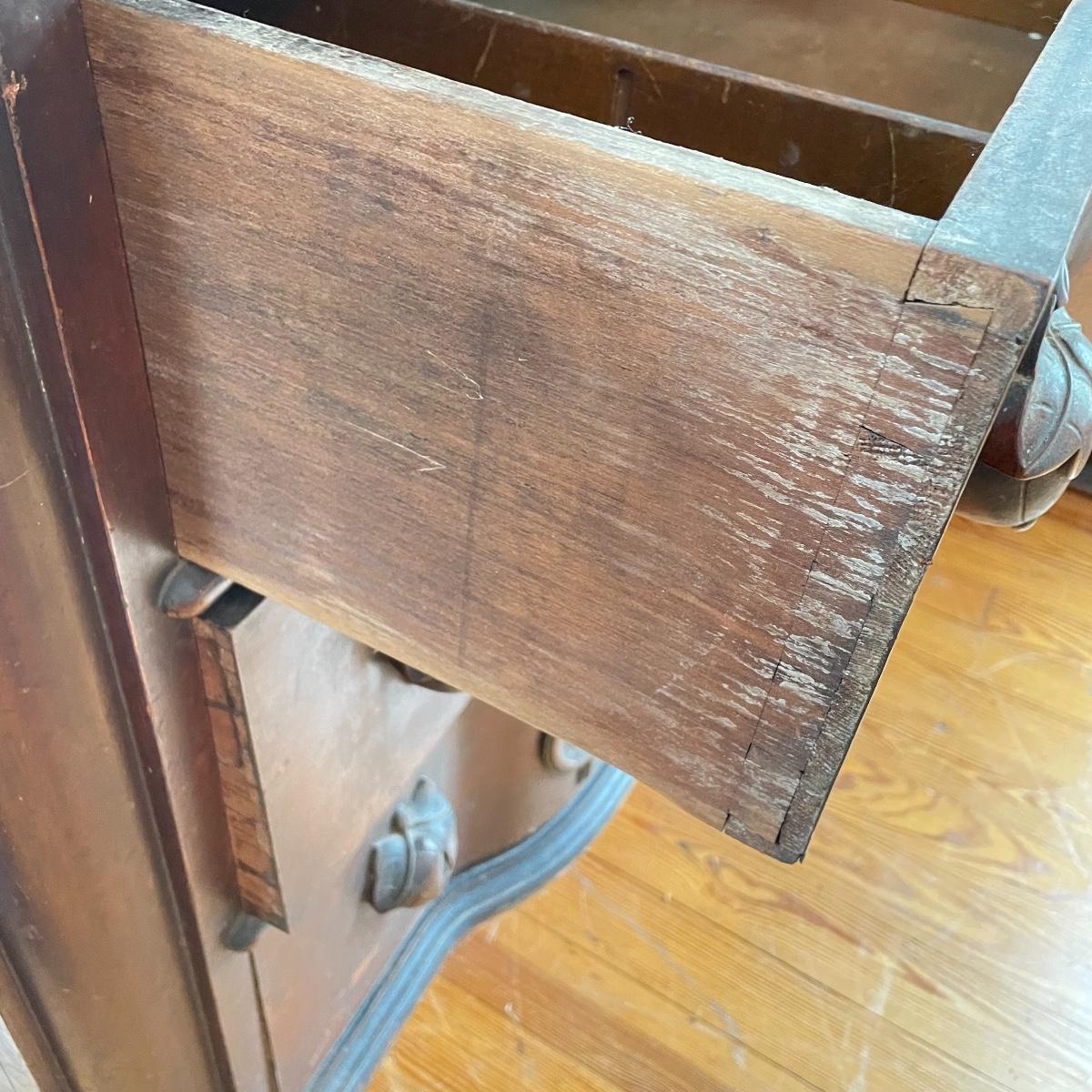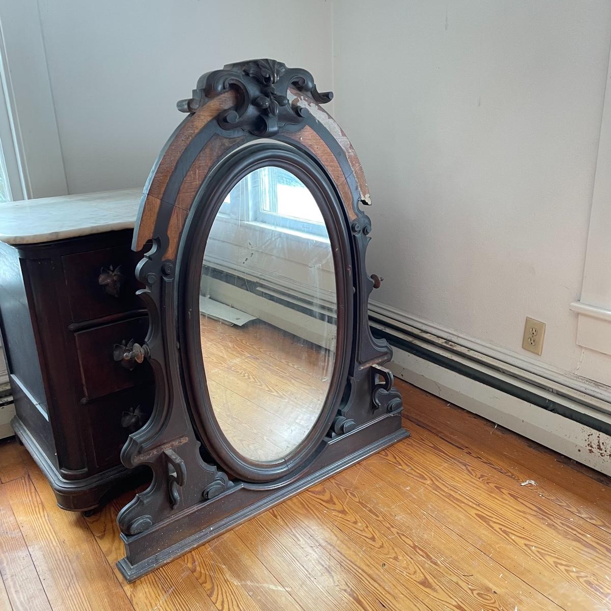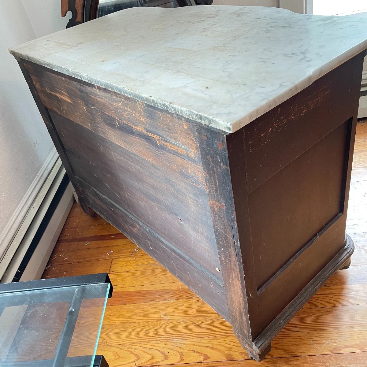 This beautiful piece has a removable marble top, three large dovetail drawers and nice carved wooden pulls. The middle drawer will not close all the way, it may swell during summer months. Dresser is on four casters and measures 47” x 26” x 35”. The mirror is almost 51” tall, with tilt capability. Some wood is in need of repair, two shelves and the pieces from one side of the mirror were found with the dresser. It appears that the mirror can be attached with dowels to the marble top. The wooden backside of the mirror is loose. Local pick up only. Please bring help to load, pieces are located upstairs.