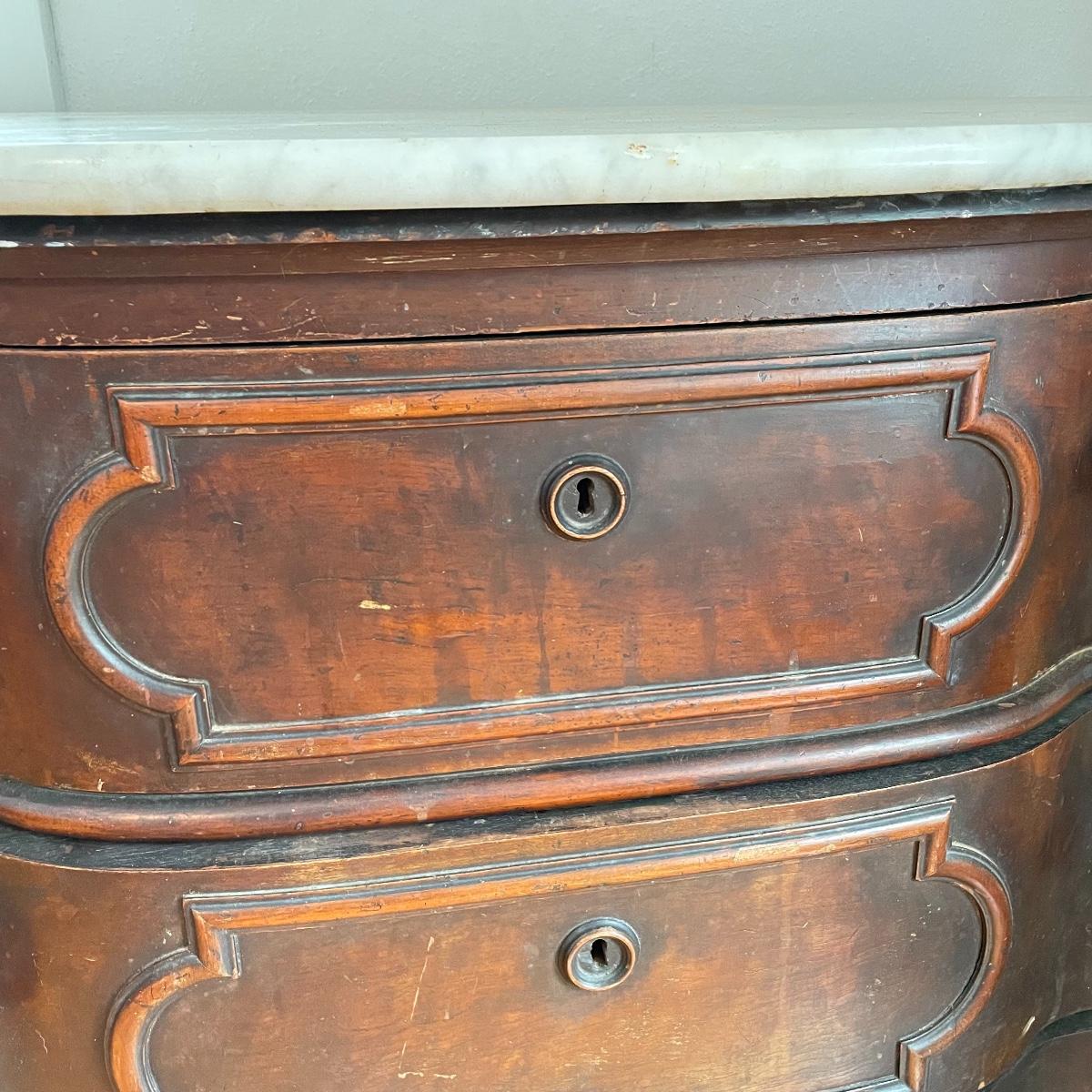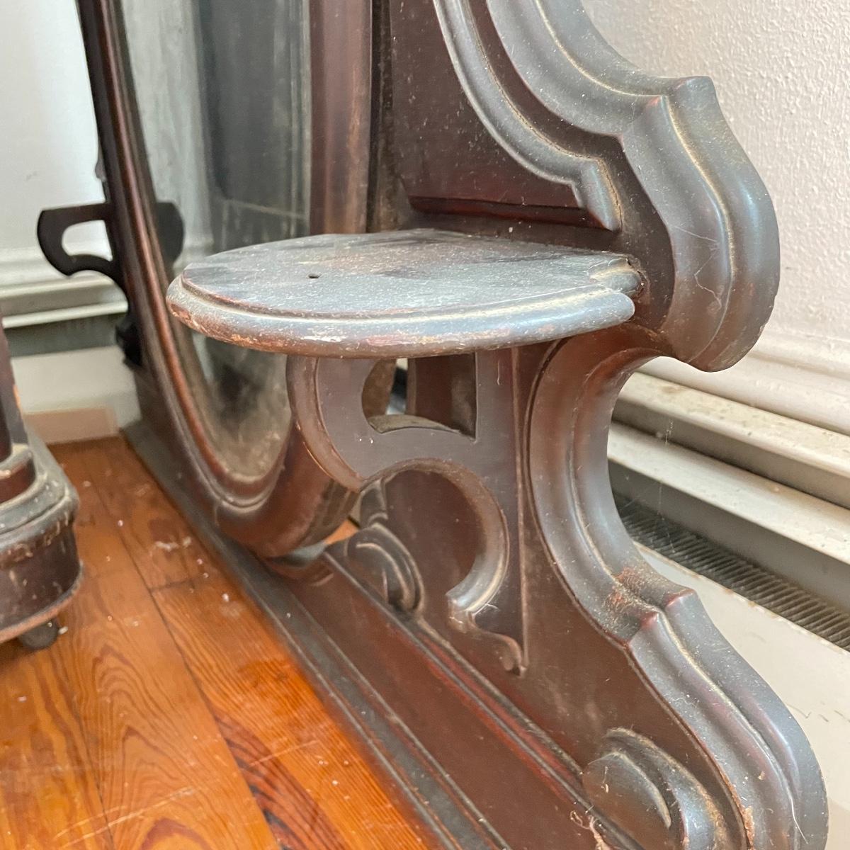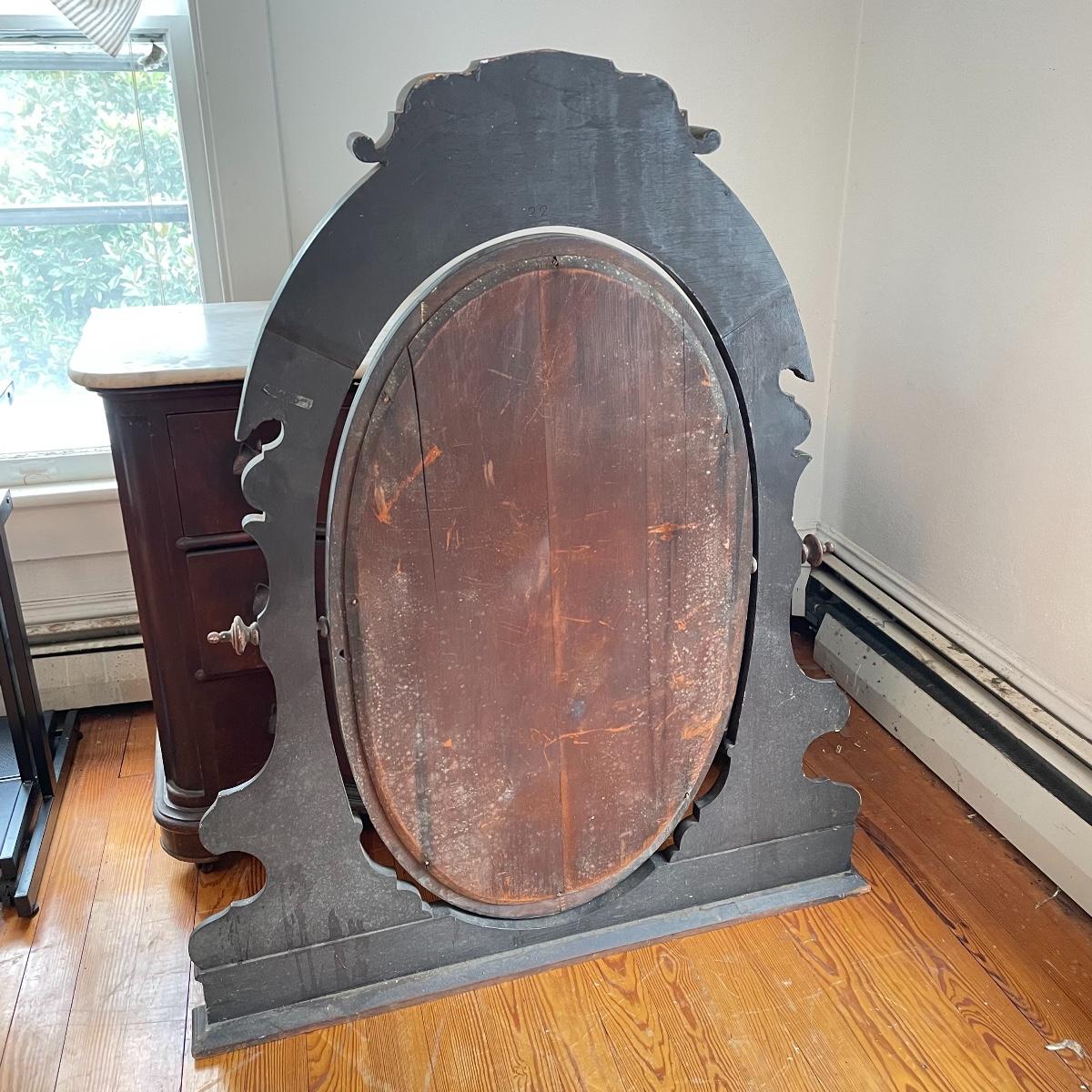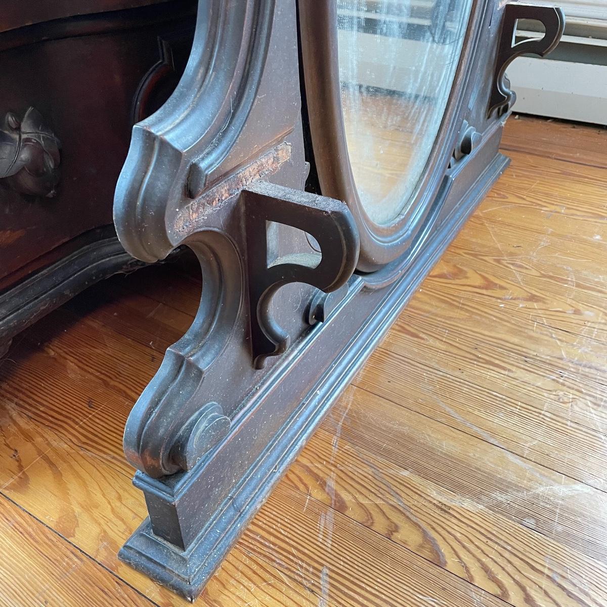 This beautiful piece has a removable marble top, three large dovetail drawers and nice carved wooden pulls. The middle drawer will not close all the way, it may swell during summer months. Dresser is on four casters and measures 47” x 26” x 35”. The mirror is almost 51” tall, with tilt capability. Some wood is in need of repair, two shelves and the pieces from one side of the mirror were found with the dresser. It appears that the mirror can be attached with dowels to the marble top. The wooden backside of the mirror is loose. Local pick up only. Please bring help to load, pieces are located upstairs.