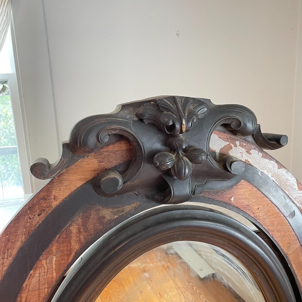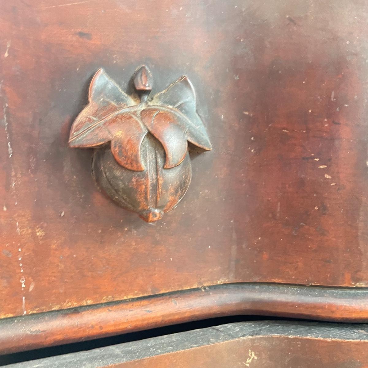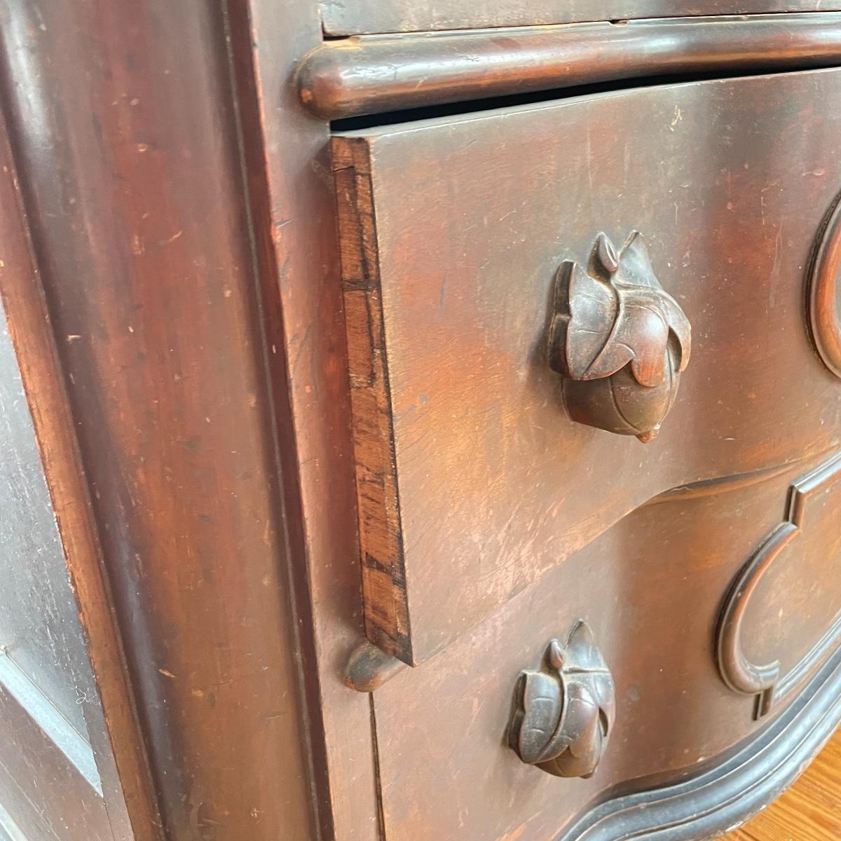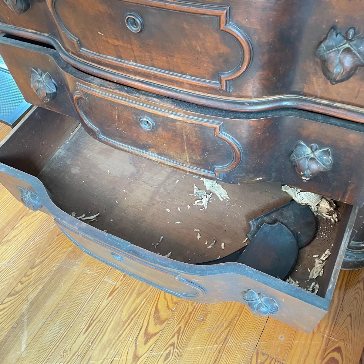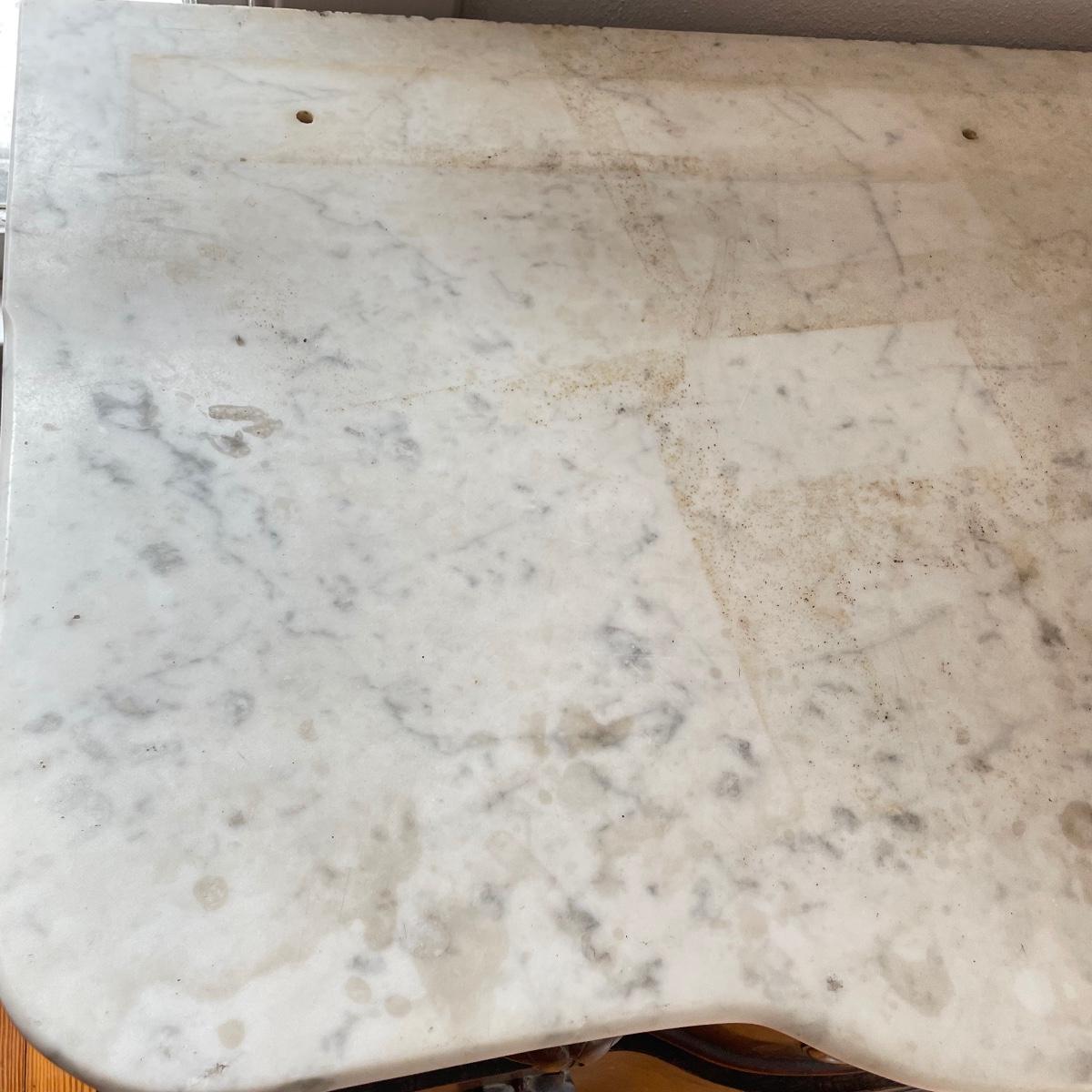 This beautiful piece has a removable marble top, three large dovetail drawers and nice carved wooden pulls. The middle drawer will not close all the way, it may swell during summer months. Dresser is on four casters and measures 47” x 26” x 35”. The mirror is almost 51” tall, with tilt capability. Some wood is in need of repair, two shelves and the pieces from one side of the mirror were found with the dresser. It appears that the mirror can be attached with dowels to the marble top. The wooden backside of the mirror is loose. Local pick up only. Please bring help to load, pieces are located upstairs.
