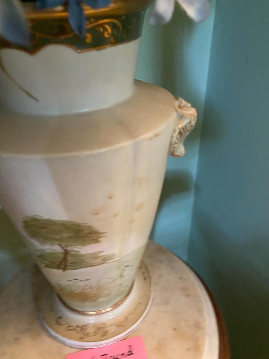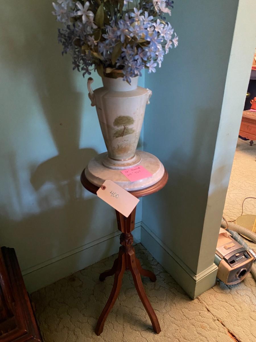 LOT 400 Antique Marble Top Plant Stand w/ Nippon Vase, Vase has Broken Handle
