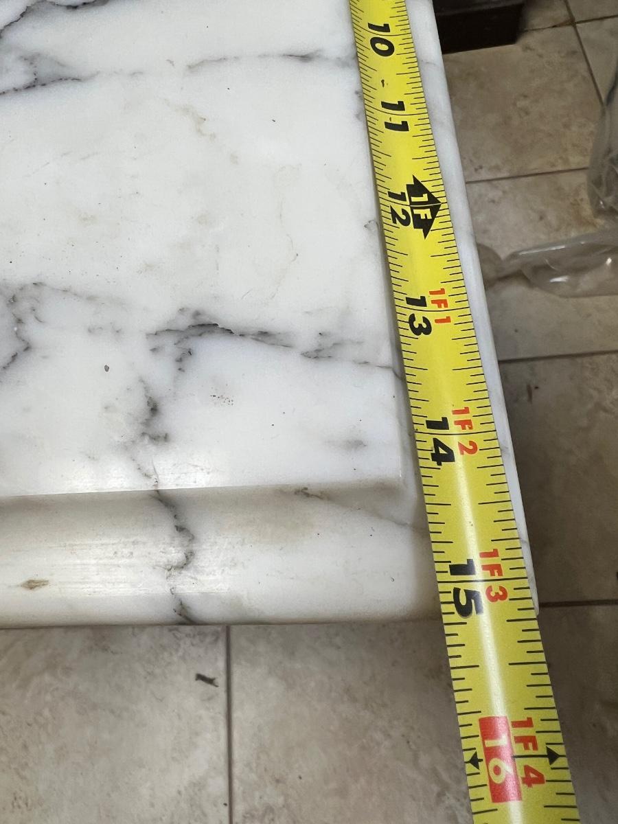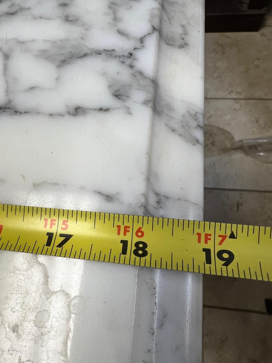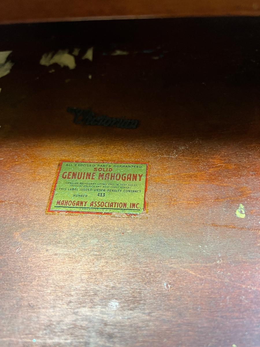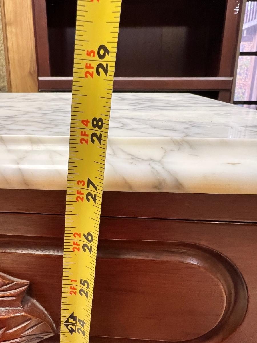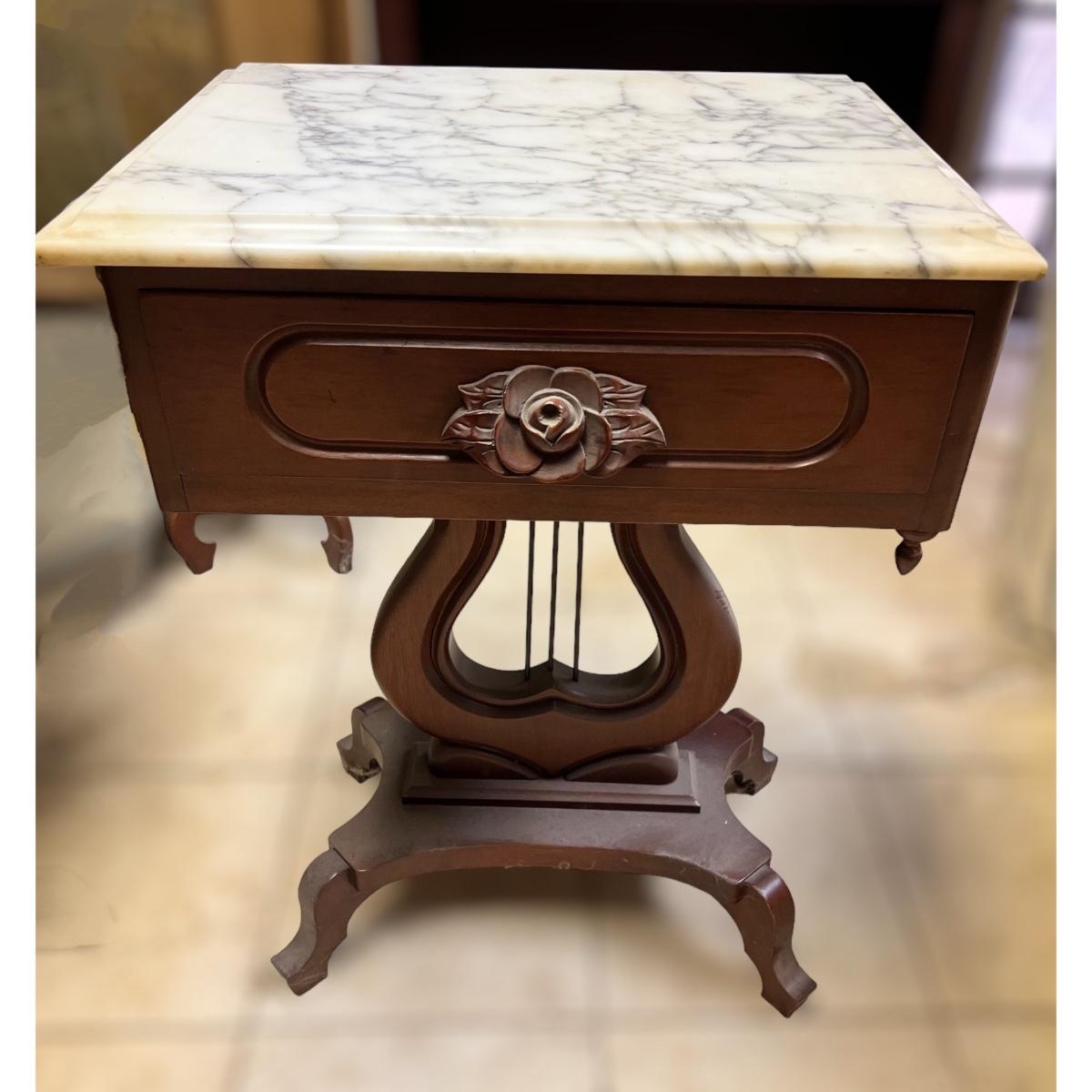 Mahogany table with removable Italian marble top. Measures 19.25"x15"x27.25". white with gray veining. End table consists of one dove-tail drawer with carved wood rose pull. Below the drawer is a carved harp / lyre that sits on platform atop four Queen Anne style feet.. In great condition. Minor wear consistent with age. NOTE: PICK UP ONLY IN DUNKIRK MD.