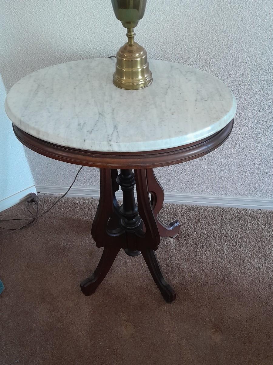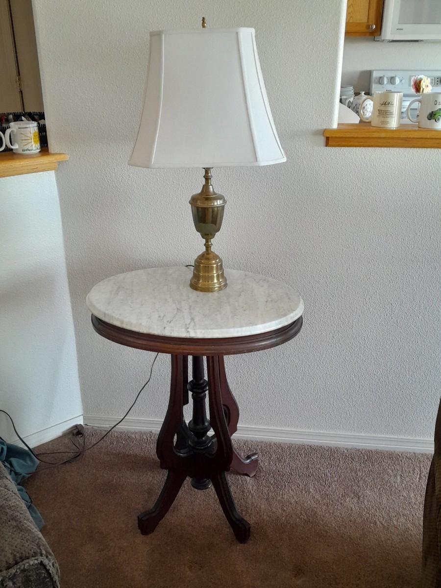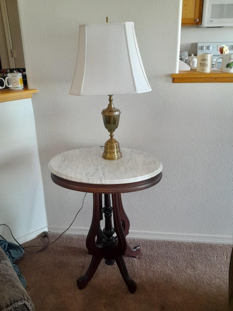 THE TABLE IS 18" ROUND AND 24" TALL, THE LAMP IS 28" TALL