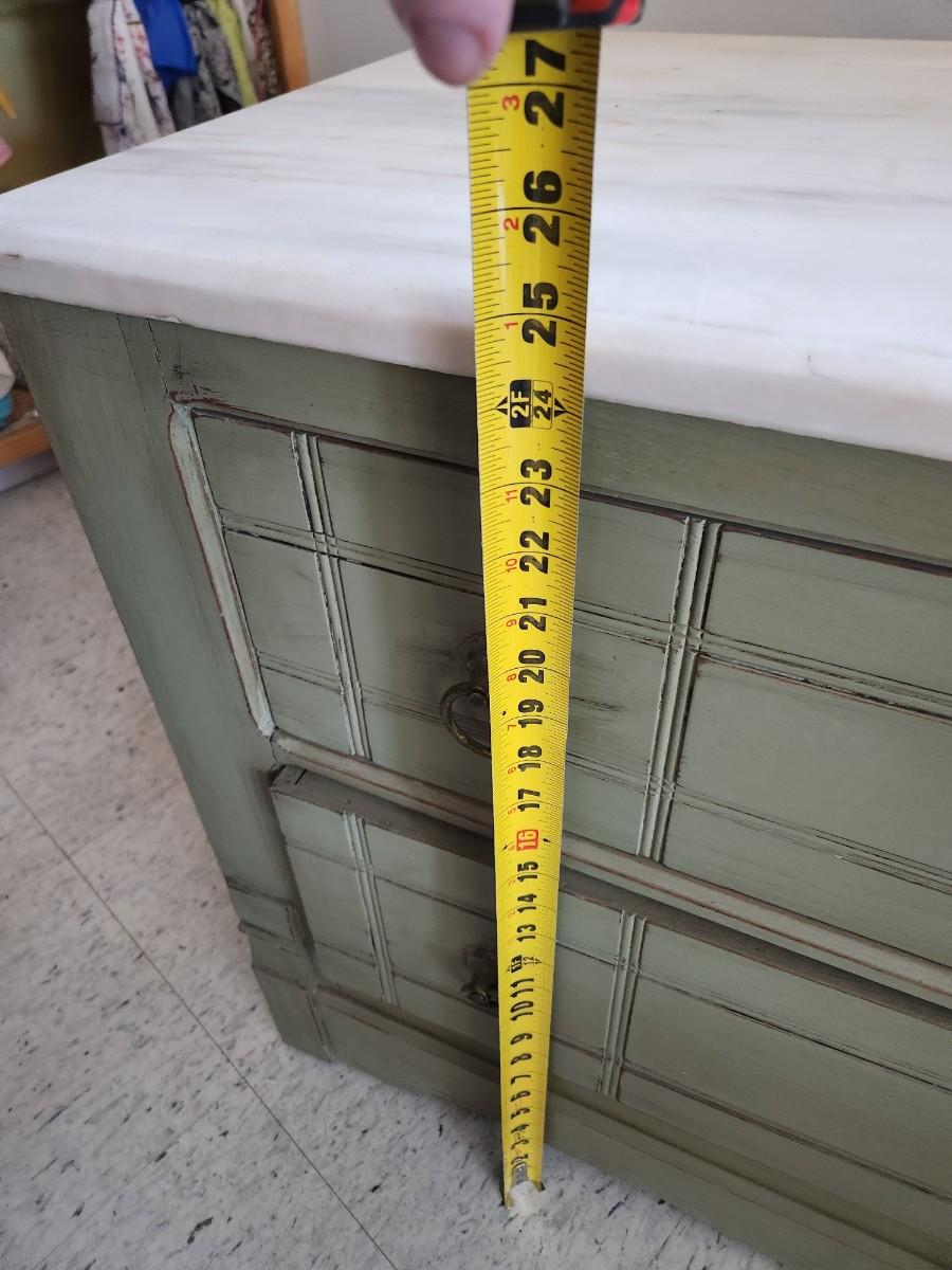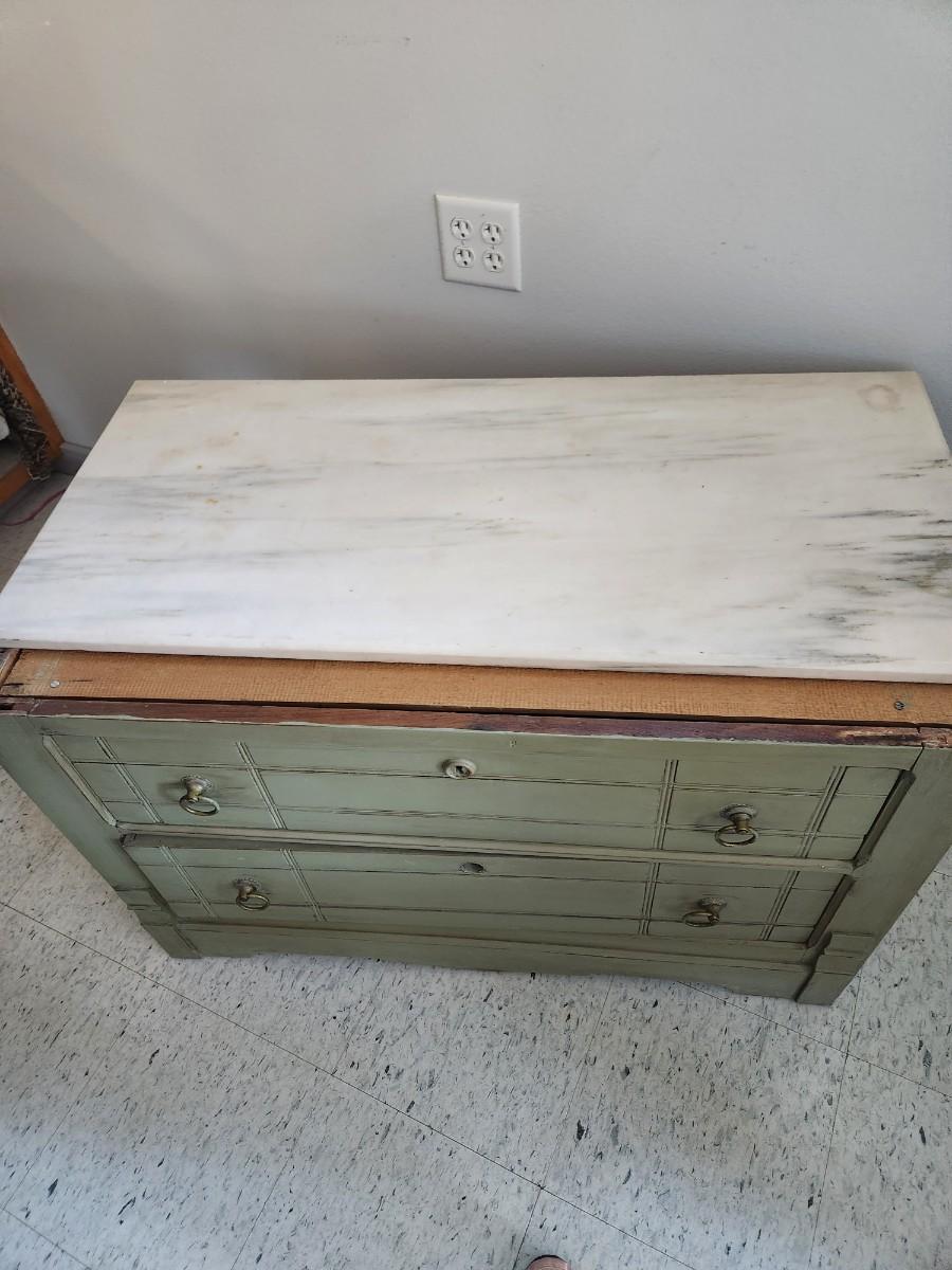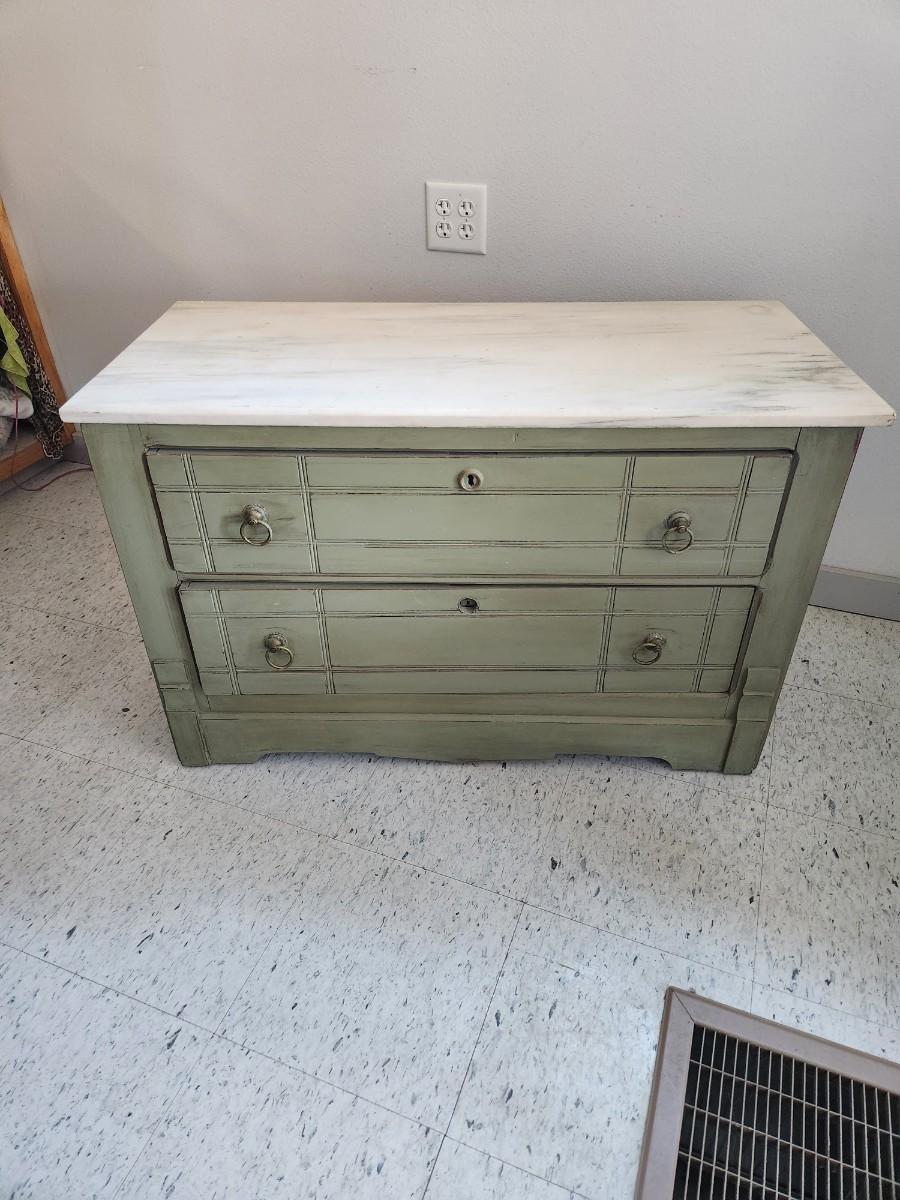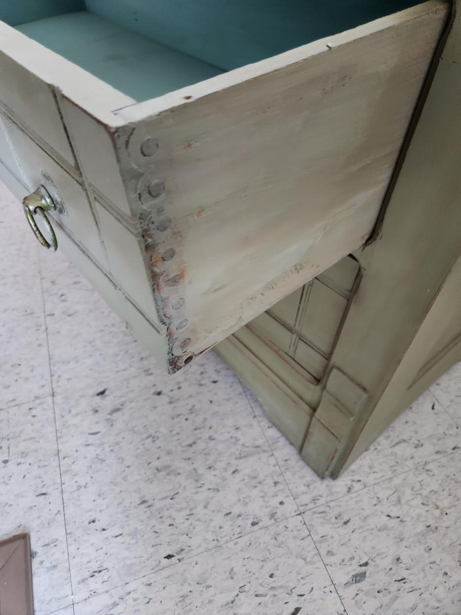 Painted in a soft sage with a pop of aqua in the drawers. Very old piece...marble top comes off. I am thinking bathroom vanity on this one. (Not my refinishing work)