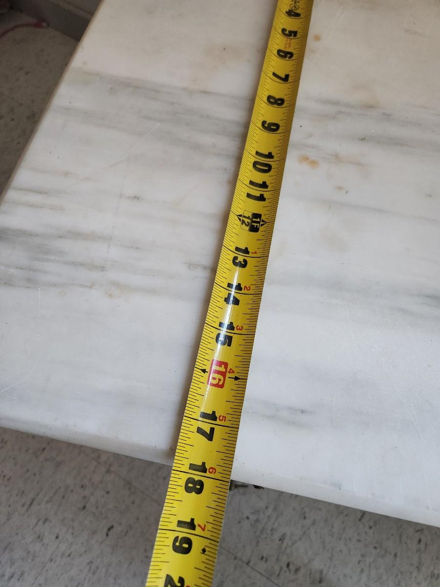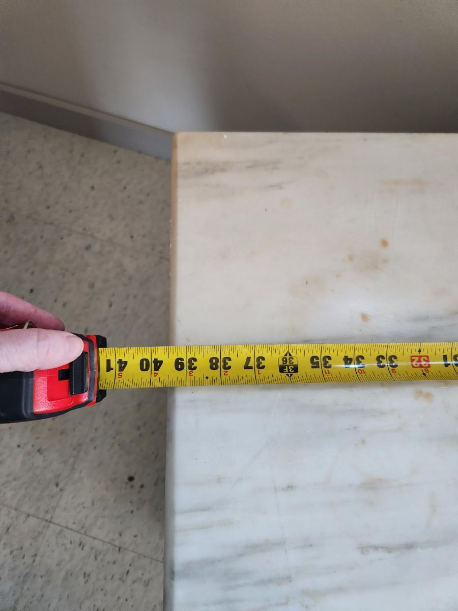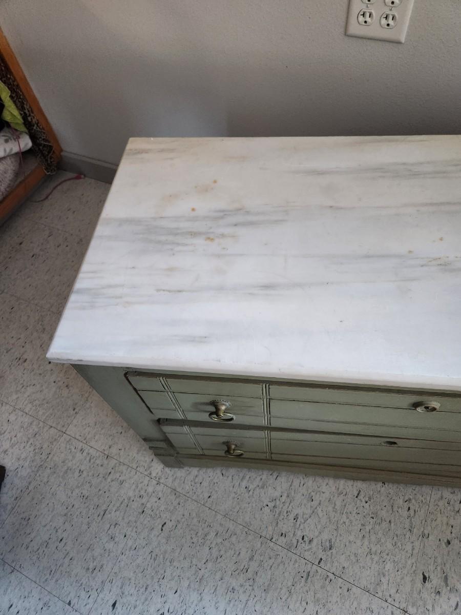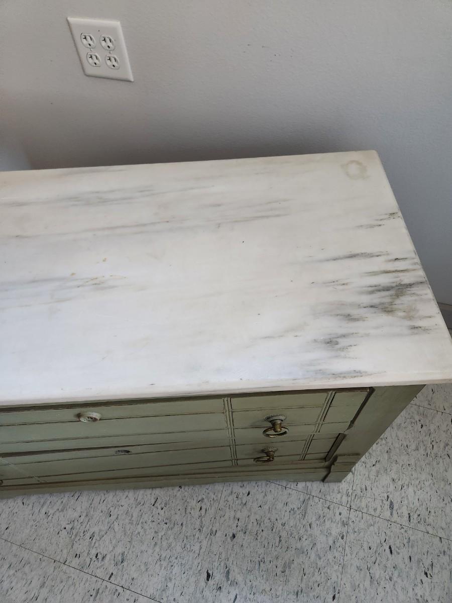 Painted in a soft sage with a pop of aqua in the drawers. Very old piece...marble top comes off. I am thinking bathroom vanity on this one. (Not my refinishing work)