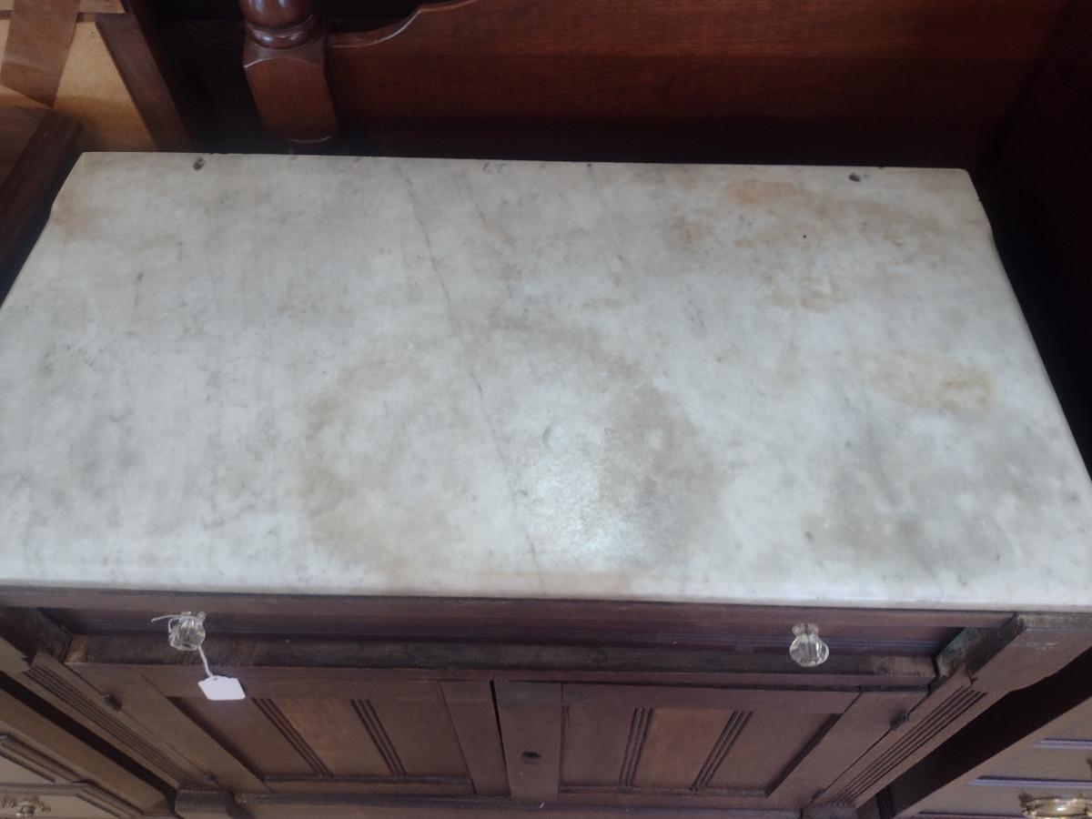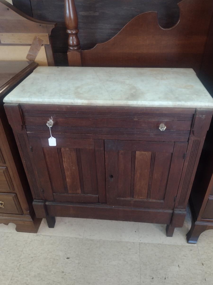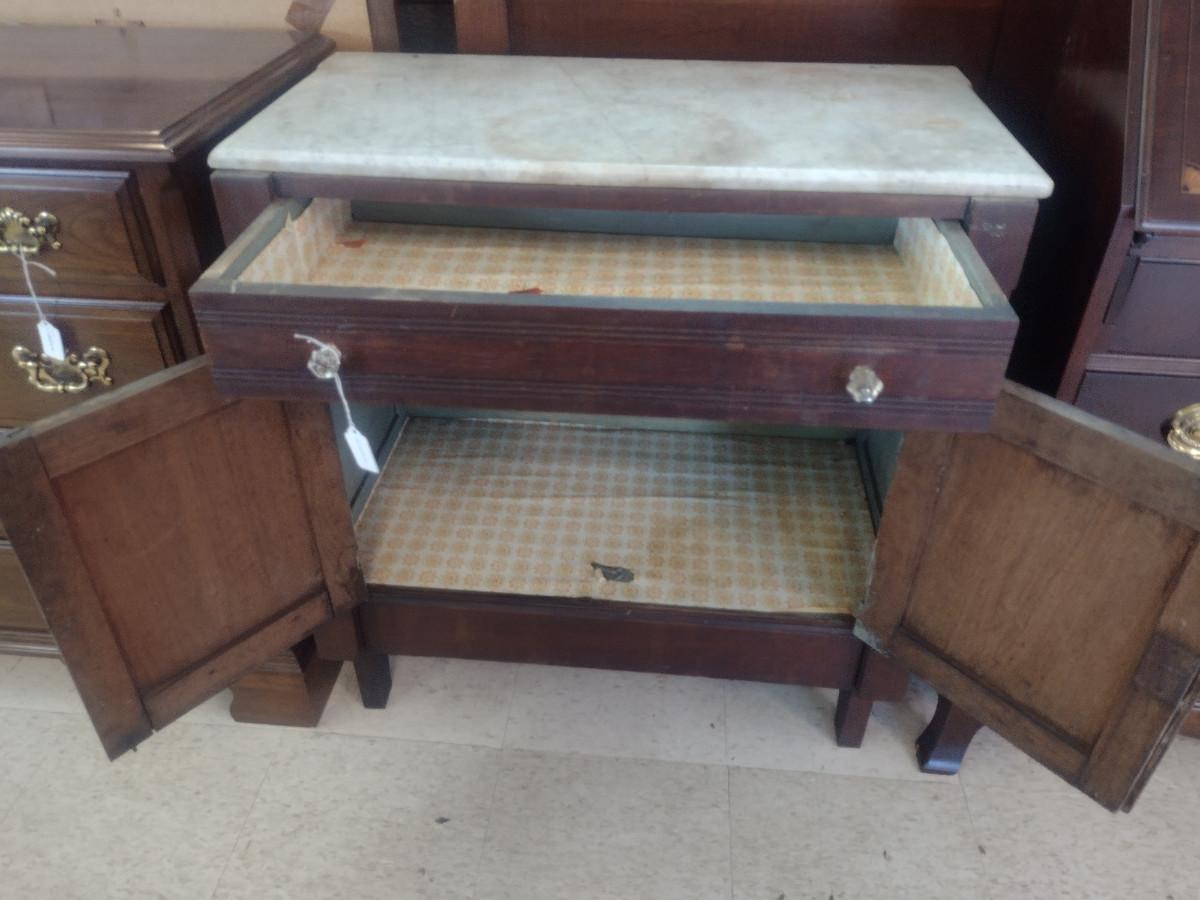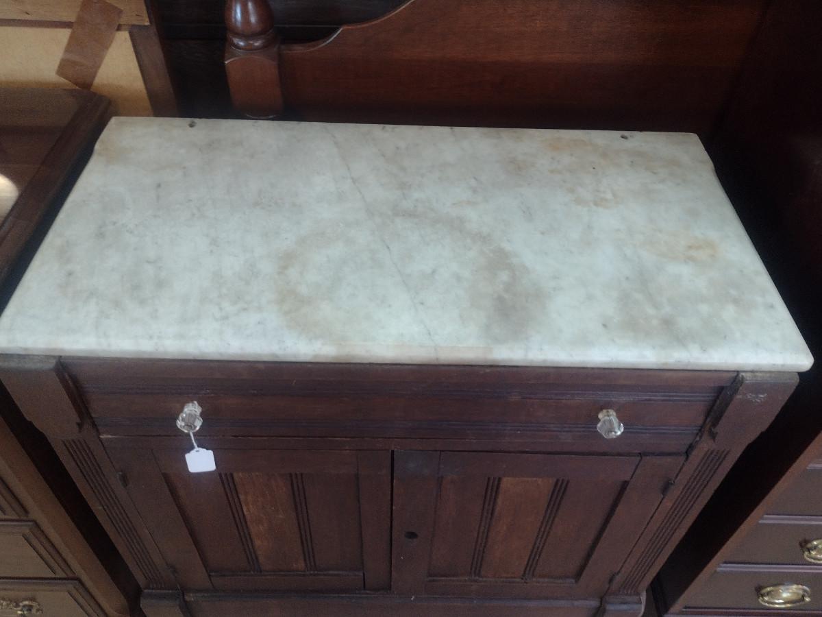 Antique Marble Topped Small Cupboard- Approx 30" x 15 1/2" x 31 3/4" Tall. Marble top is stained- please see all pictures.