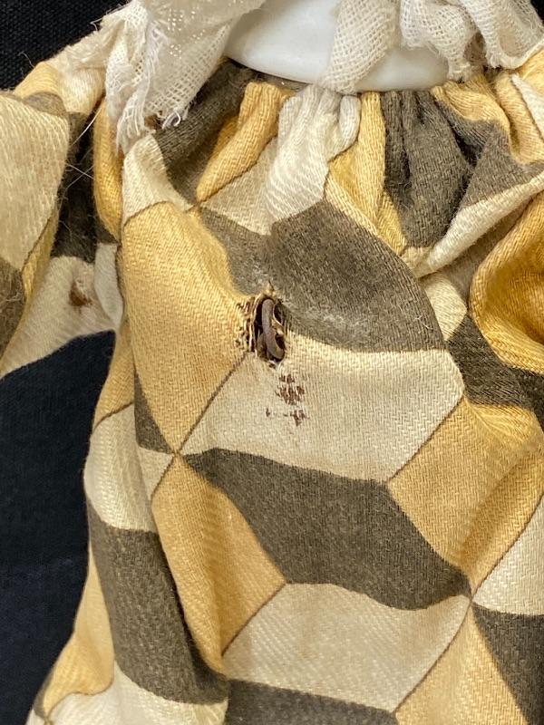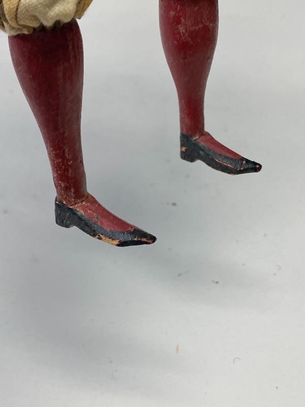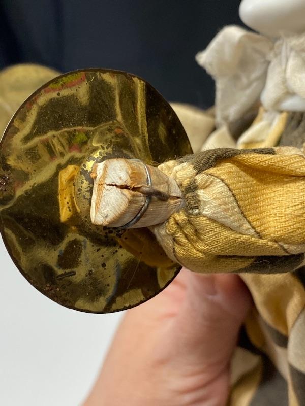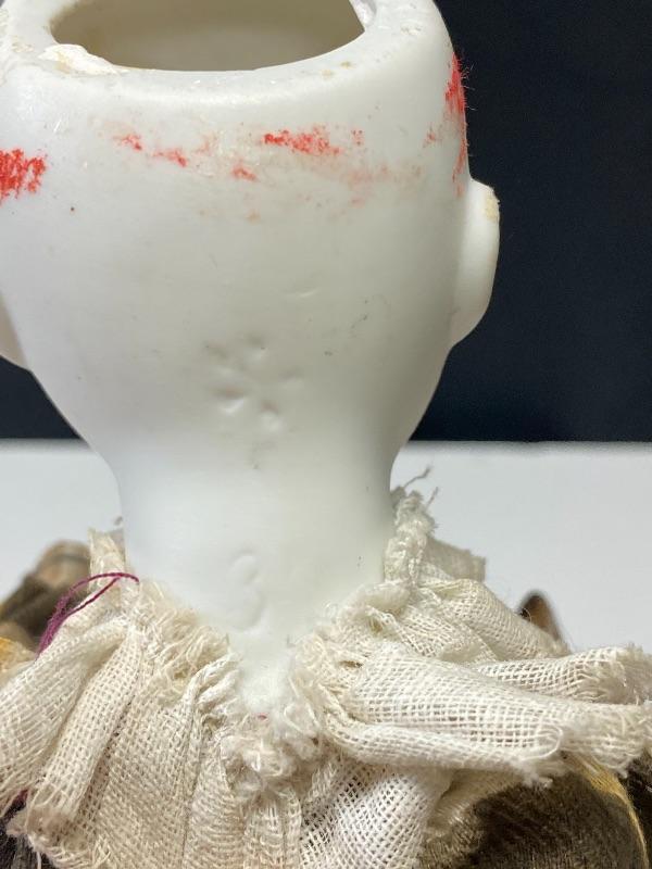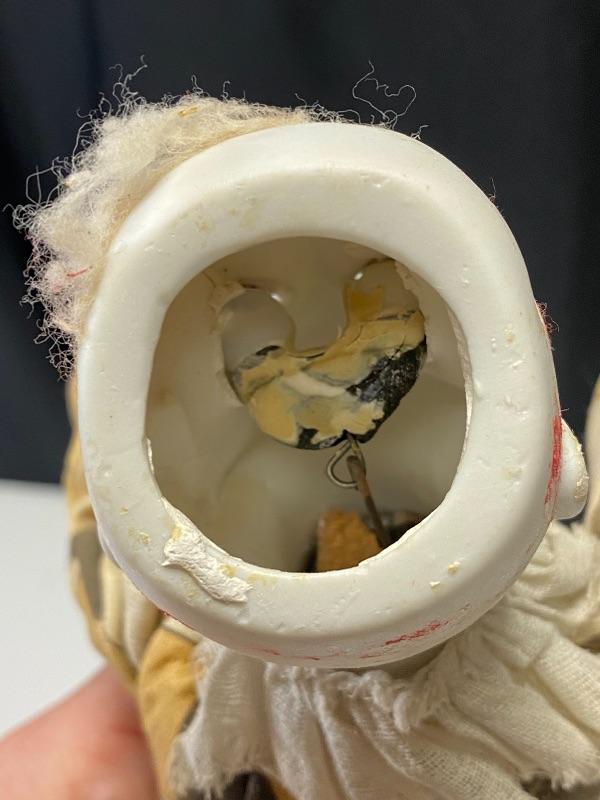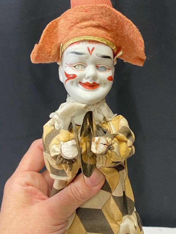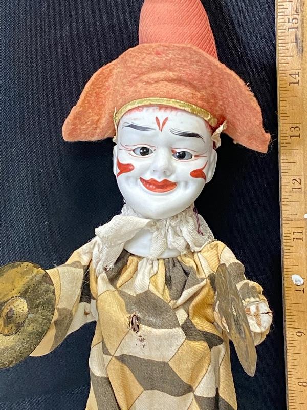 Antique clown squeeze toy. Mechanical toy, when squeezed he plays the cymbals and his eyes roll in his head. Bisque head, marked "3". Wood body. There is discolor and a hole to his outfit. Hat needs to be glued back in place. Face paint is in really good vintage condition. About 13" size.