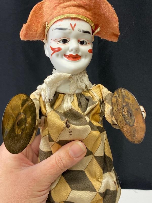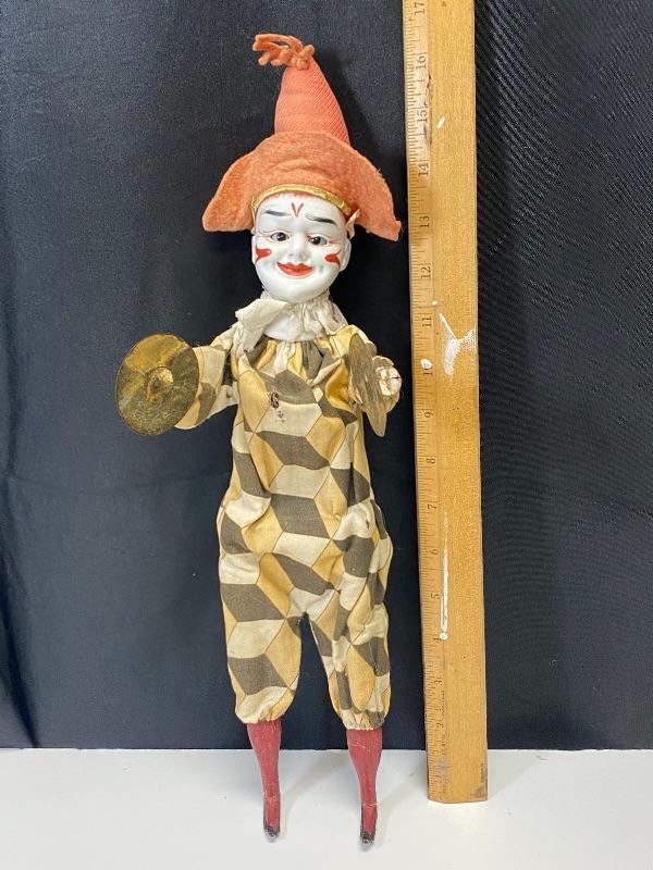 Antique Mechanical Clown Jester Playing Cymbals Squeeze Toy YD#020-1220-01316