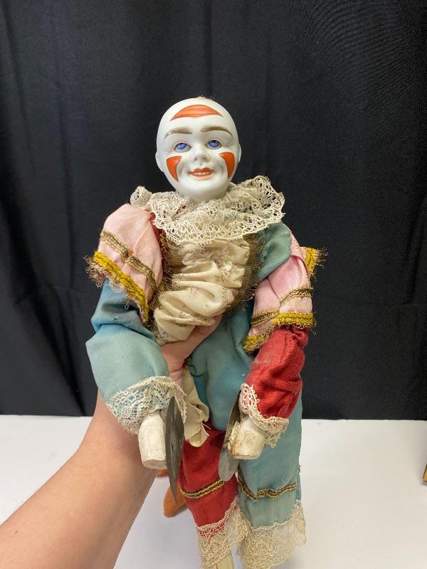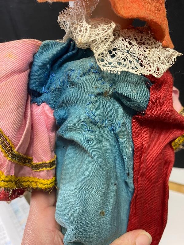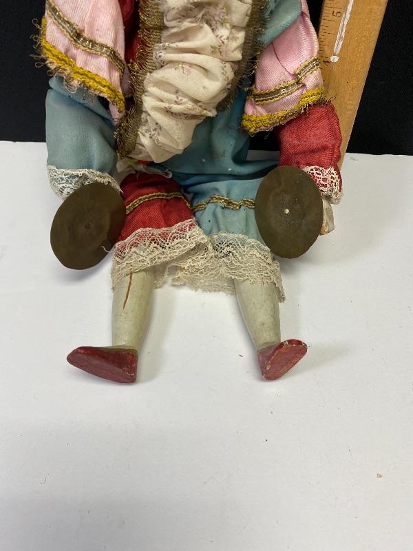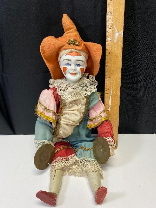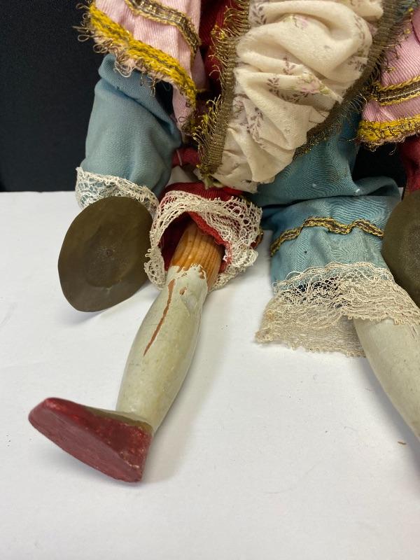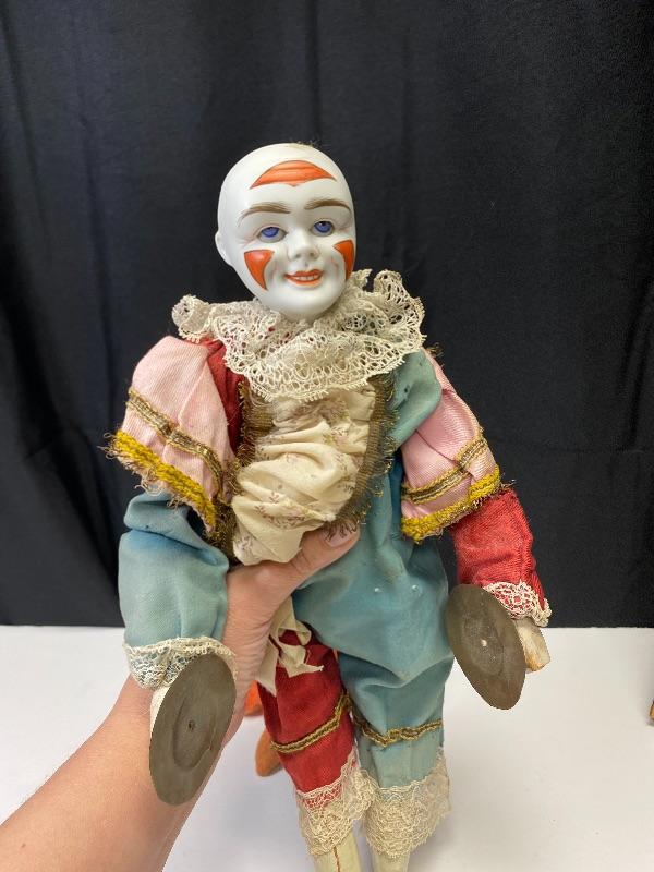 Antique mechanical squeeze toy clown. This one plays his cymbals when squeezed and music when released. Sounds like a music box but only plays a few notes at a time, you would have to continually squeeze and release to play a whole tune. Bisque head has rolling eyes in it but they are not attached, cotton is keeping them fixed. In good condition, has some discolor from age and display. Clothes have seen better days, blue fabric has been repaired. Marked 157/7 on back of head.