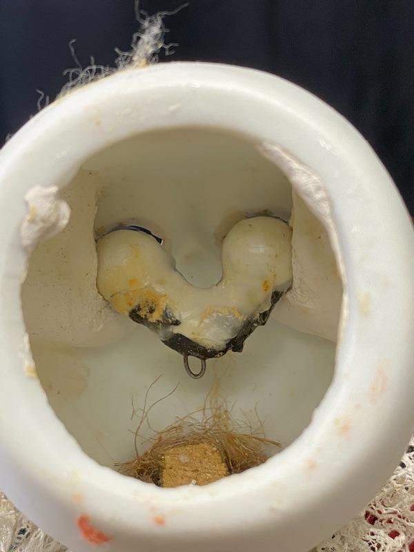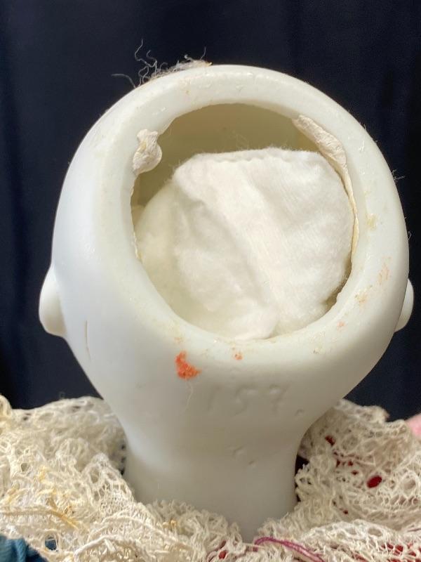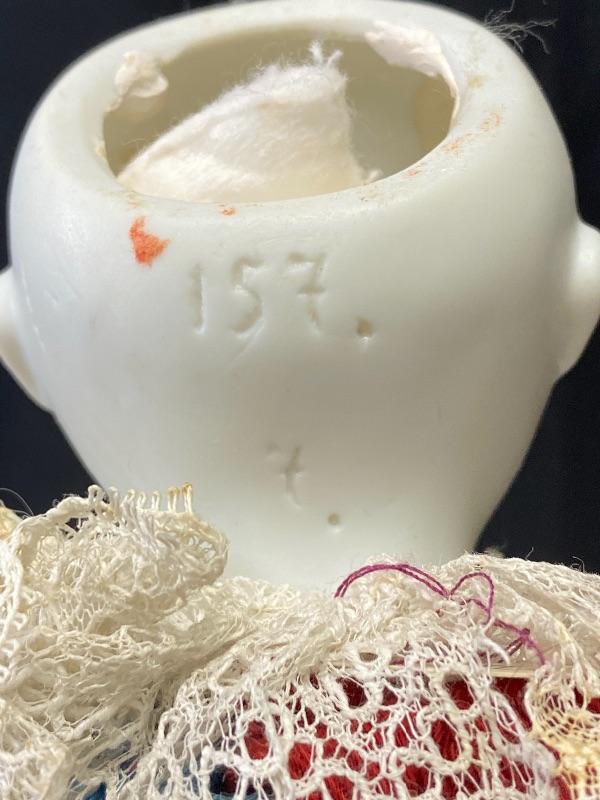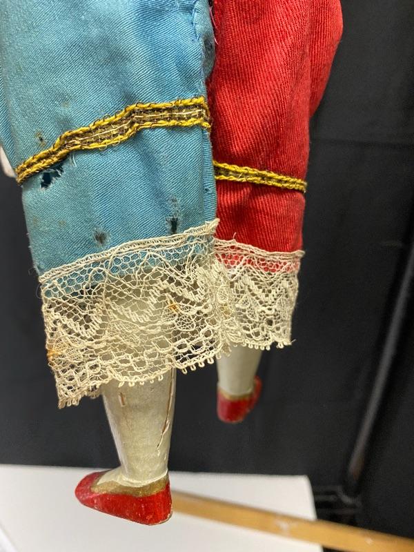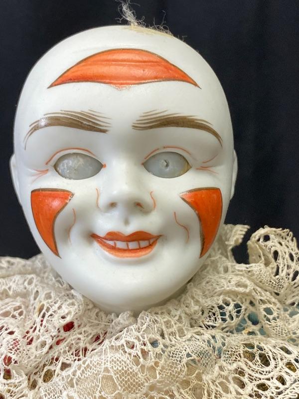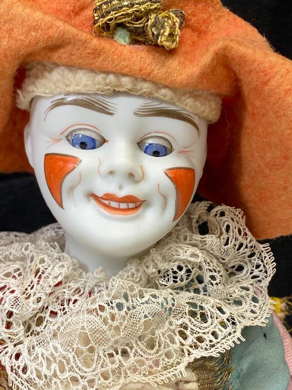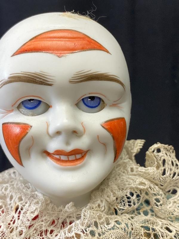 Antique mechanical squeeze toy clown. This one plays his cymbals when squeezed and music when released. Sounds like a music box but only plays a few notes at a time, you would have to continually squeeze and release to play a whole tune. Bisque head has rolling eyes in it but they are not attached, cotton is keeping them fixed. In good condition, has some discolor from age and display. Clothes have seen better days, blue fabric has been repaired. Marked 157/7 on back of head.