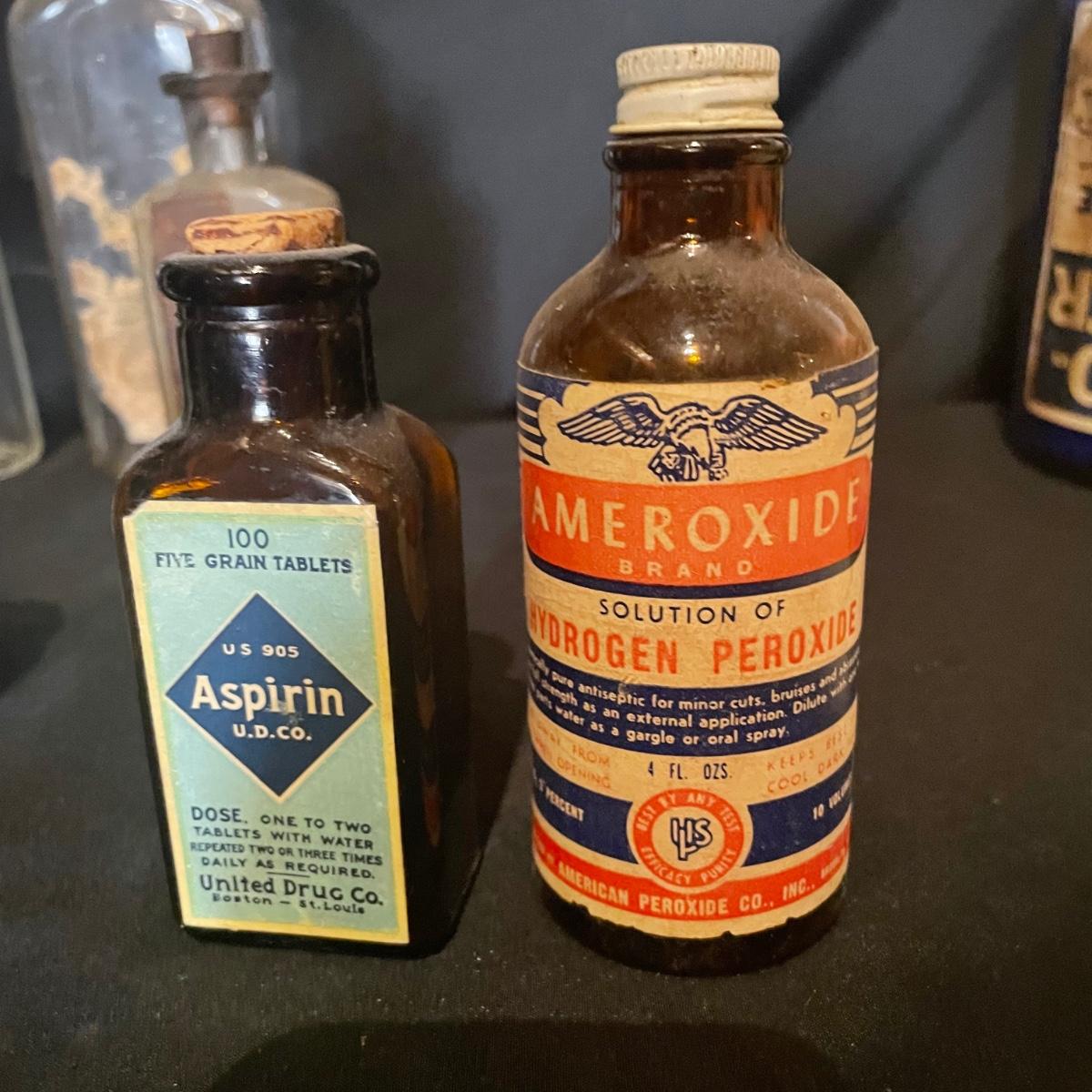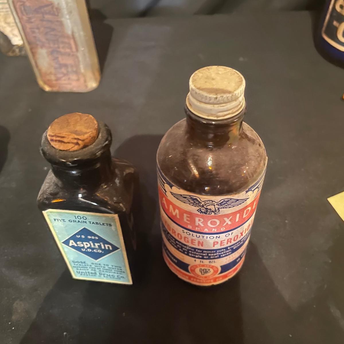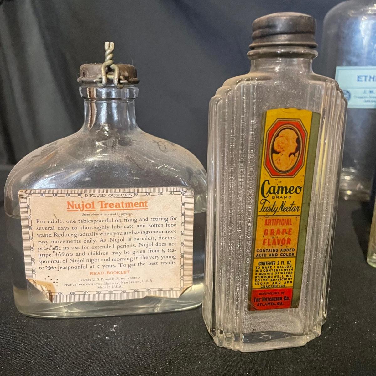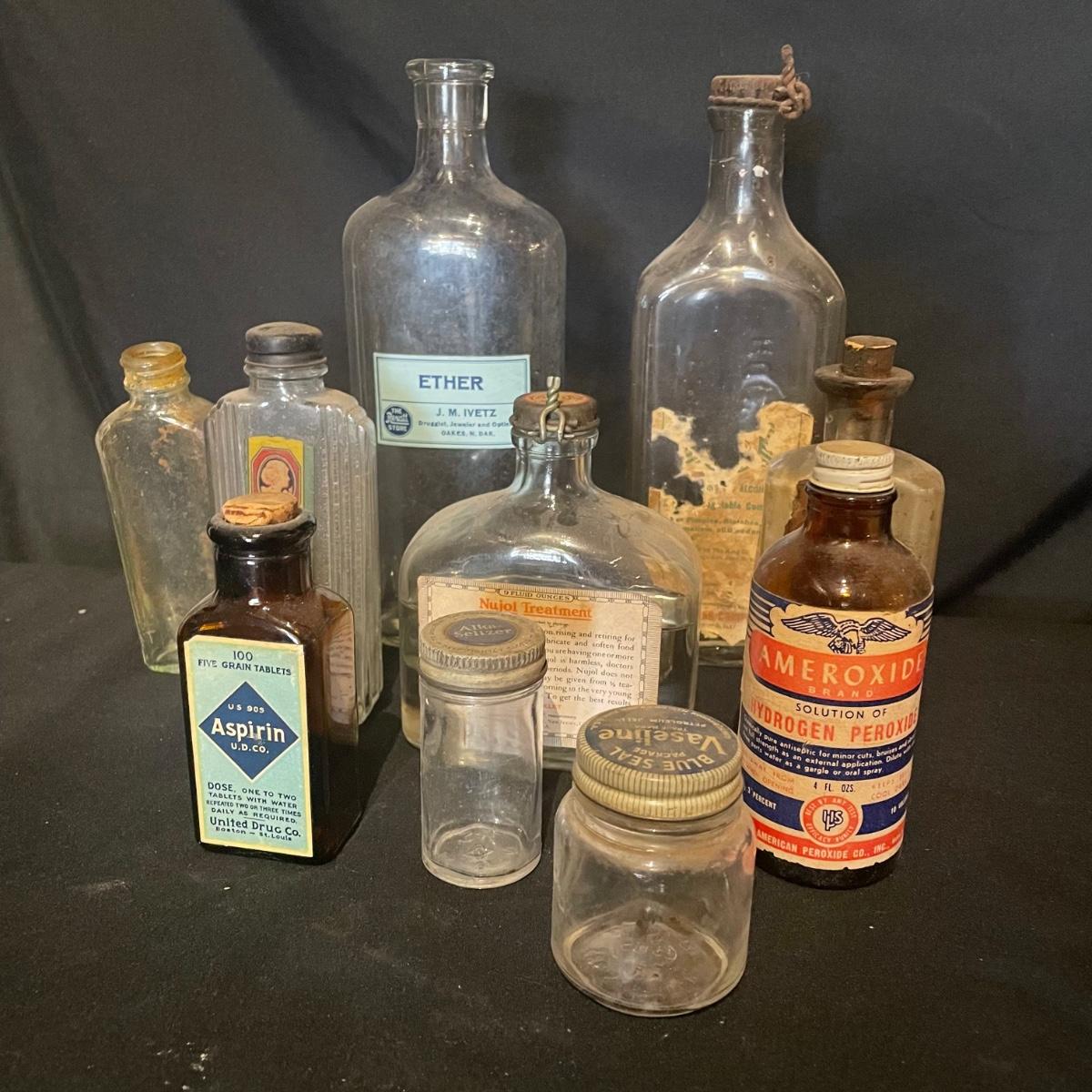 Ten antique items here that include a variety of medicine bottles and jars. Most are empty except the hydrogen peroxide and Nujol treatment.