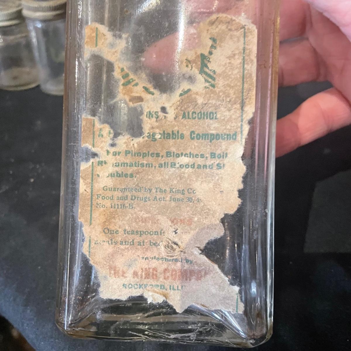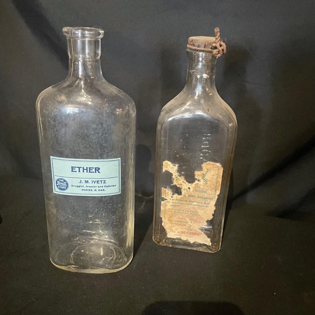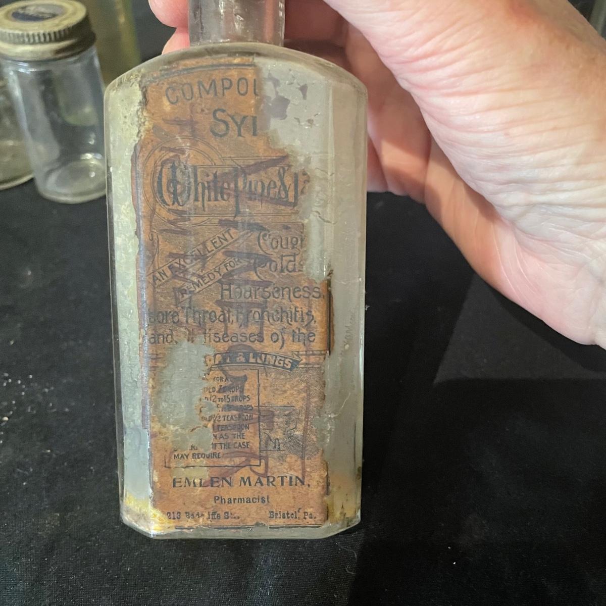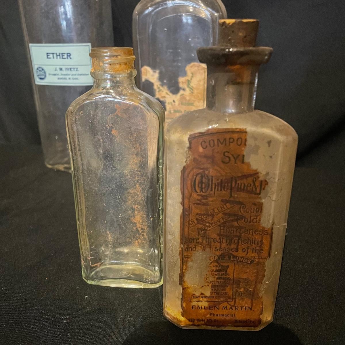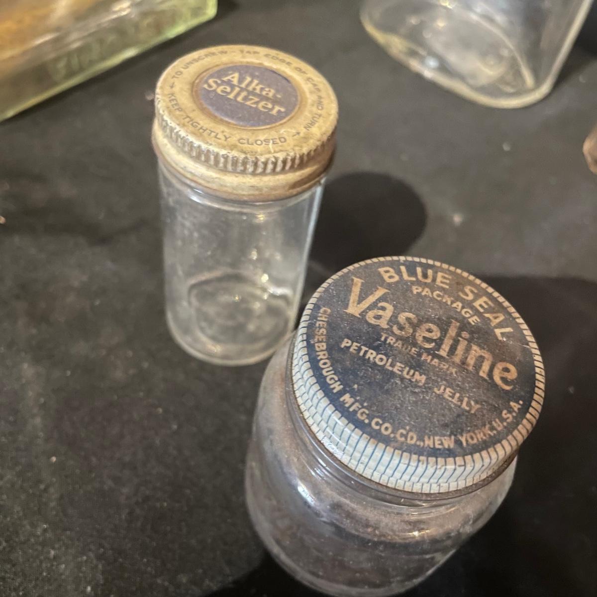 Ten antique items here that include a variety of medicine bottles and jars. Most are empty except the hydrogen peroxide and Nujol treatment.