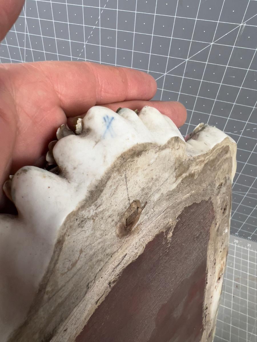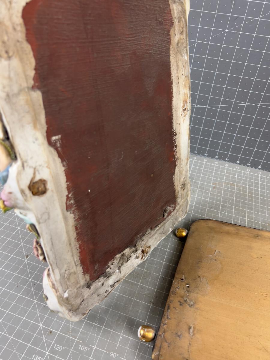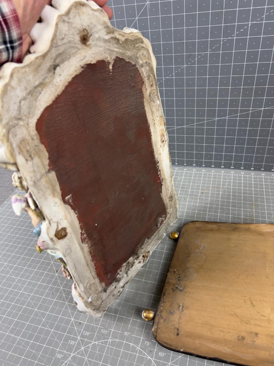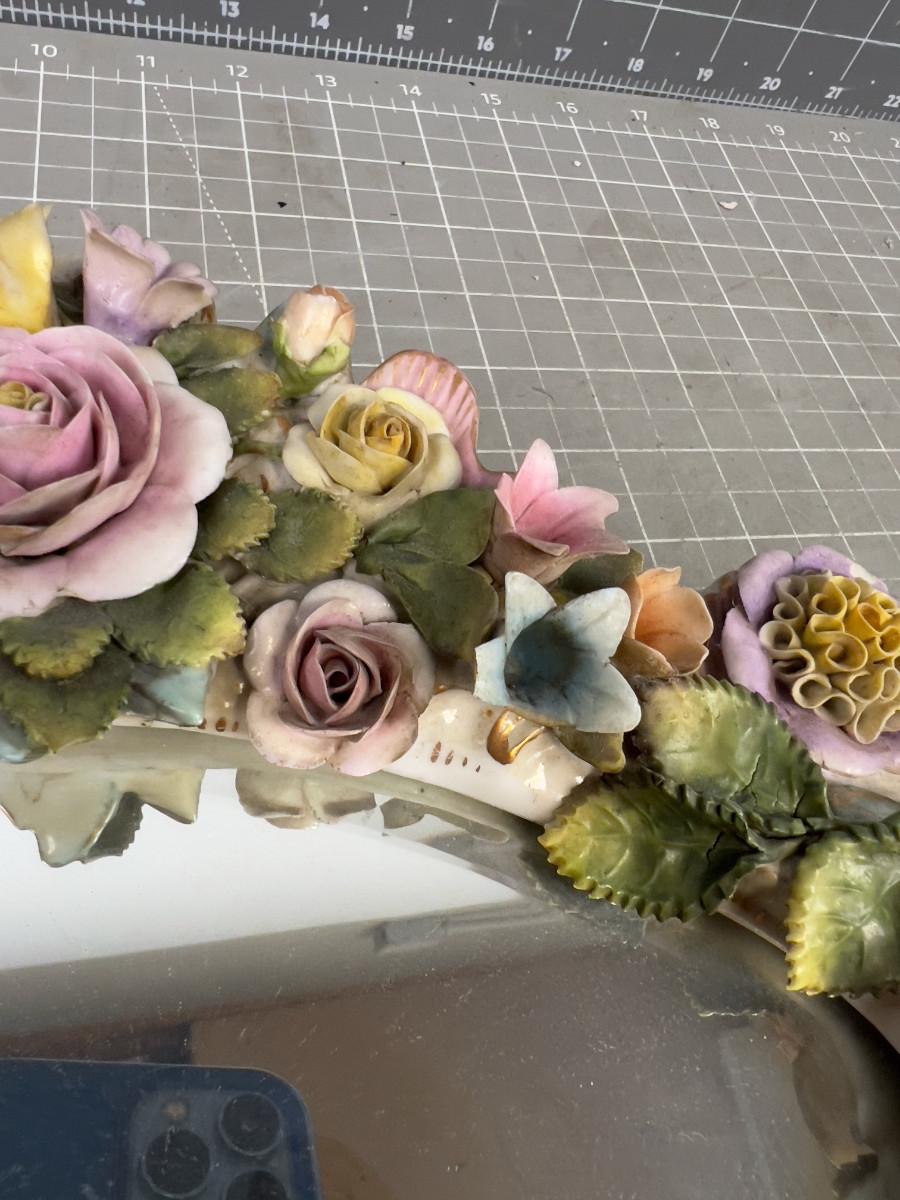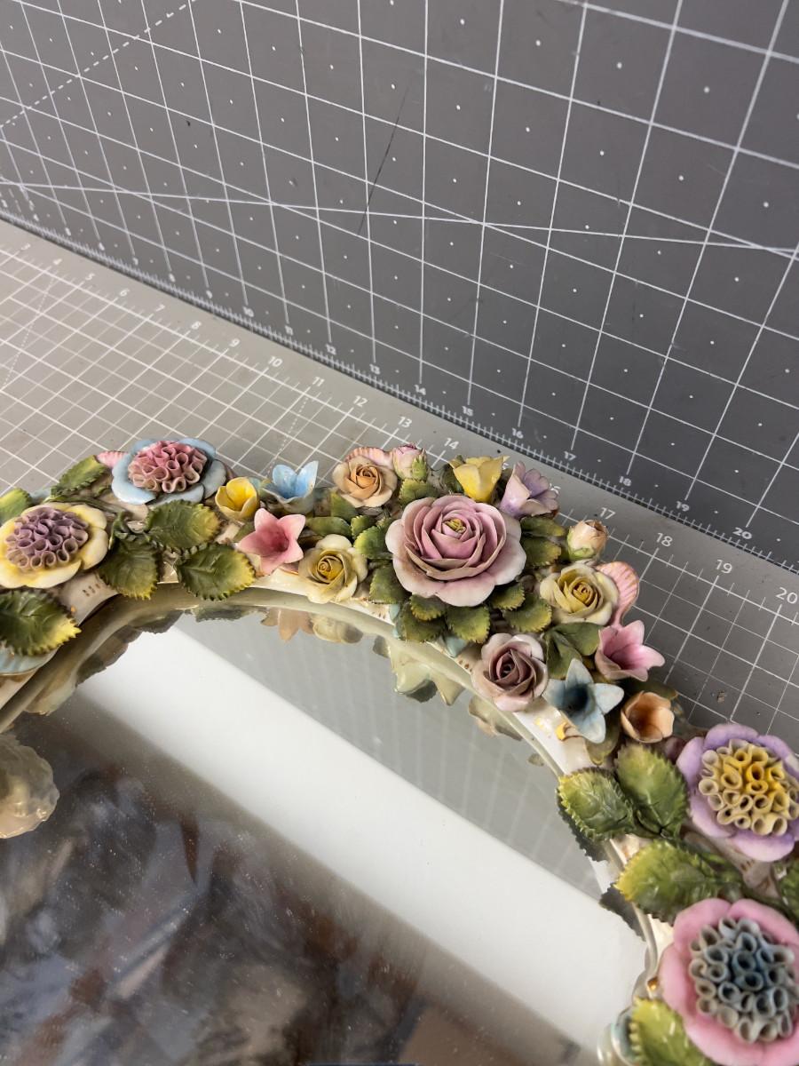 Some minor Damage to the flowers. IMPRESSIVE. PRETTY! Old! The Mirror is coming off and will need to be glued or repaired.