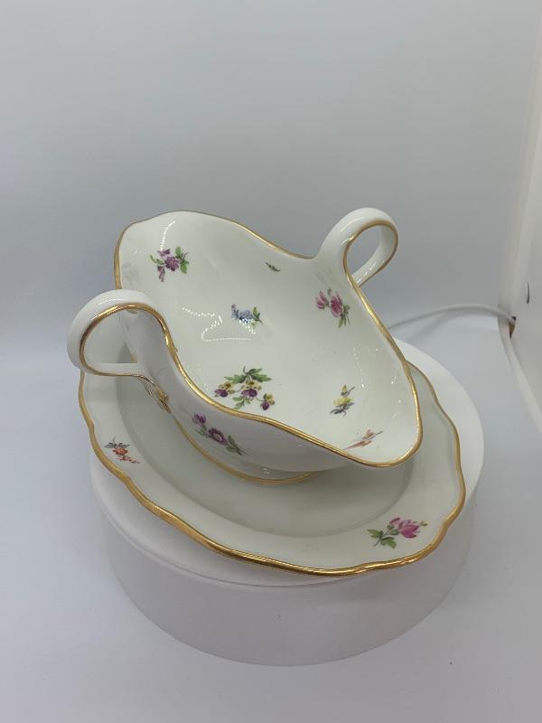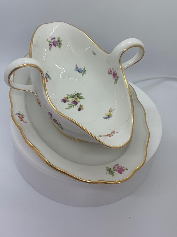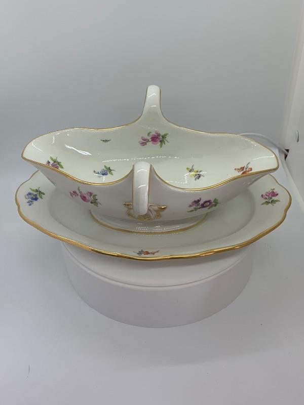 Antique Meissen scattered flowers pattern Hand Painted Porcelain Gravy Boat with attached Underplate