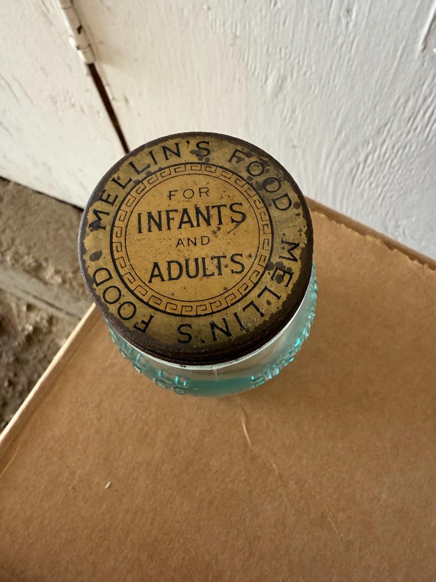 Antique Mellins Food Co Food Old Dairy Bottles Antique Milk Bottles Milk Infants Adults Aqua Blue Milk Bottles with lids General Store Props