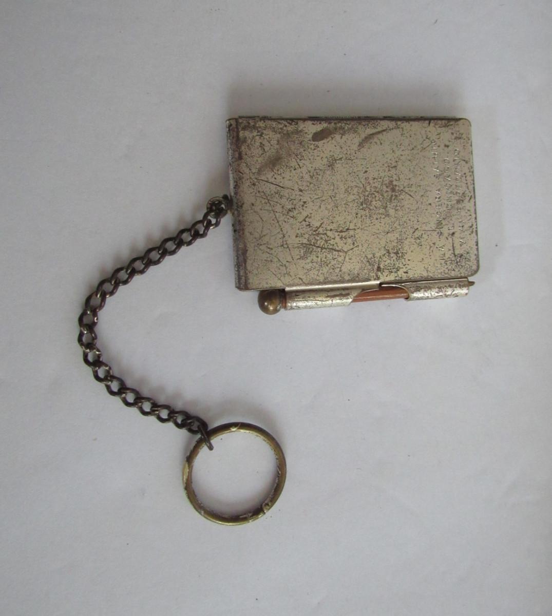 Wear on metal cover. Pencil is good and paper looks unused. Chain may be a replacement. Shipping is available at actual shipping cost plus $5.00 handling fee per box for supplies/labor. See our terms for details. All sales are final. Condition notes may not be all inclusive, we may miss some issues as most vintage items are not in mint condition and have some degree of wear, paint loss, etc, but we always try to note obvious damage.