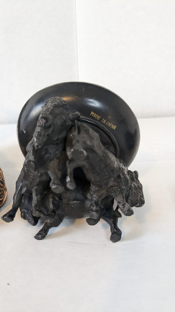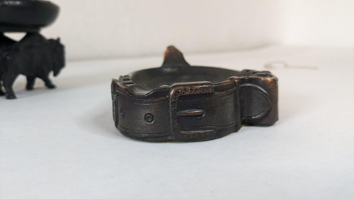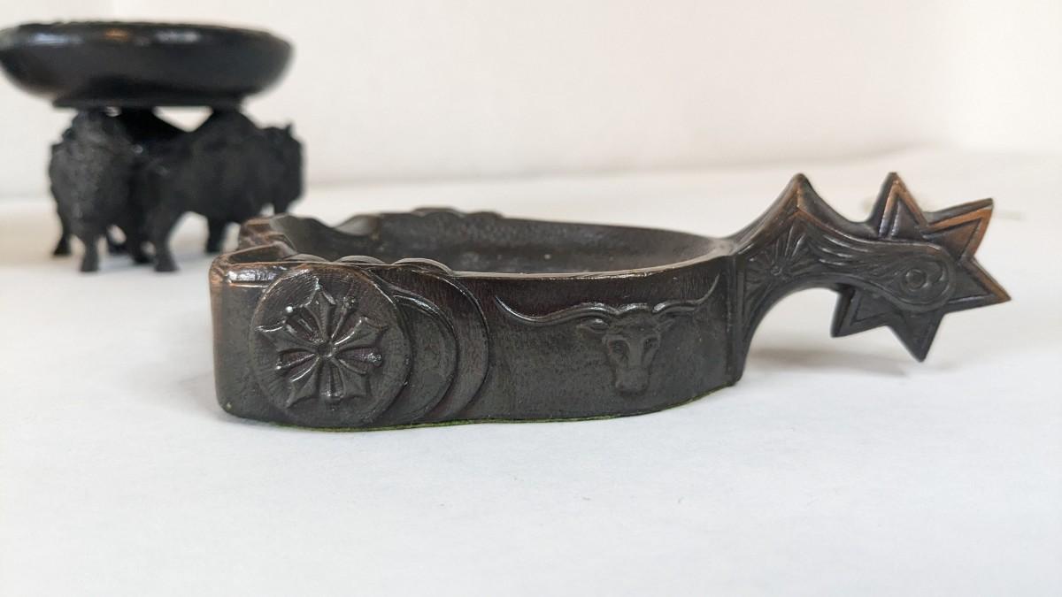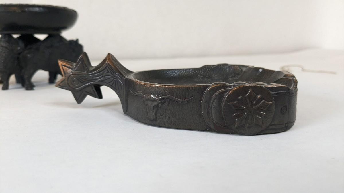(3) Varied metal ashtrays, 2 copper and 1 black composite. Each have an incredible ranch/cabin feel, two are clearly used but still in good shape with bison piece showing almost zero wear