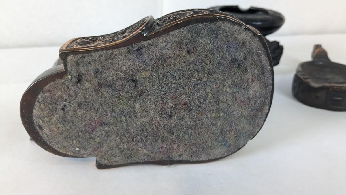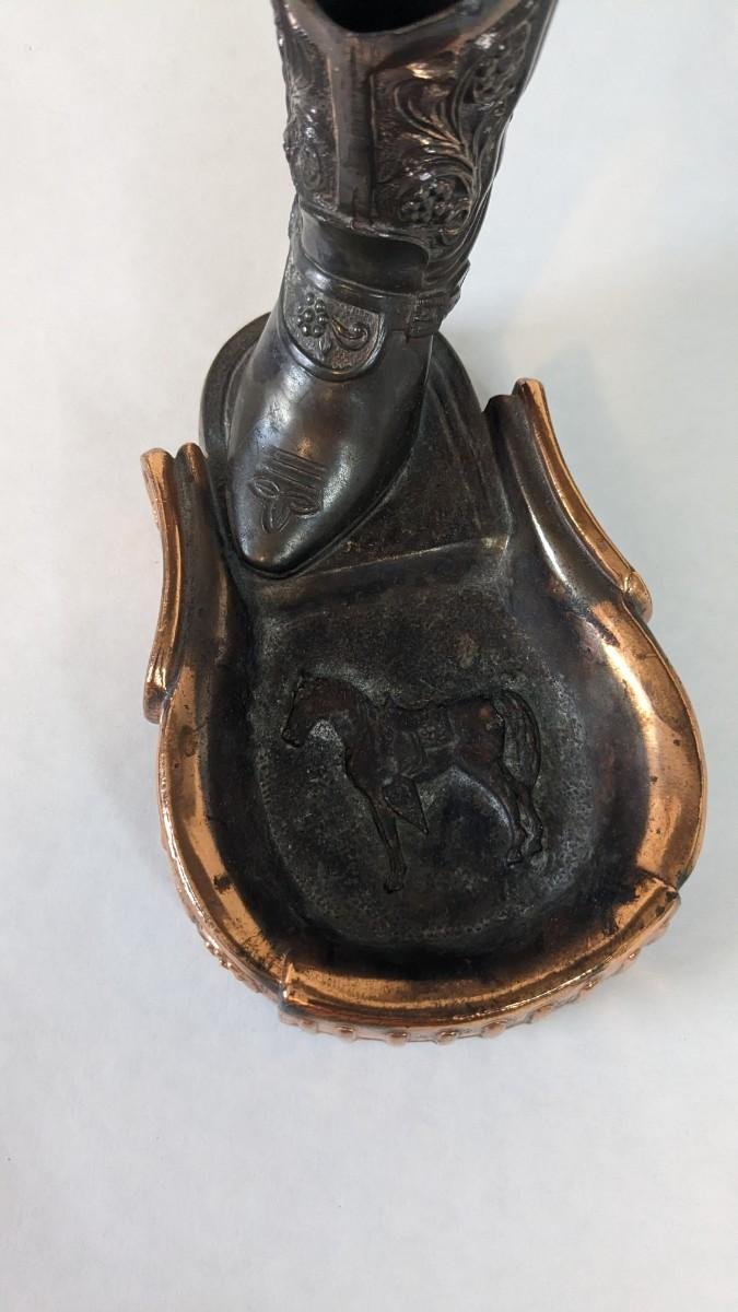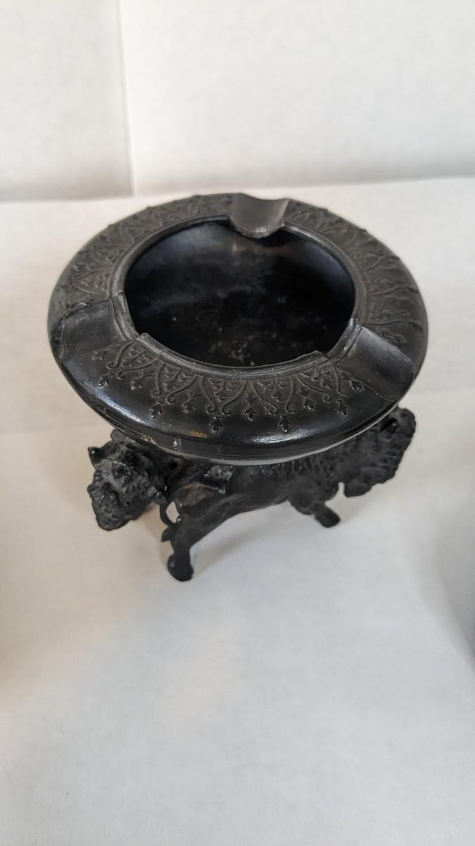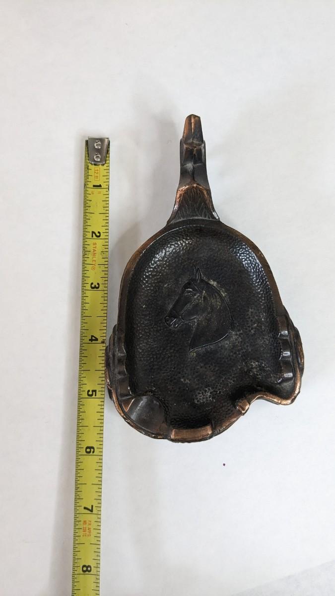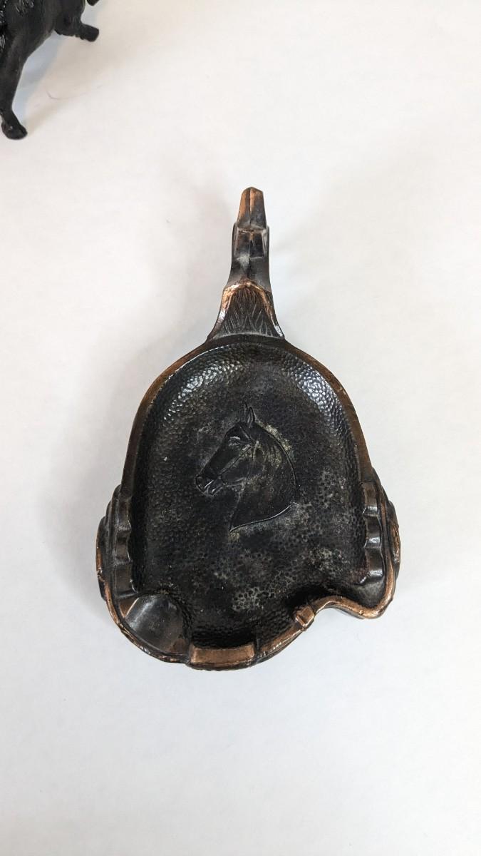 (3) Varied metal ashtrays, 2 copper and 1 black composite. Each have an incredible ranch/cabin feel, two are clearly used but still in good shape with bison piece showing almost zero wear