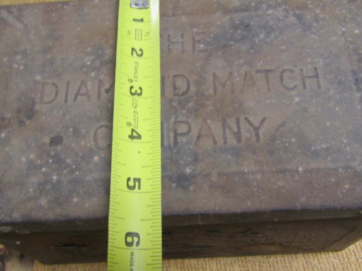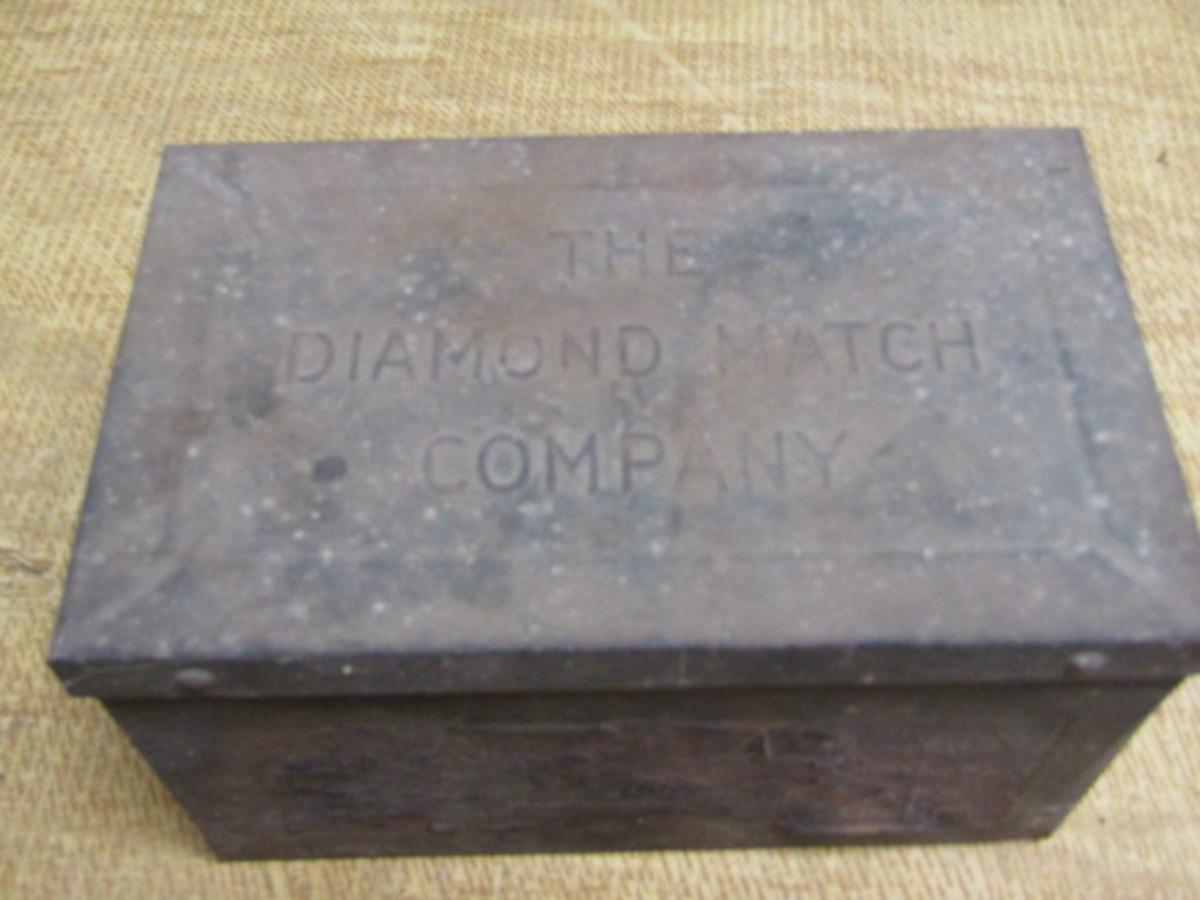 Antique Metal Box from the Diamond Match Company- Approx 8 3/4" x 5 1/2" x 5 1/4" Tall. Stored in non-climatized basement so expect item may need to be cleaned. Will ship in as is condition.