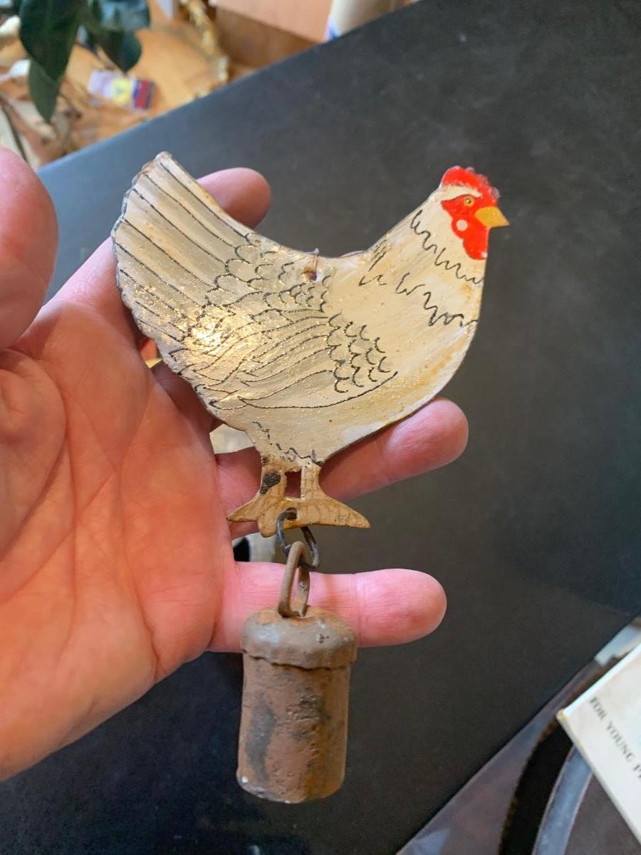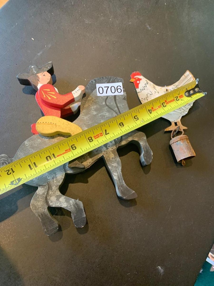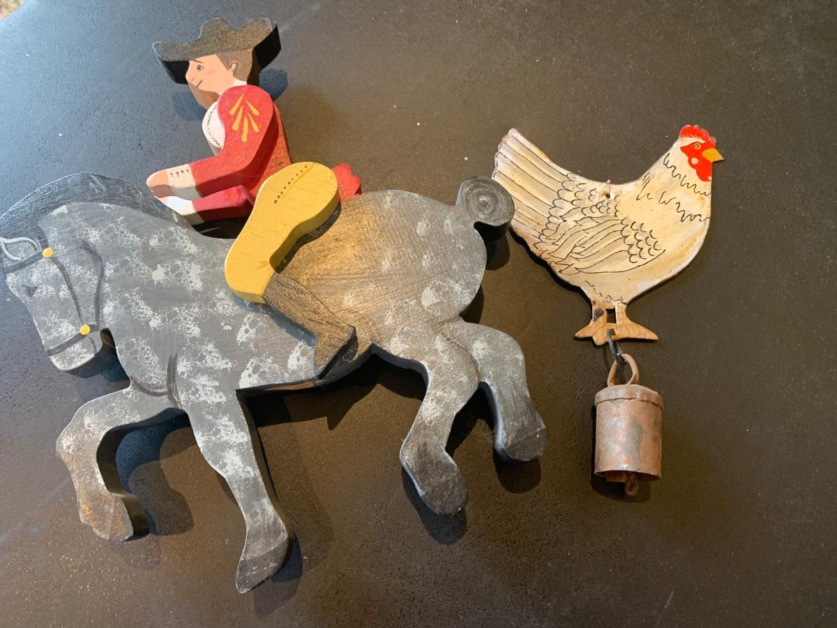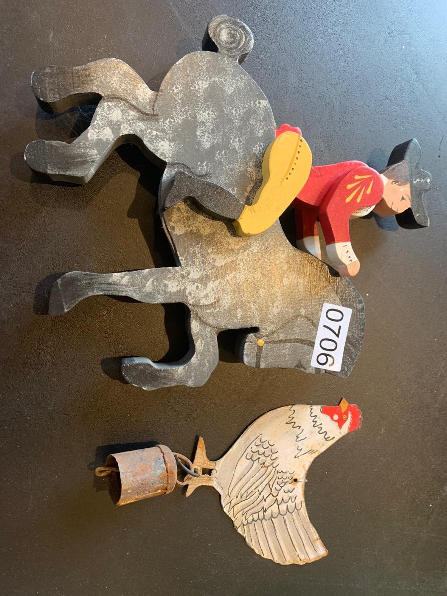 Antique Metal Chicken w Bell + Wooden Soldier/Horse