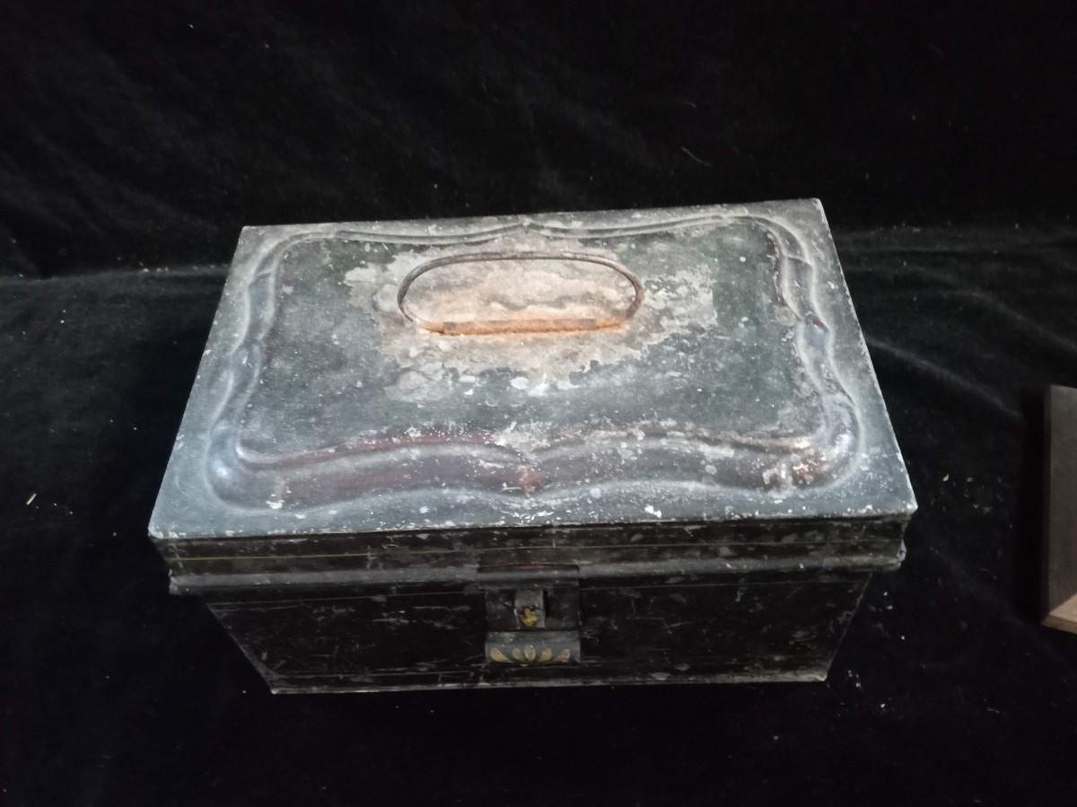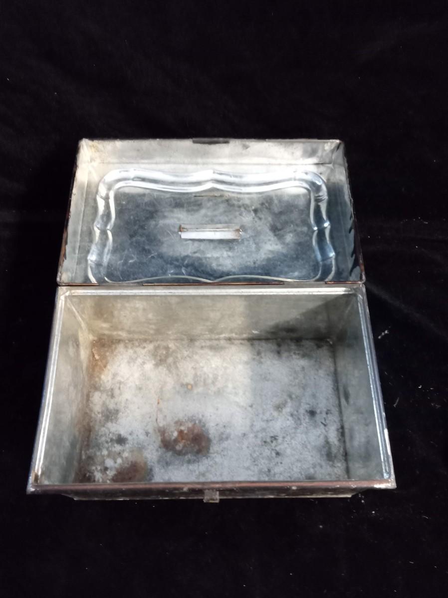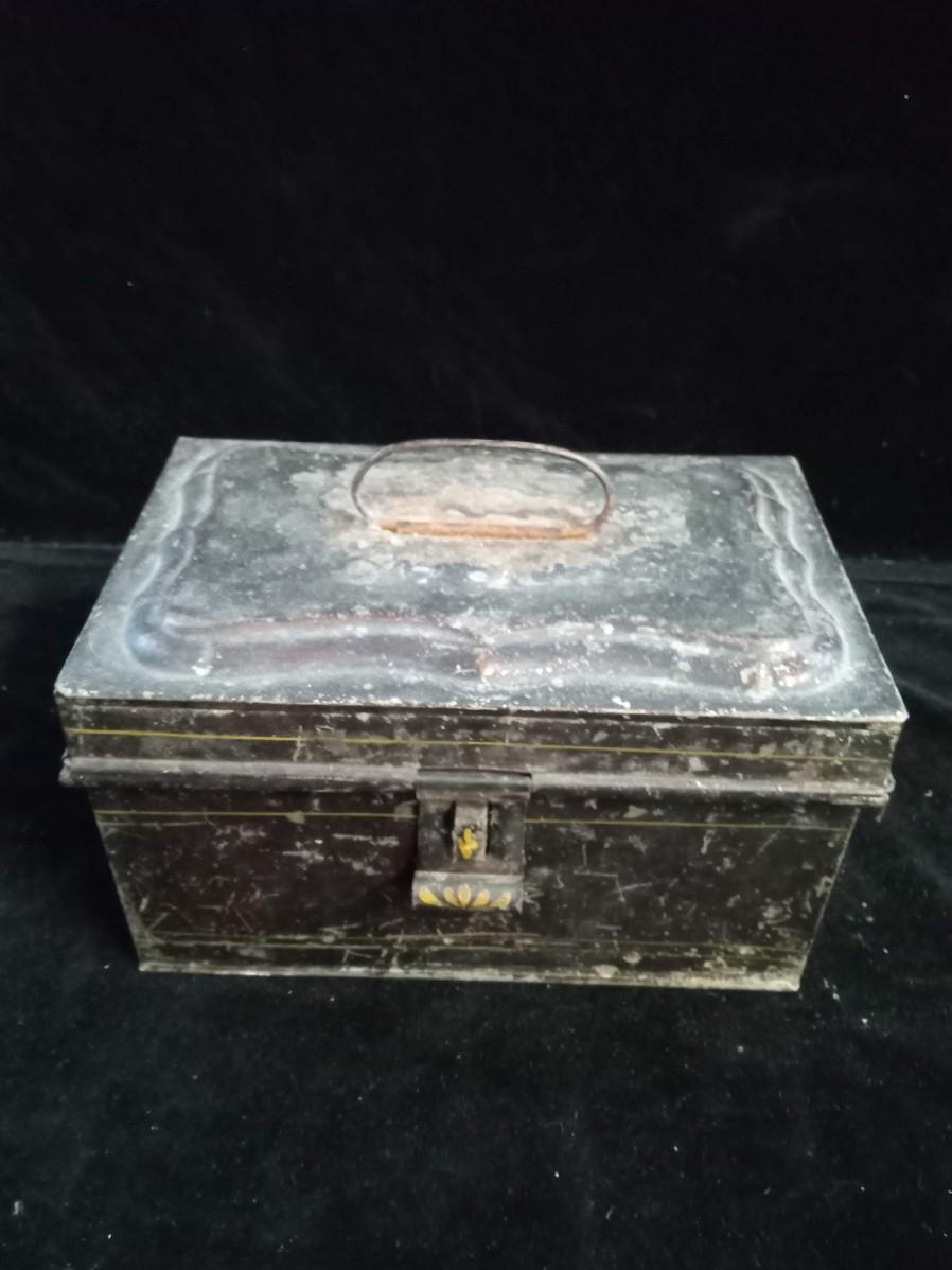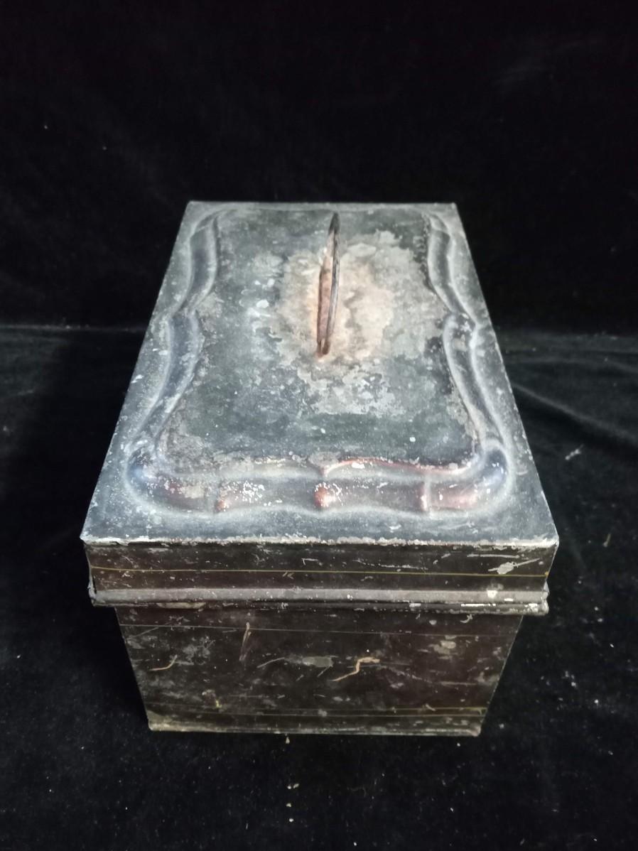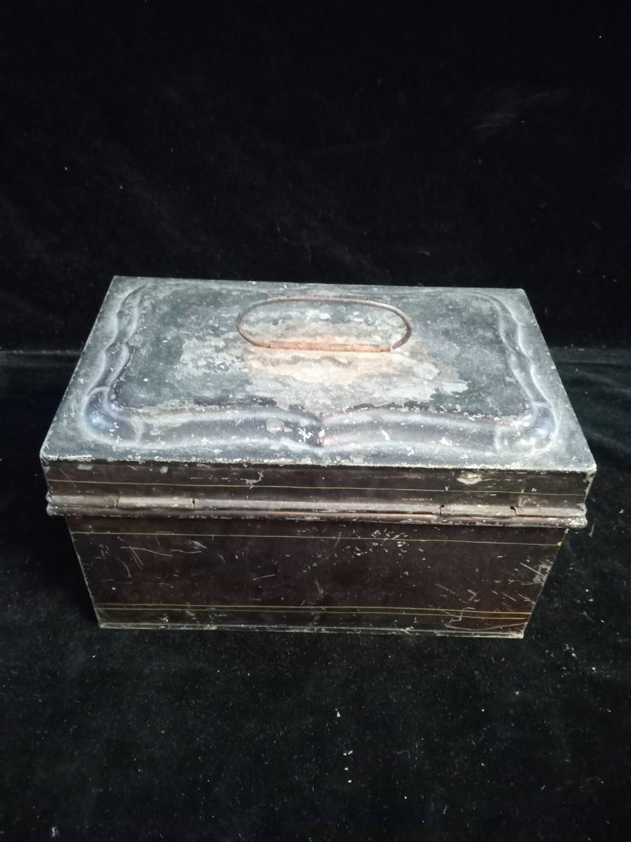 THE TIN HINGED BOX WITH A HANDLE MEASURES 8" X 5" X 5"