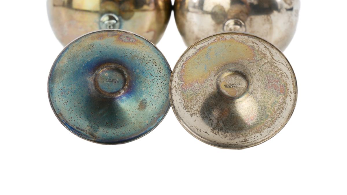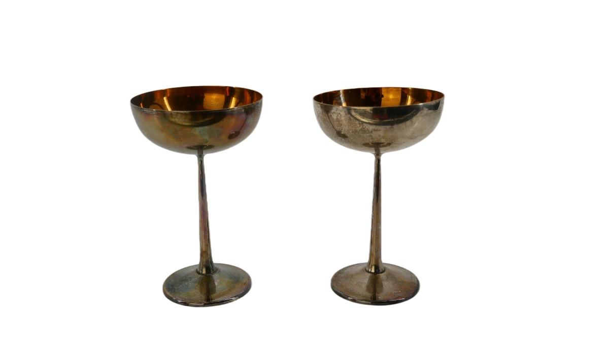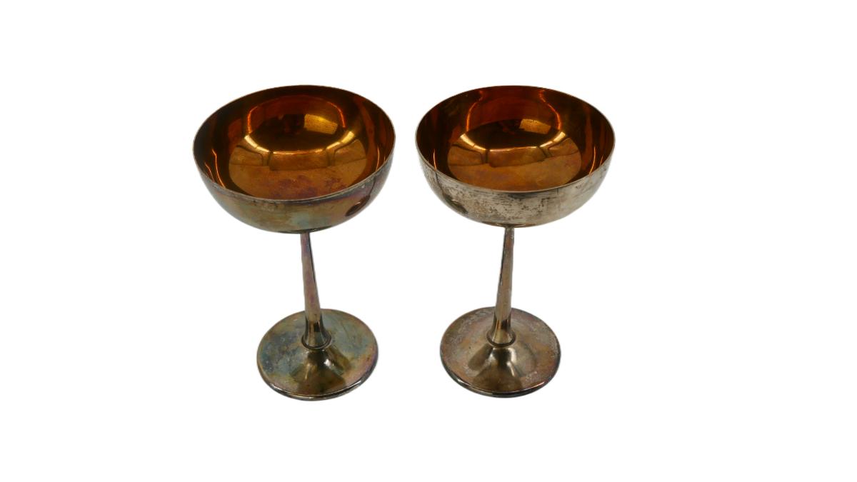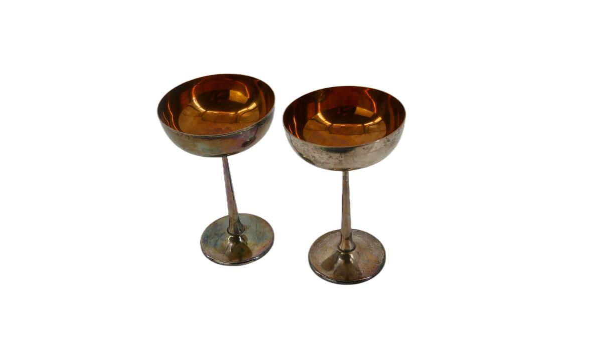 Pair of antique metal goblet/wine cups with maker's mark "Blakinton Since 1865". Late 1800s with beautiful patina and brassy color inside cups. Thought to be wedding chalices. Each measures approximately L 4" x 6". Lot weighs 13 oz. Overall great condition for age of cups. (C12)
