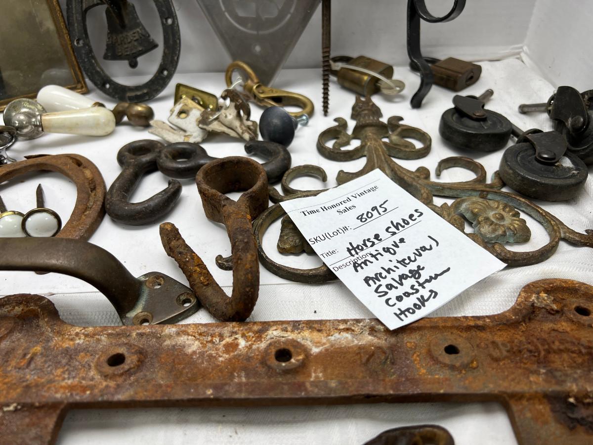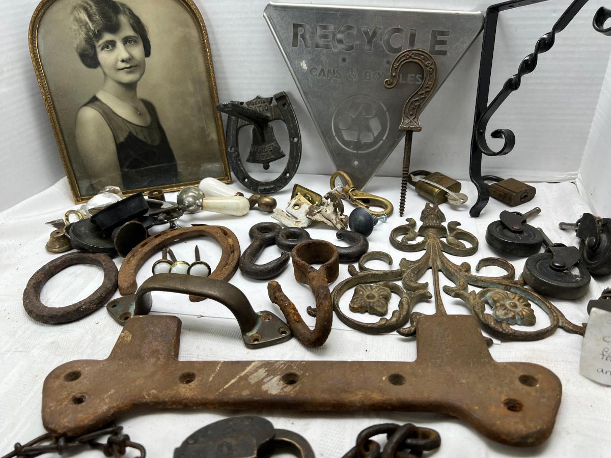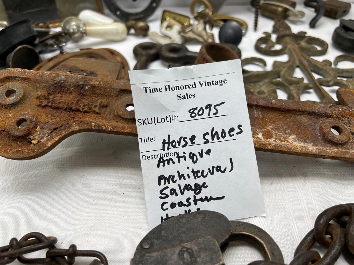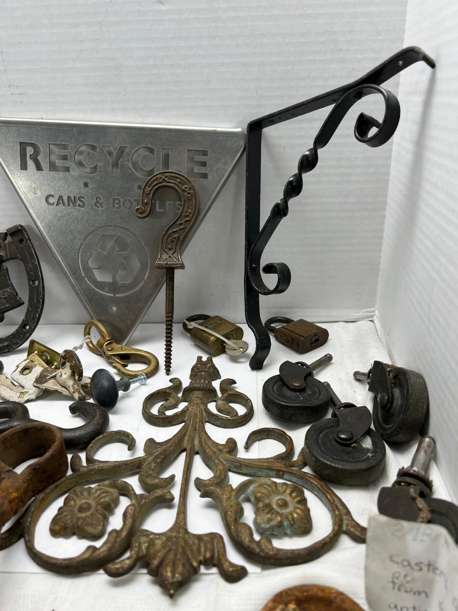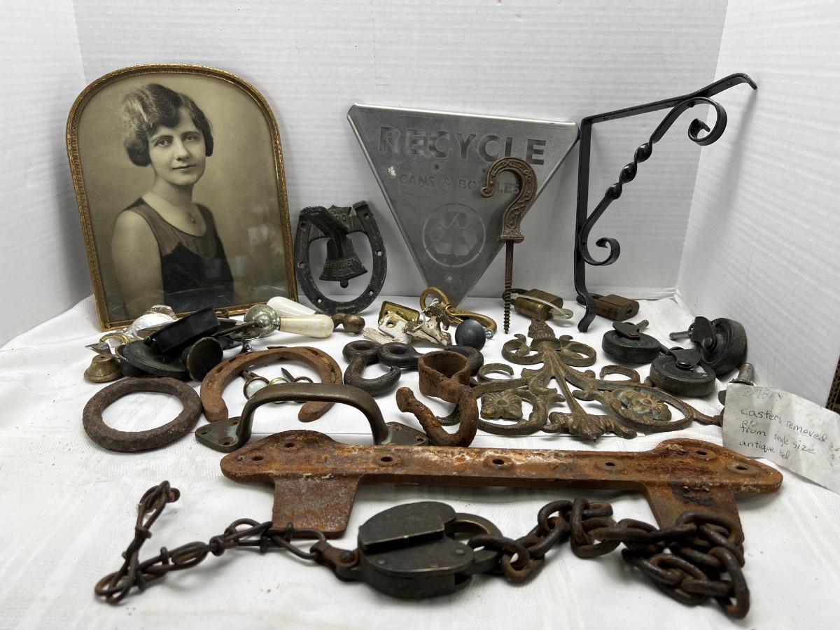 Architectural salvage, lock and key ( some no keys) horse shoes, handles gate hardware, pulleys. Awesome for decor, woodworking art and....Can ship but will be expensive heavy.
