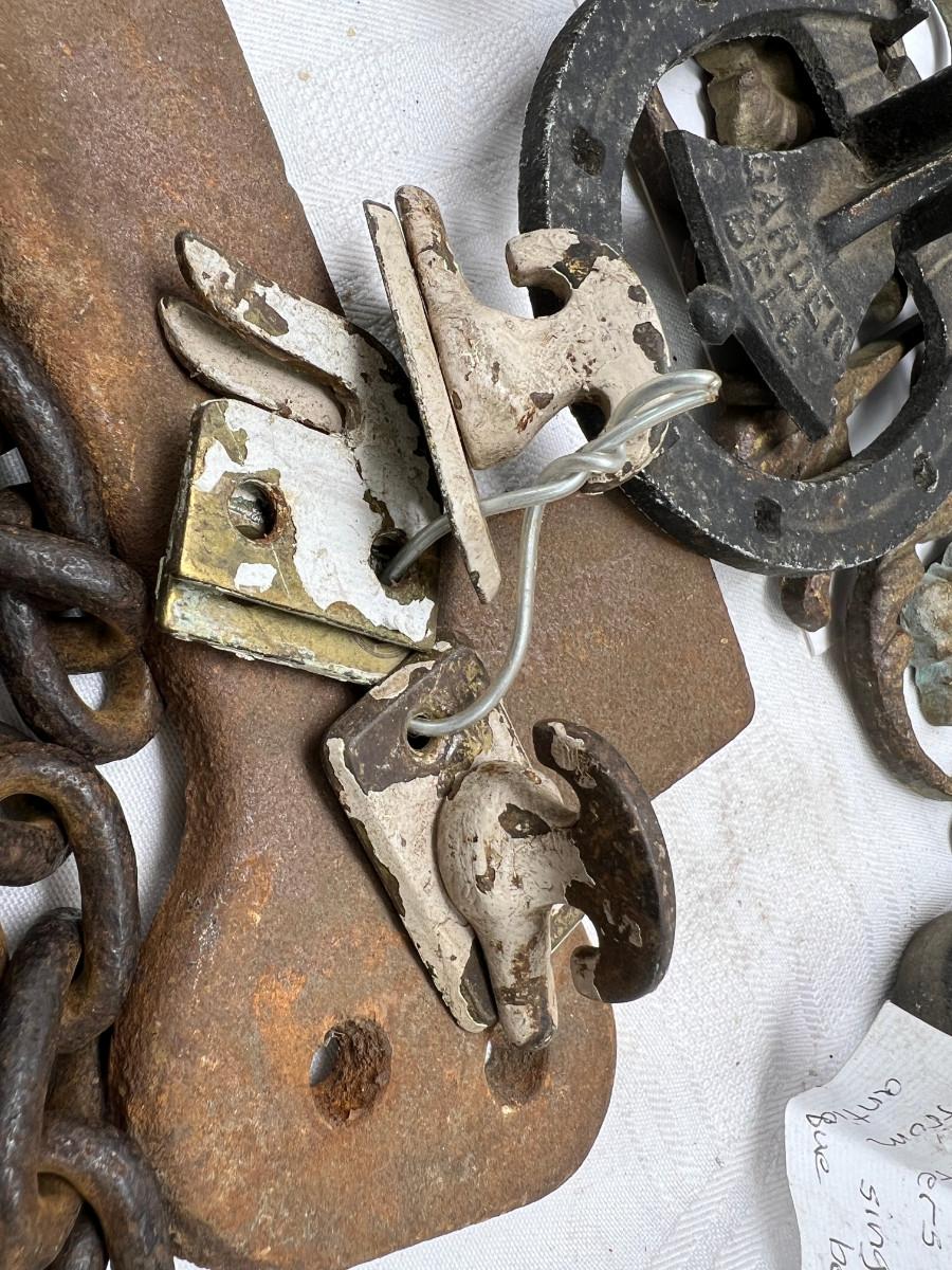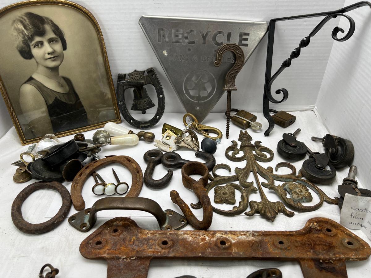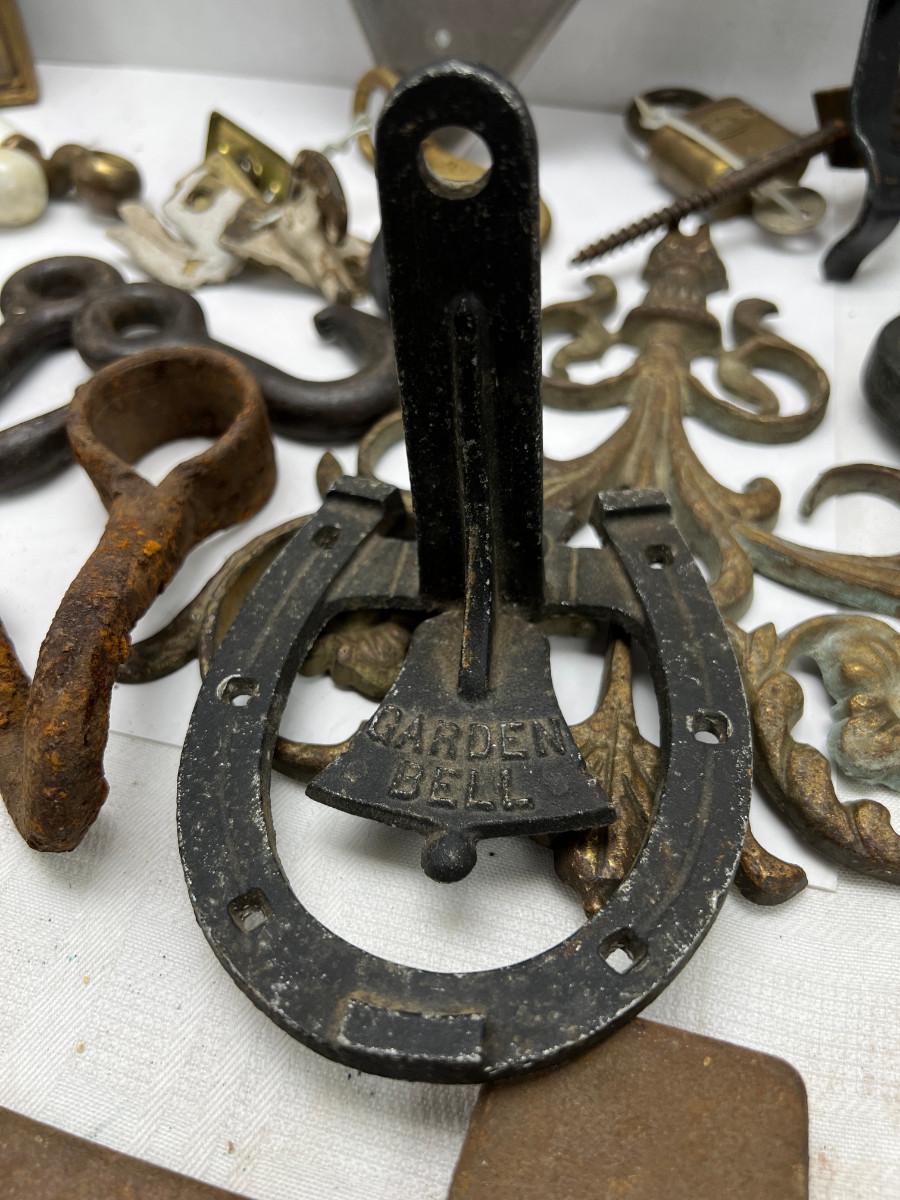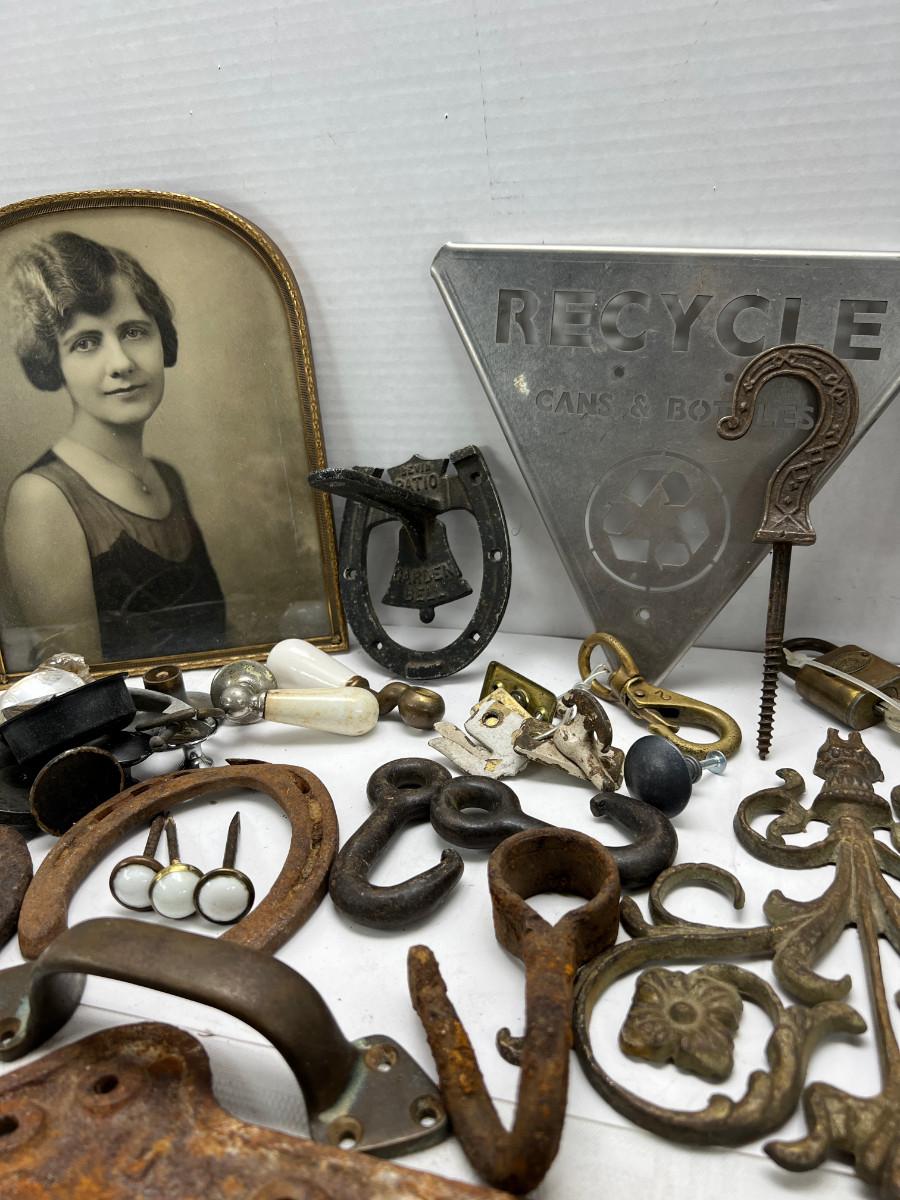 Architectural salvage, lock and key ( some no keys) horse shoes, handles gate hardware, pulleys. Awesome for decor, woodworking art and....Can ship but will be expensive heavy.