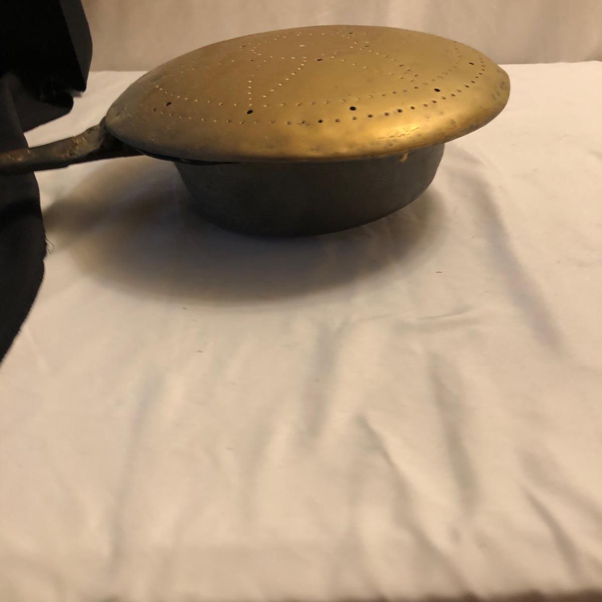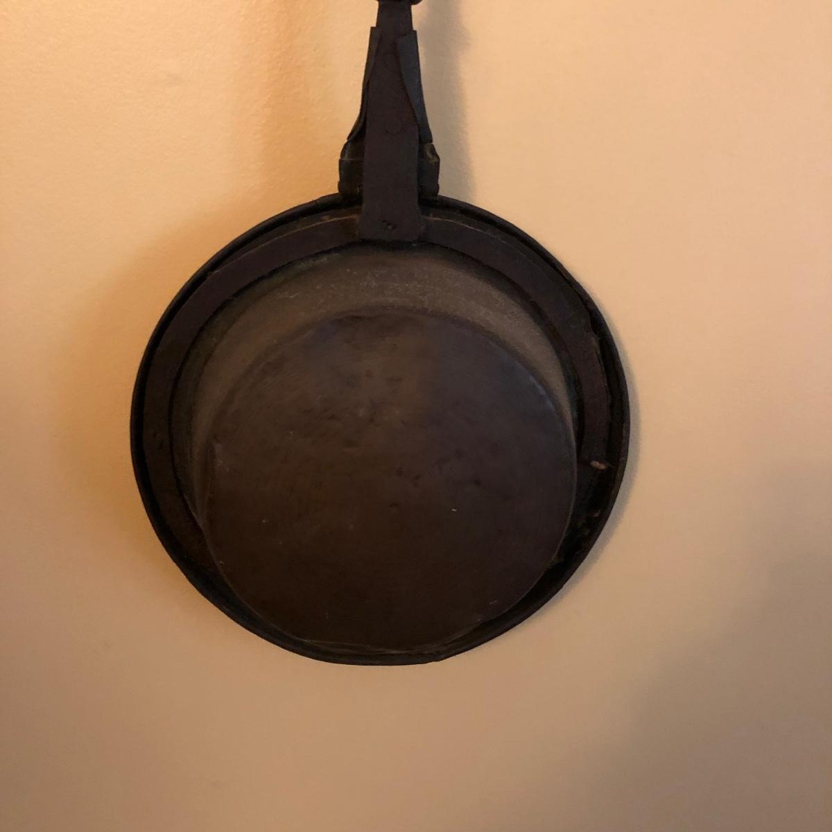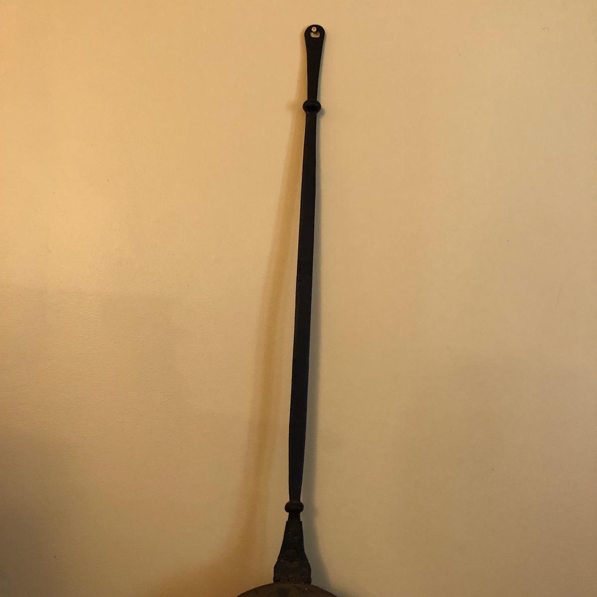 Lot includes a antique metal and iron bed warmer with a brass colored lid. Bed warmer measures 12”D x 3.5” tall and 46” long.