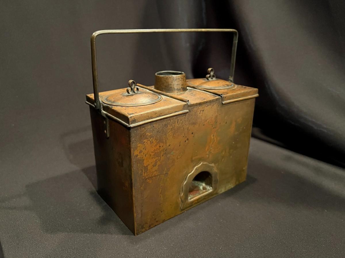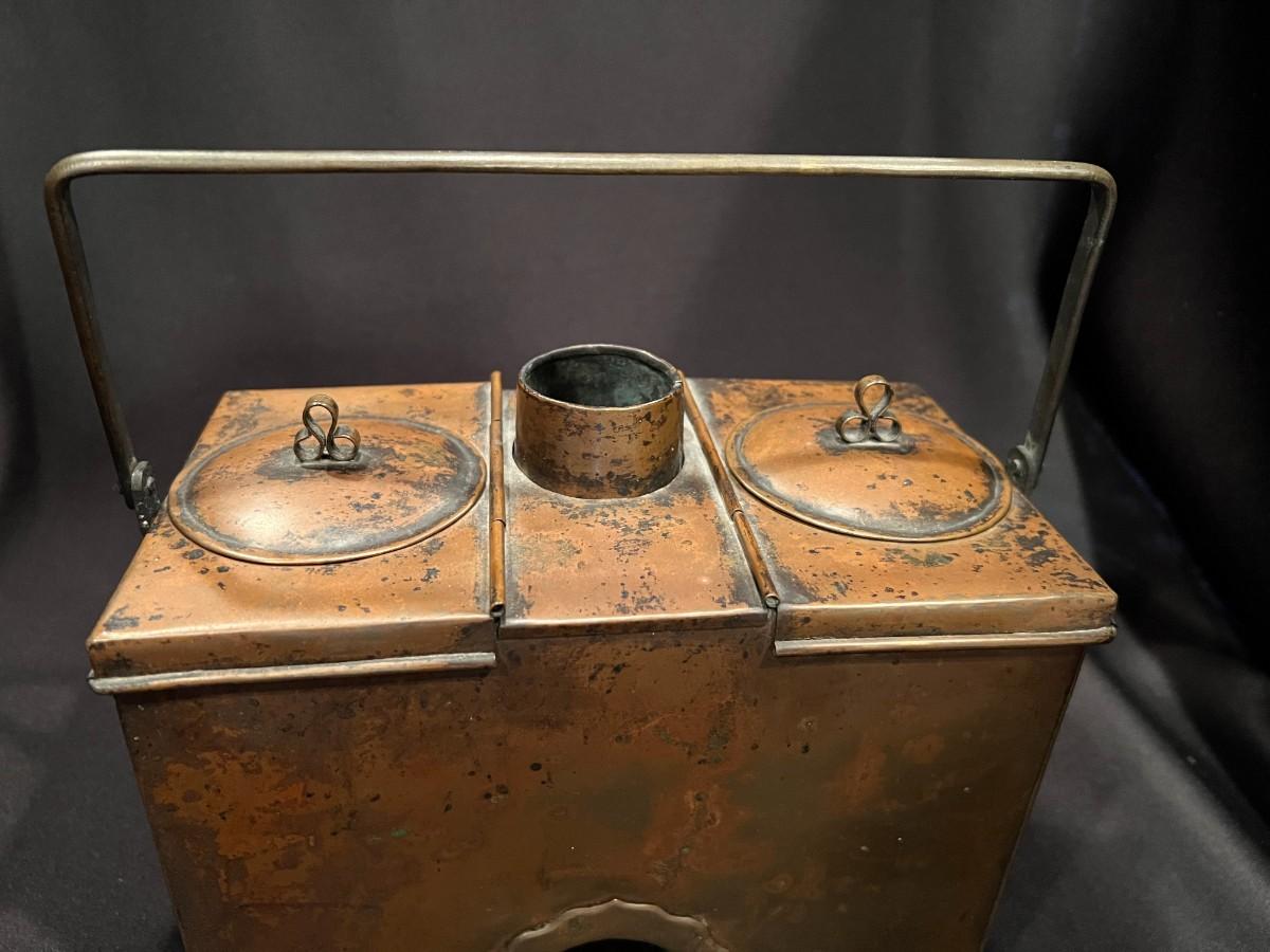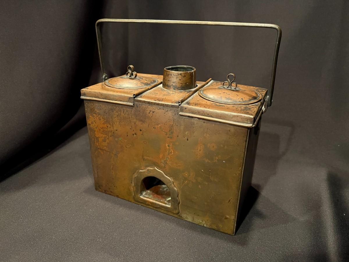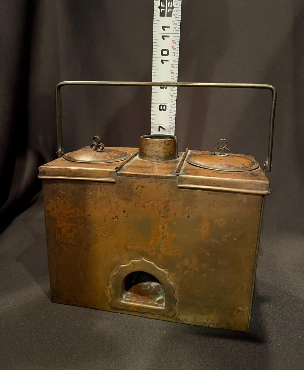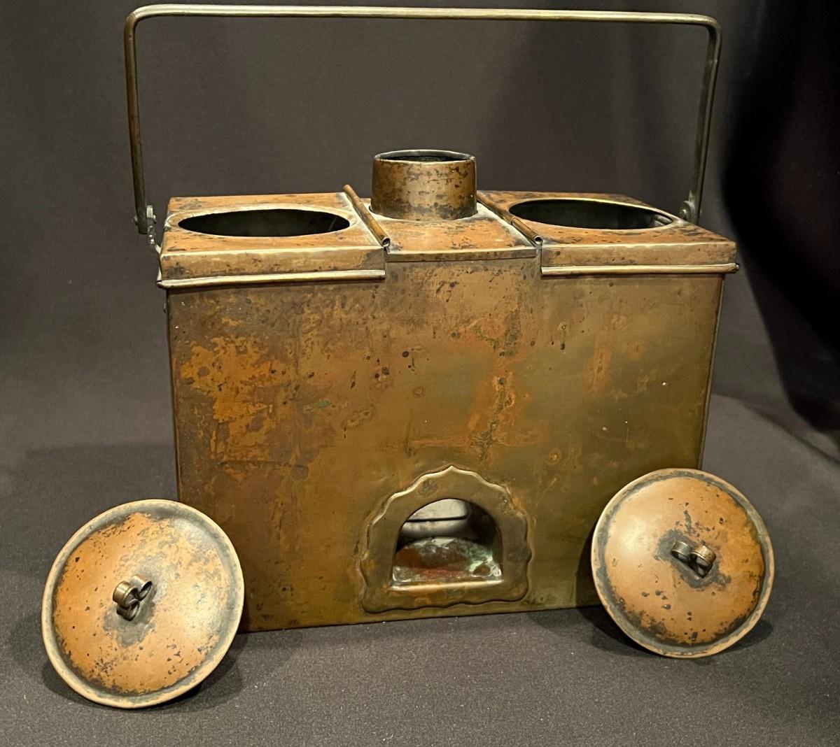 Antique metal Japanese warmer (potentially for Sake) with two lids, a middle chamber to make a fire, and a handle to carry the container. Condition as shown.