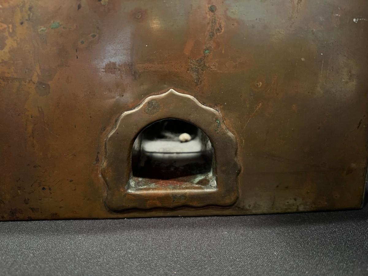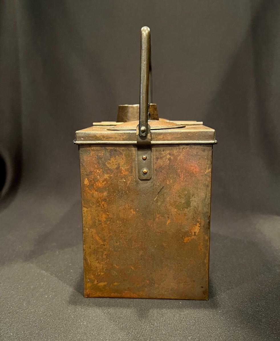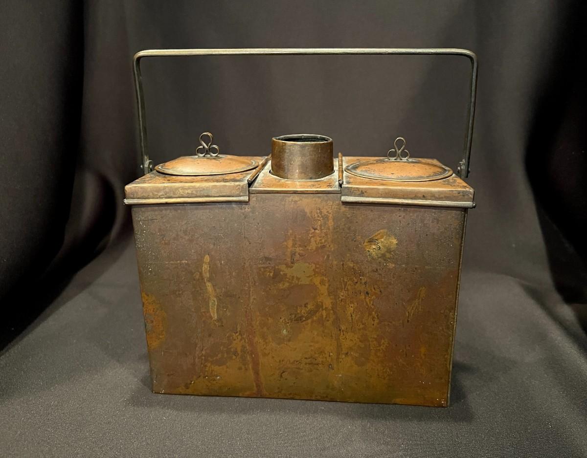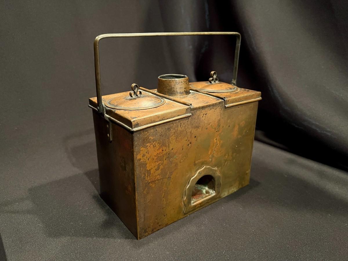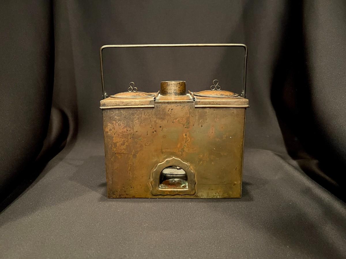 Antique metal Japanese warmer (potentially for Sake) with two lids, a middle chamber to make a fire, and a handle to carry the container. Condition as shown.