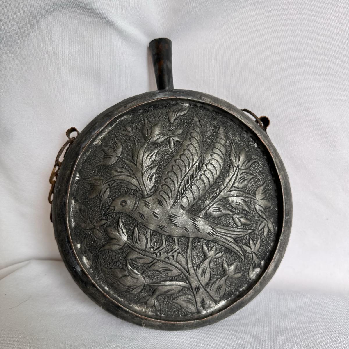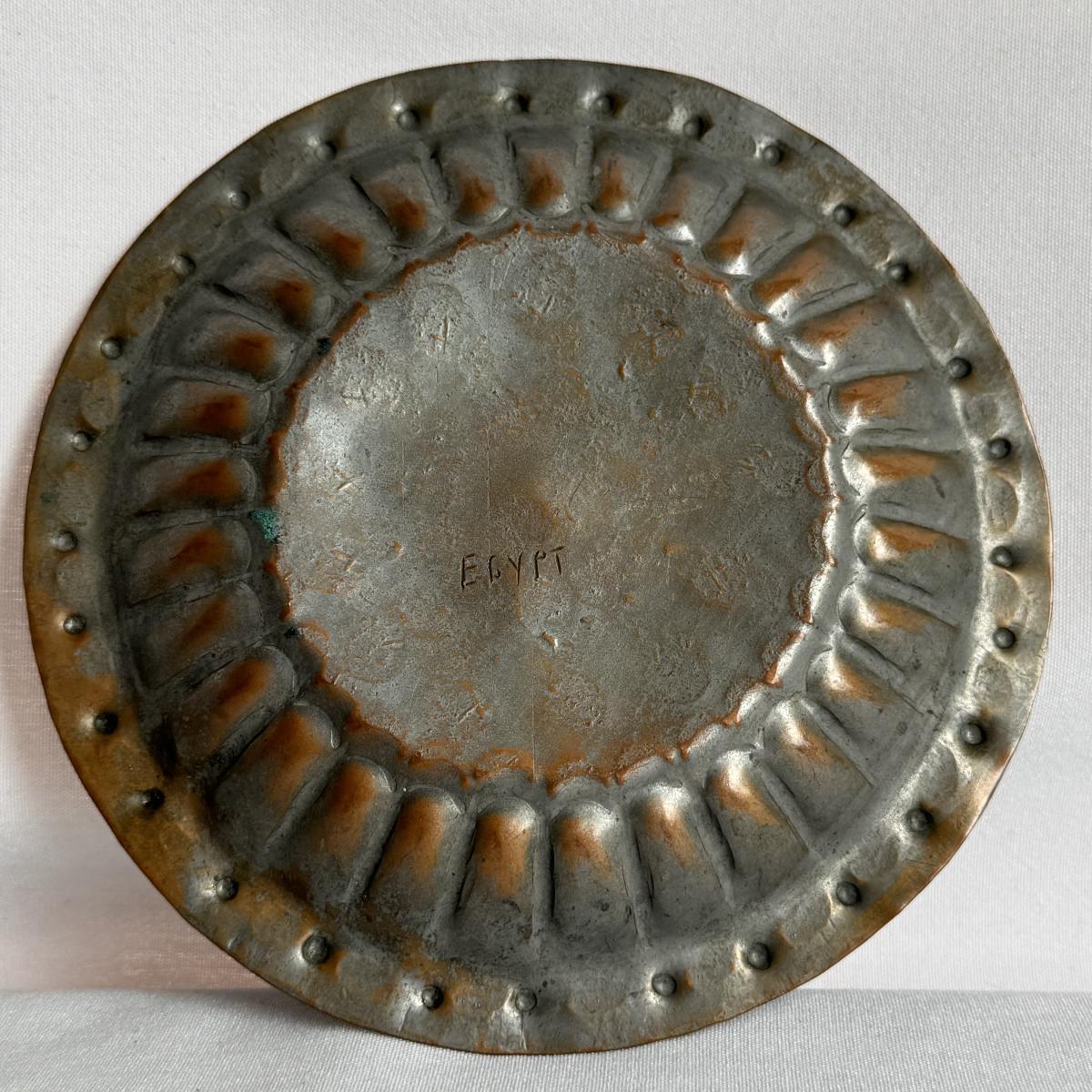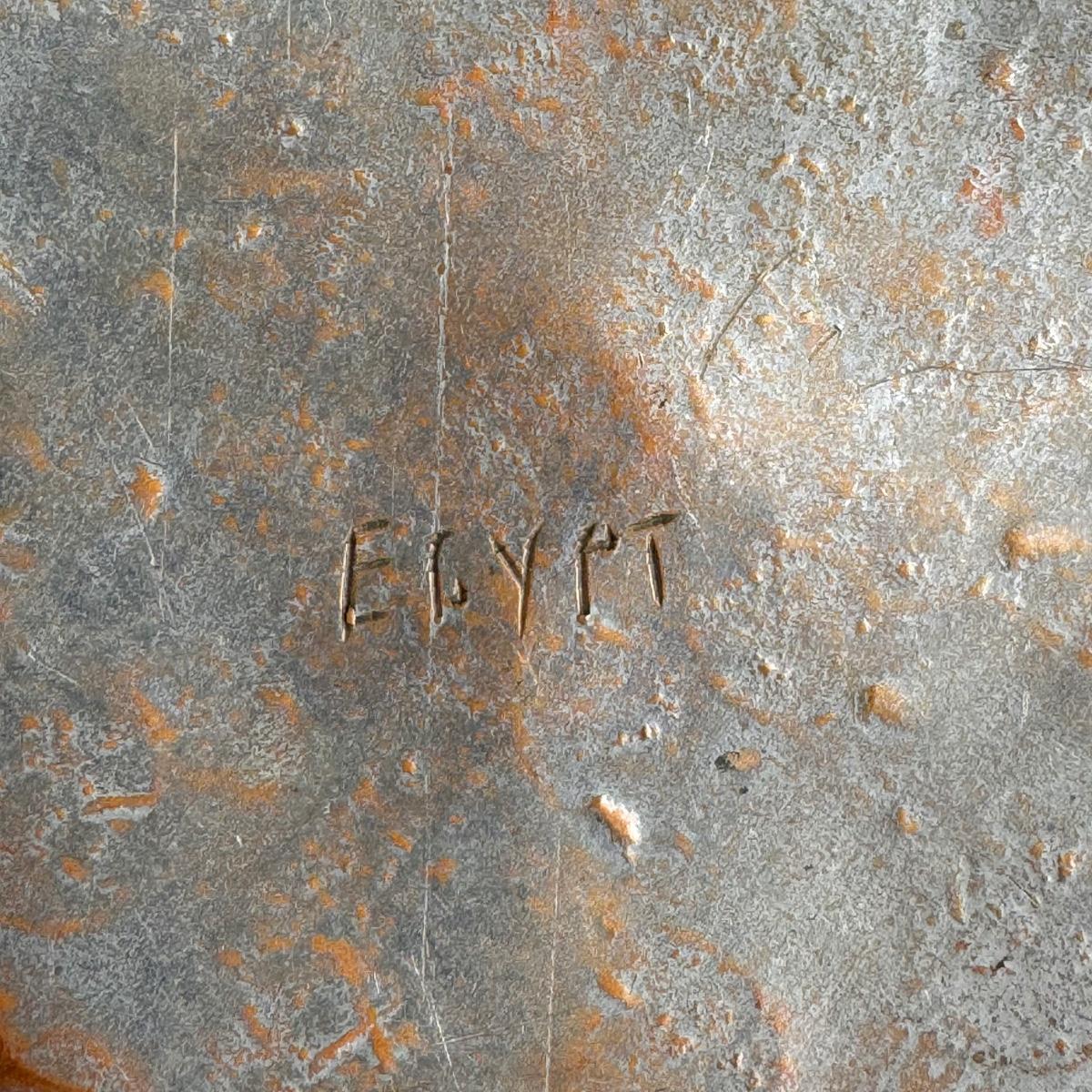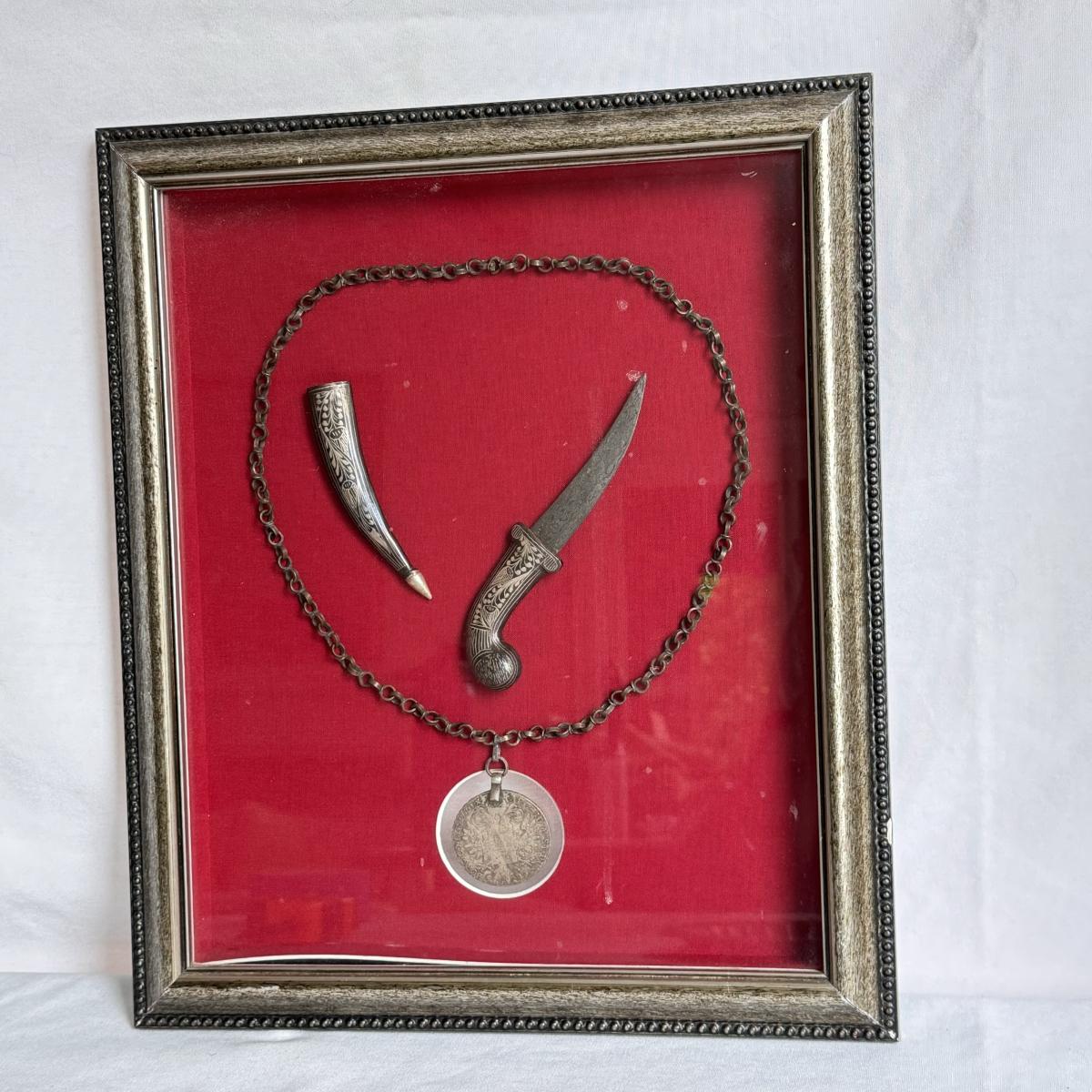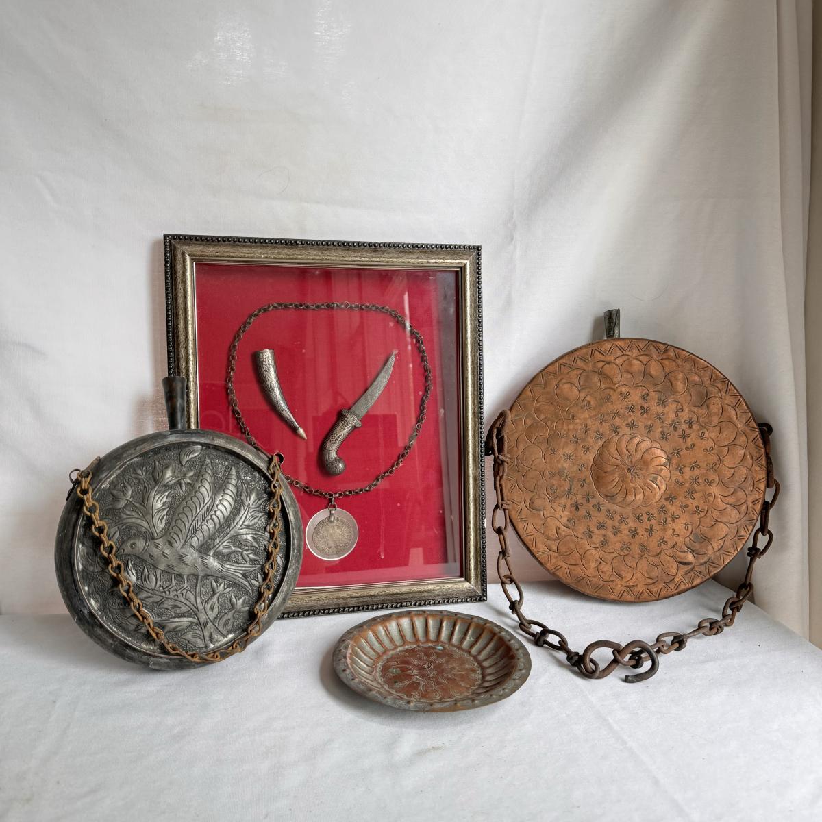 This lot includes two metal and copper water canteens, one trinket dish, and one framed dagger and silver coin on a chain. The trinket dish is engraved with Egypt on the back. The dagger and coin are framed in a wooden frame and under glass. Dagger has the appearance of sterling silver but we cannot access it to determine any markings. The frame measures 12” x 15”H.