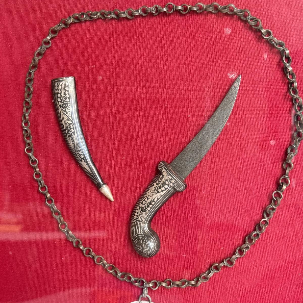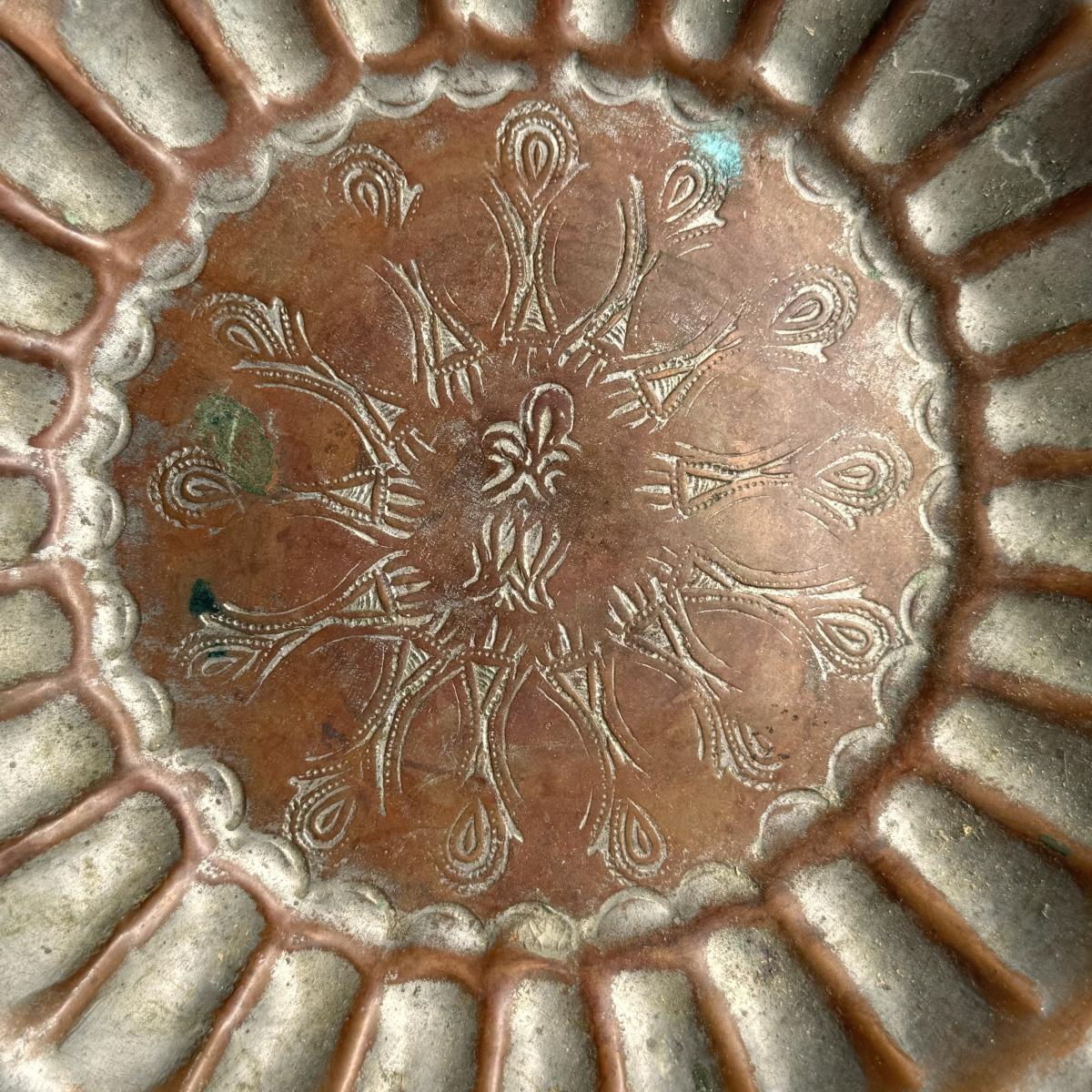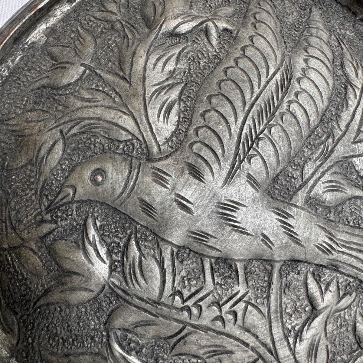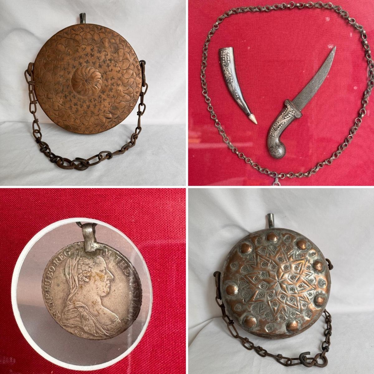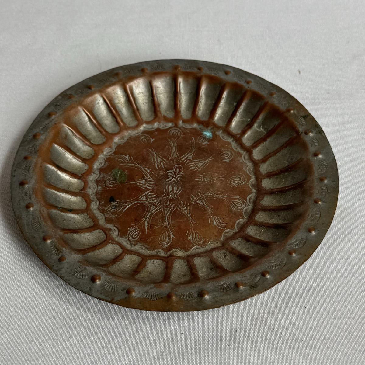 This lot includes two metal and copper water canteens, one trinket dish, and one framed dagger and silver coin on a chain. The trinket dish is engraved with Egypt on the back. The dagger and coin are framed in a wooden frame and under glass. Dagger has the appearance of sterling silver but we cannot access it to determine any markings. The frame measures 12” x 15”H.