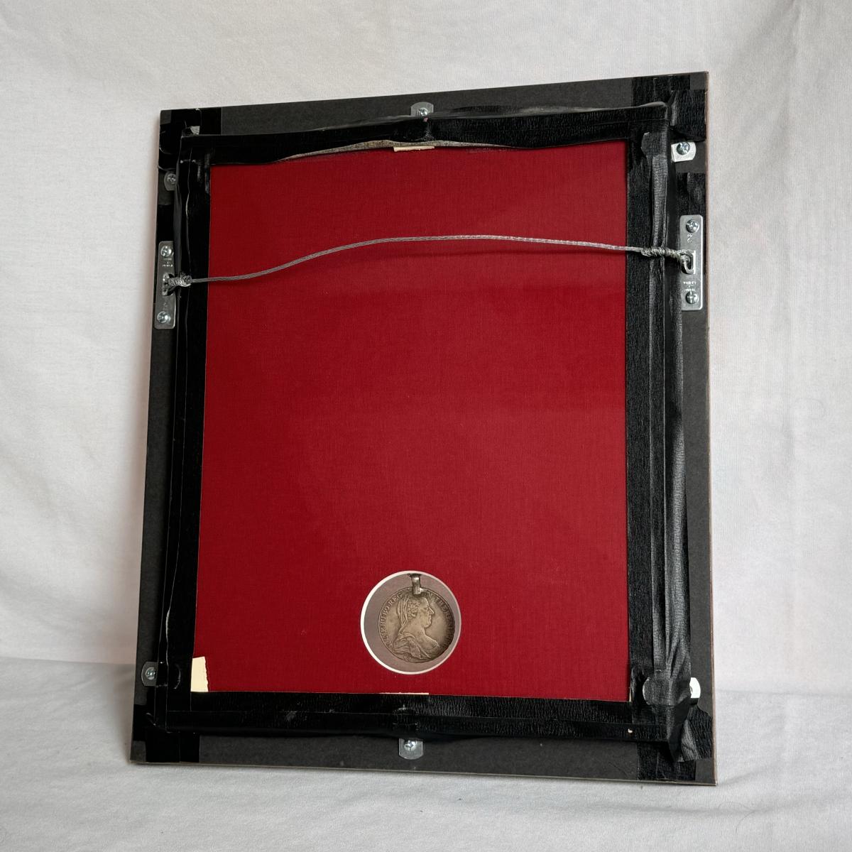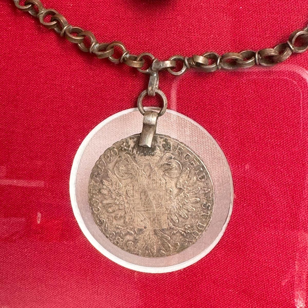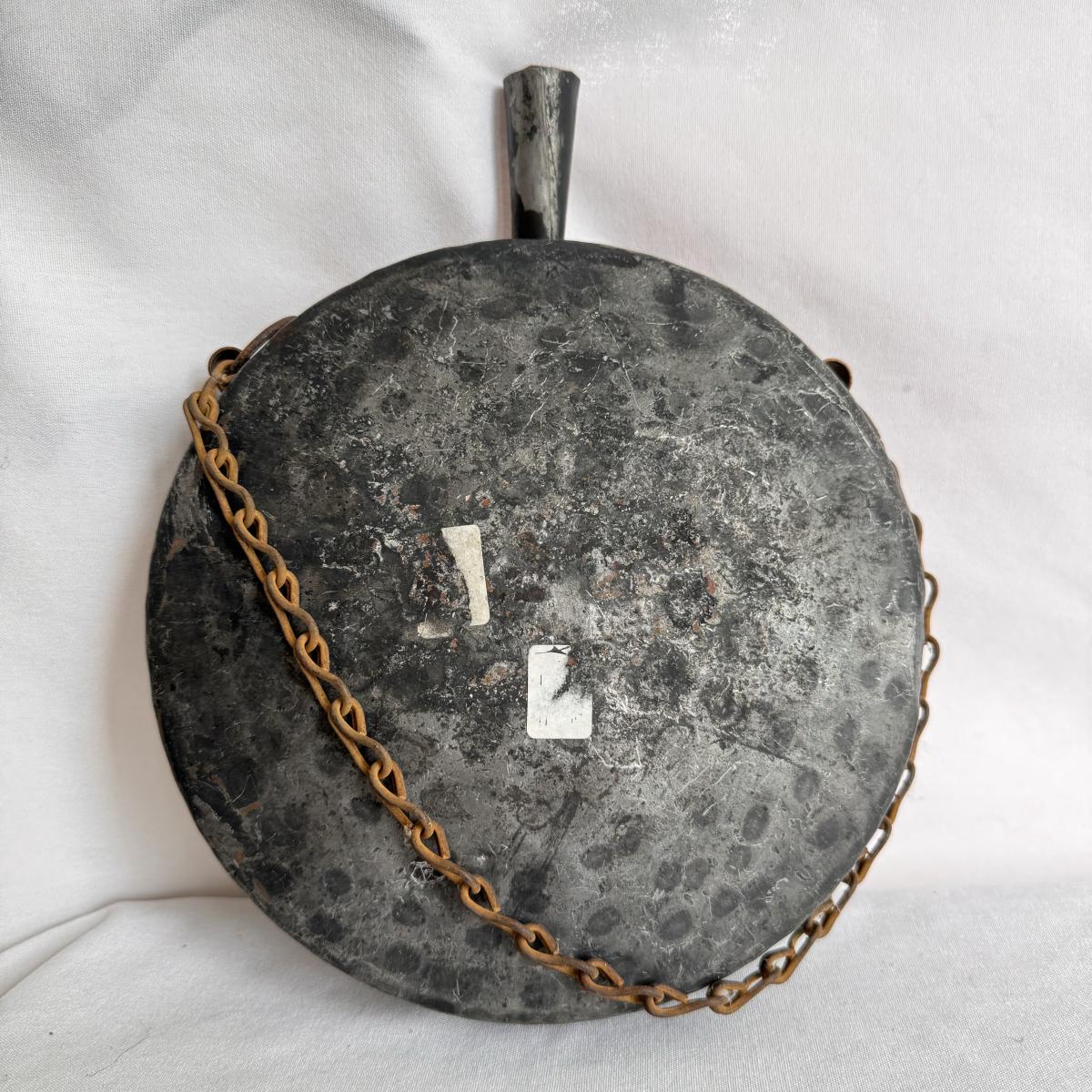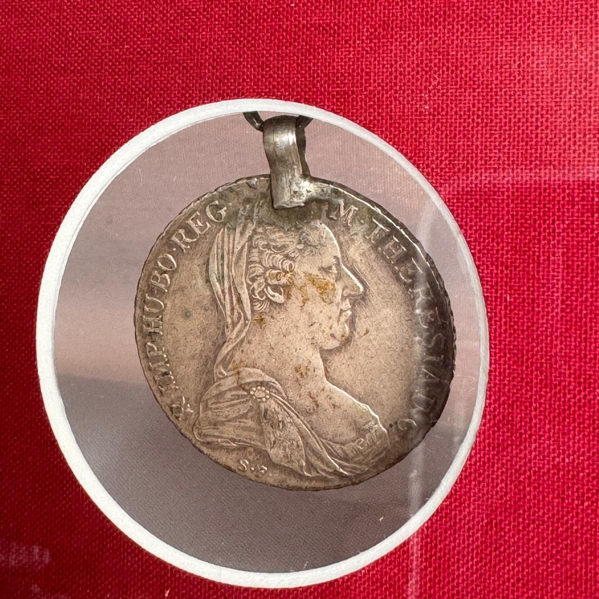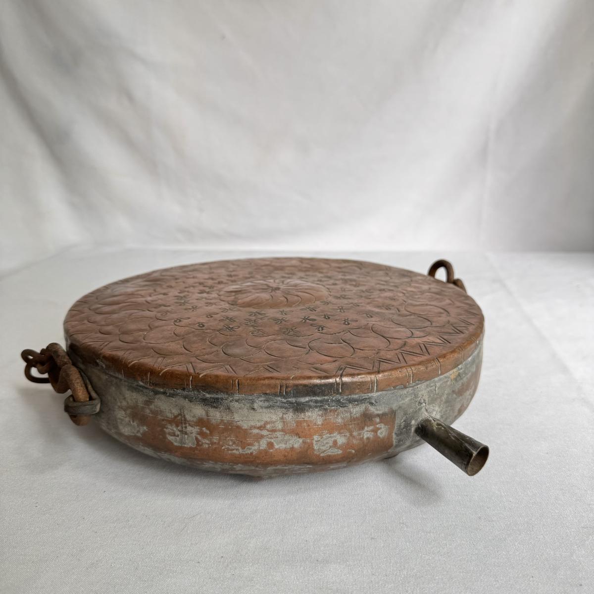 This lot includes two metal and copper water canteens, one trinket dish, and one framed dagger and silver coin on a chain. The trinket dish is engraved with Egypt on the back. The dagger and coin are framed in a wooden frame and under glass. Dagger has the appearance of sterling silver but we cannot access it to determine any markings. The frame measures 12” x 15”H.