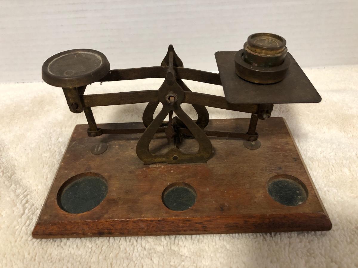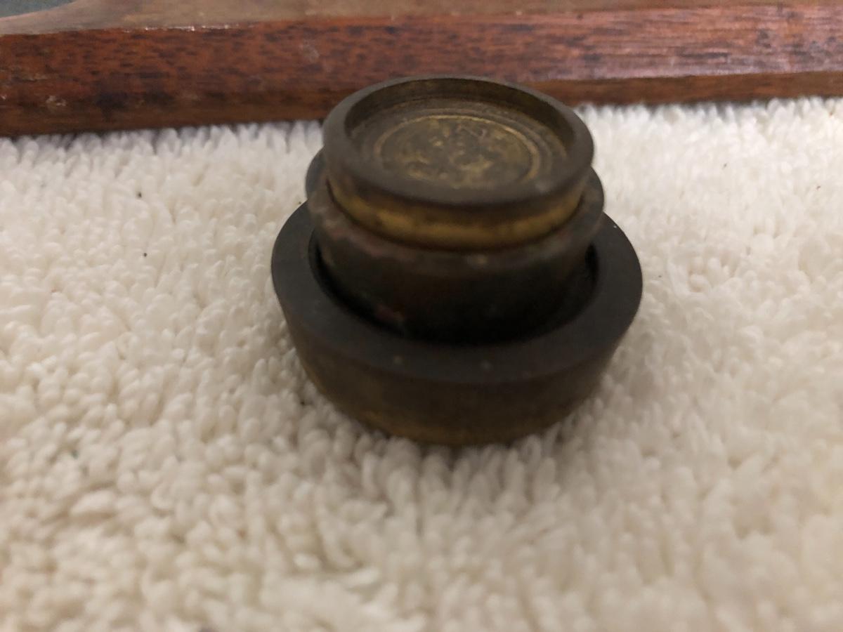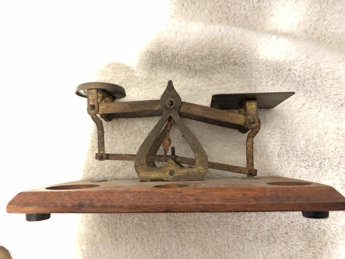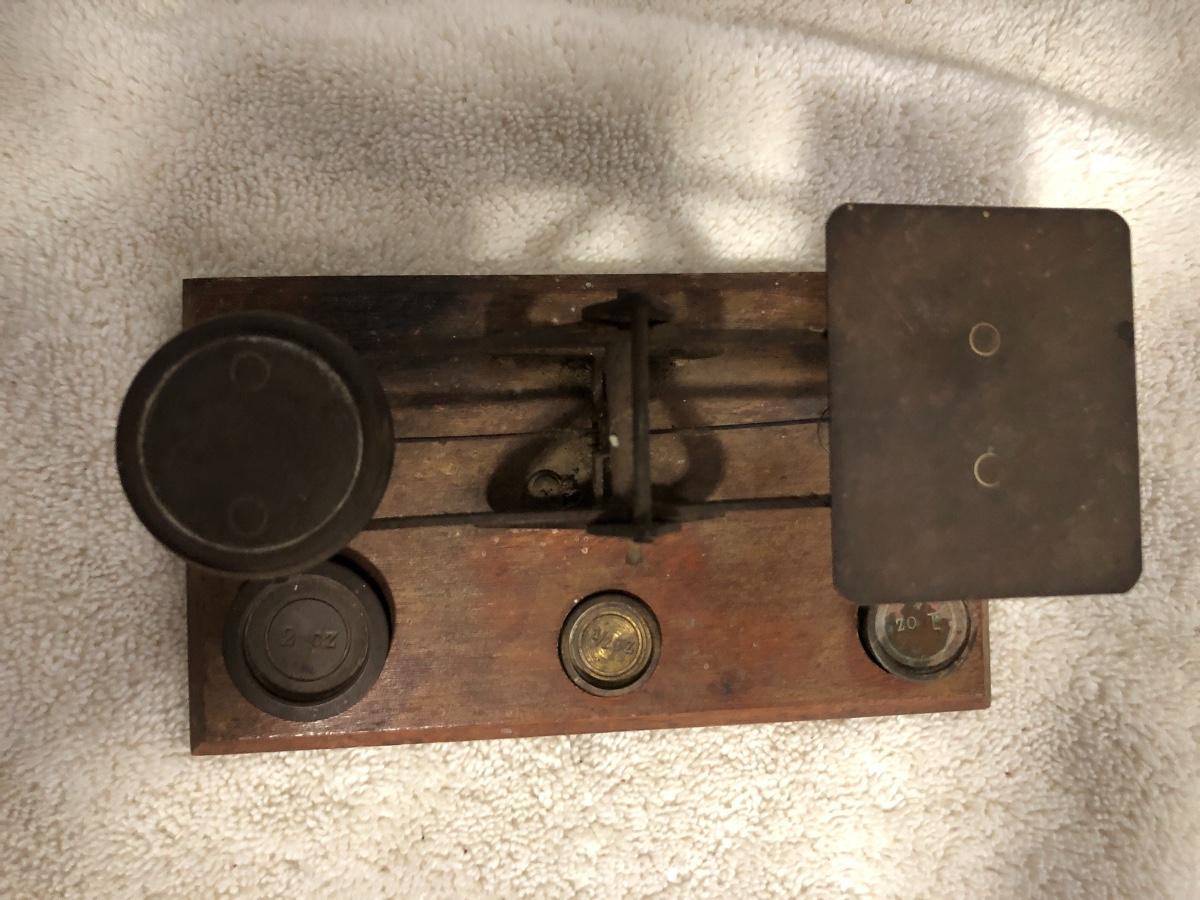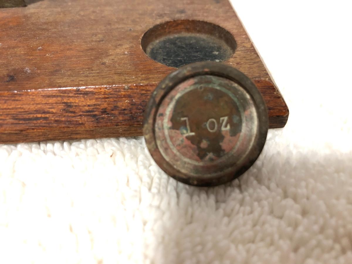 All items are sold as is, as found in the estate. Please see all photos for content, measurements and condition. This is made of wood and metal. The weights are: 1/2 oz, 1 oz, & 2 oz.